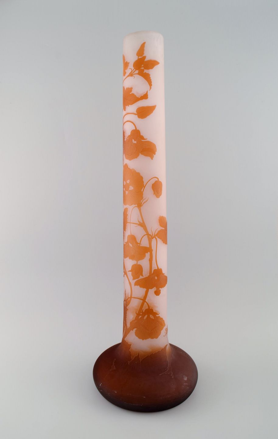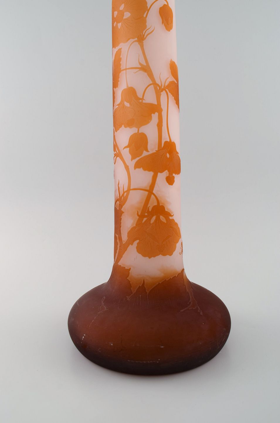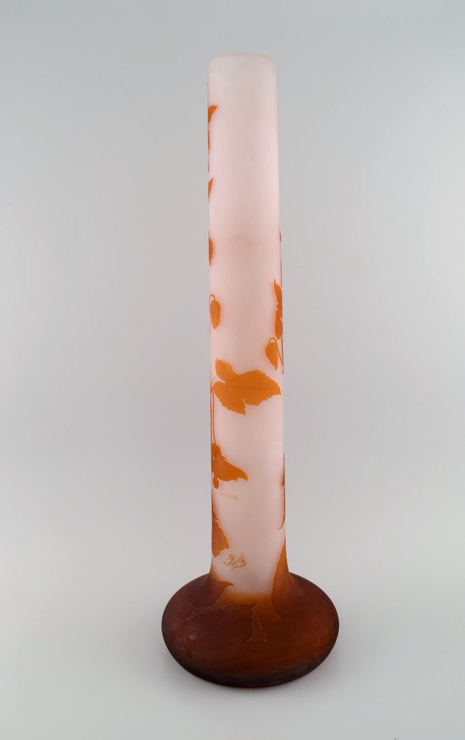 Kolossal antik Emile Gallé vase i matteret kunstglas med orange overfang udskåret i form af blomster og bladværk. Tidligt 1900-tallet. Museumskvalitet. Måler: 61 x 19 cm. I flot stand. Signeret.