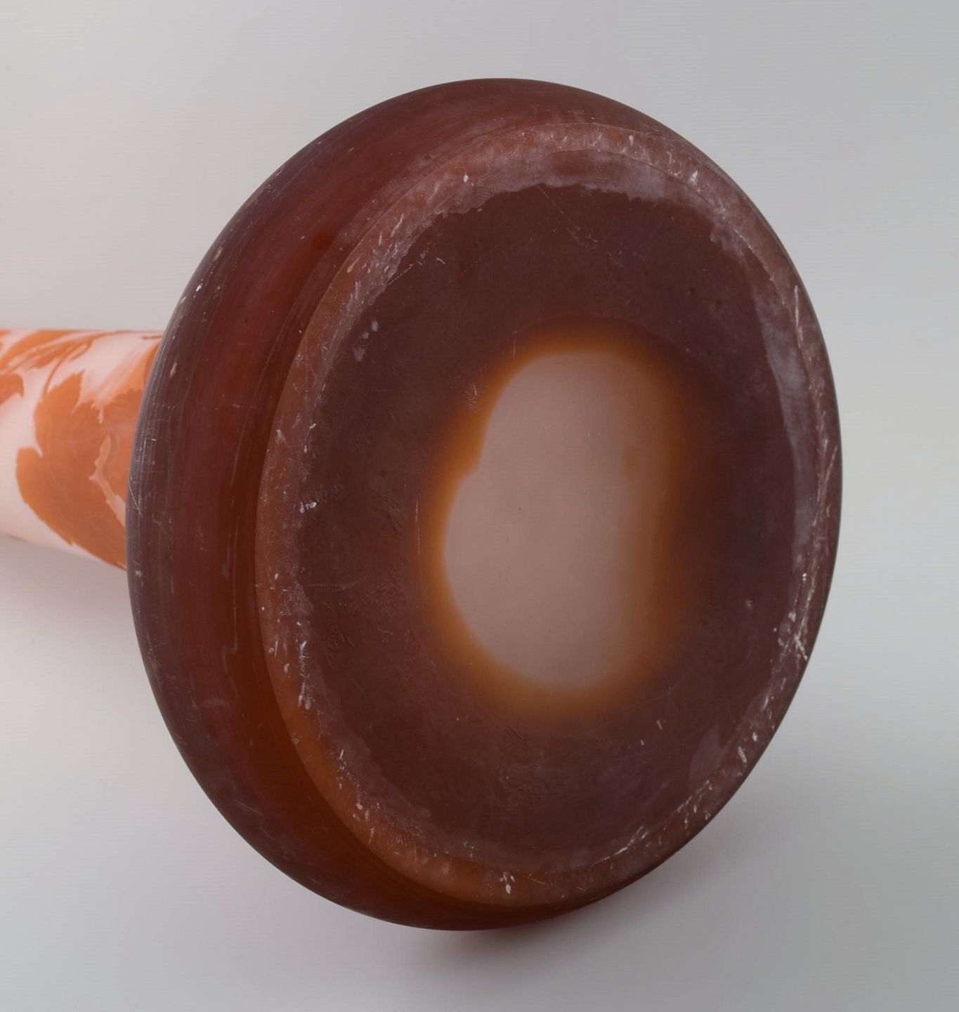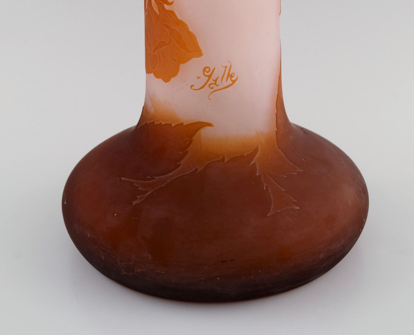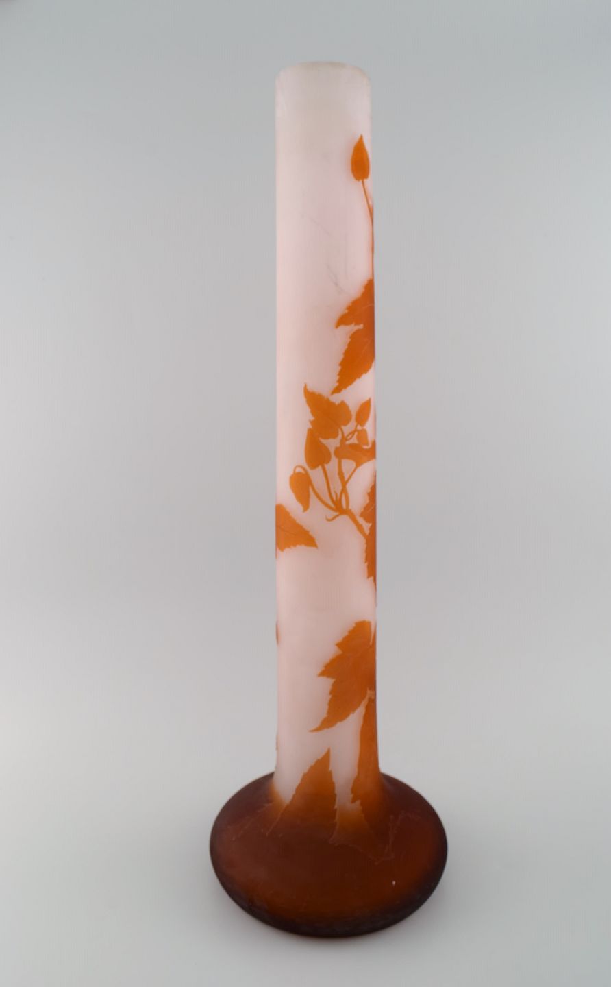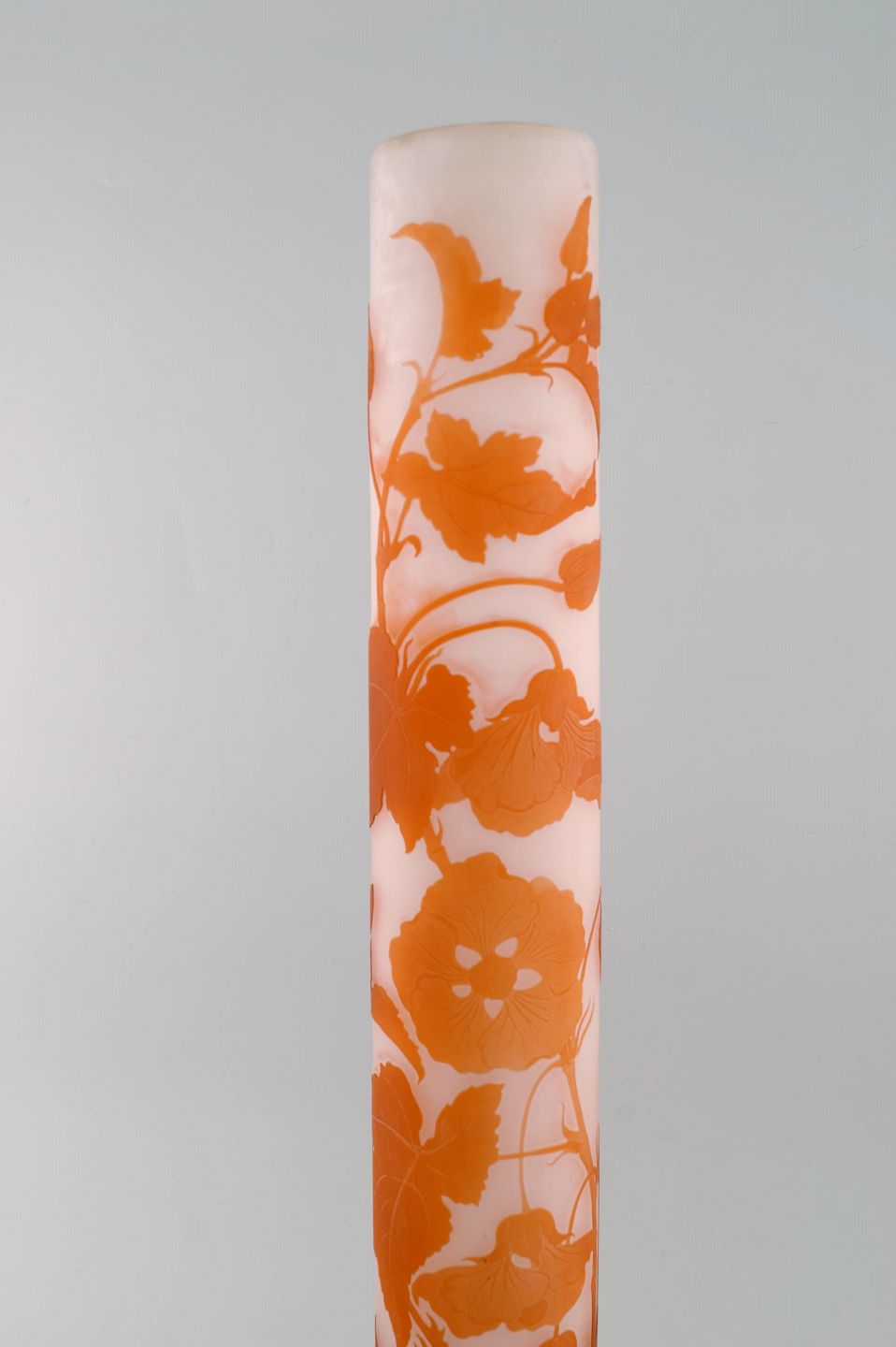 Kolossal antik Emile Gallé vase i matteret kunstglas med orange overfang udskåret i form af blomster og bladværk. Tidligt 1900-tallet. Museumskvalitet. Måler: 61 x 19 cm. I flot stand. Signeret.
