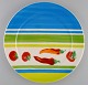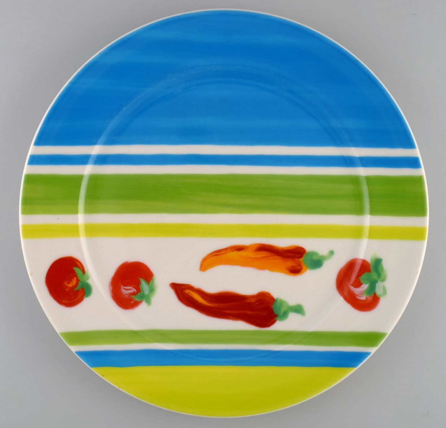 Rosenthal Designers Guild. Orchard Collection. Three large porcelain cover plates. Striped design, tomatoes and chillies. Late 20th century.