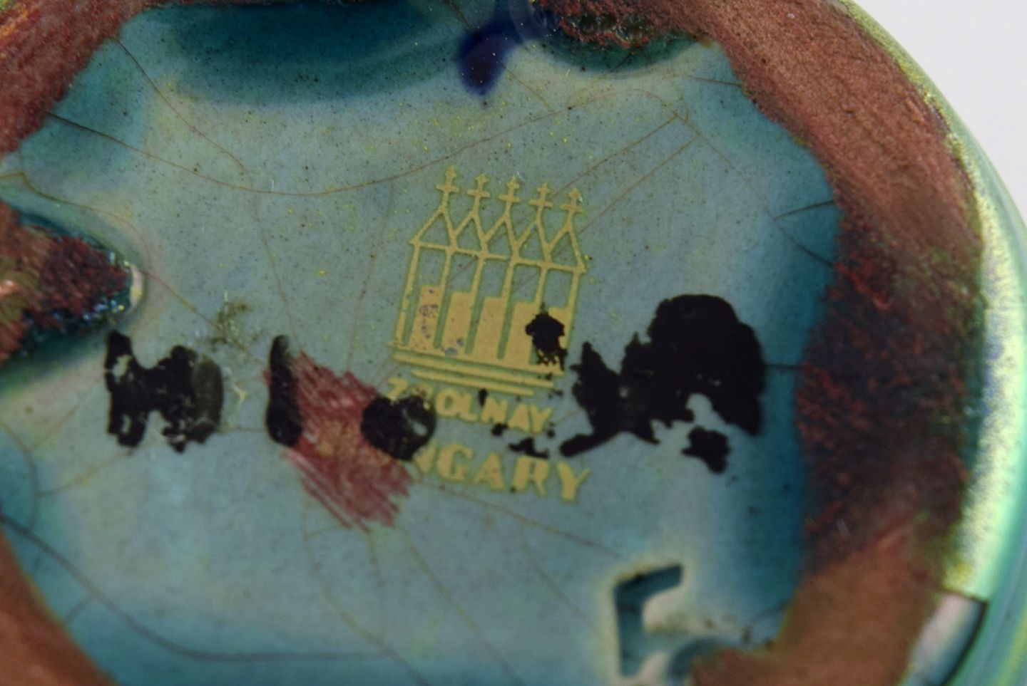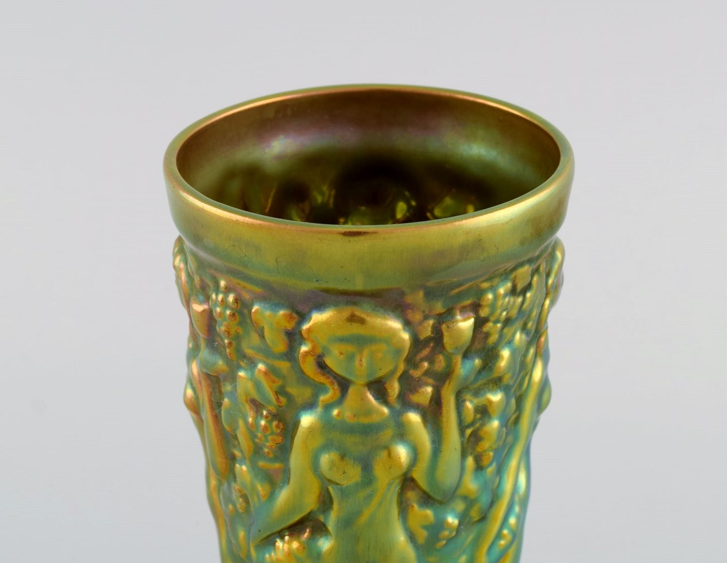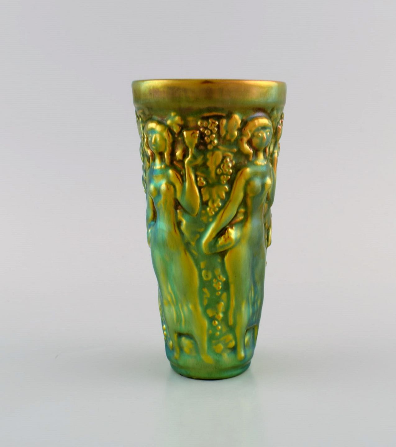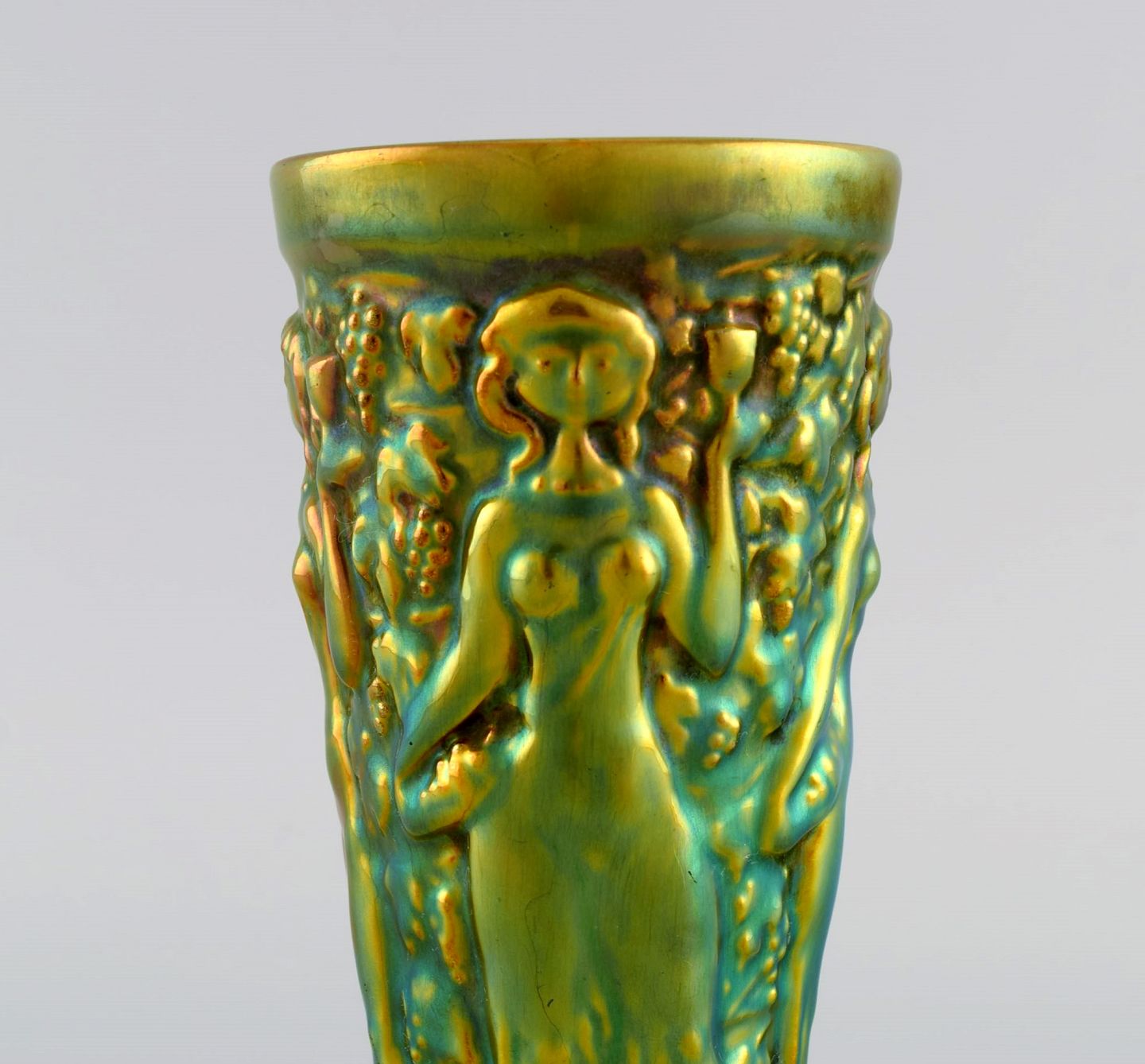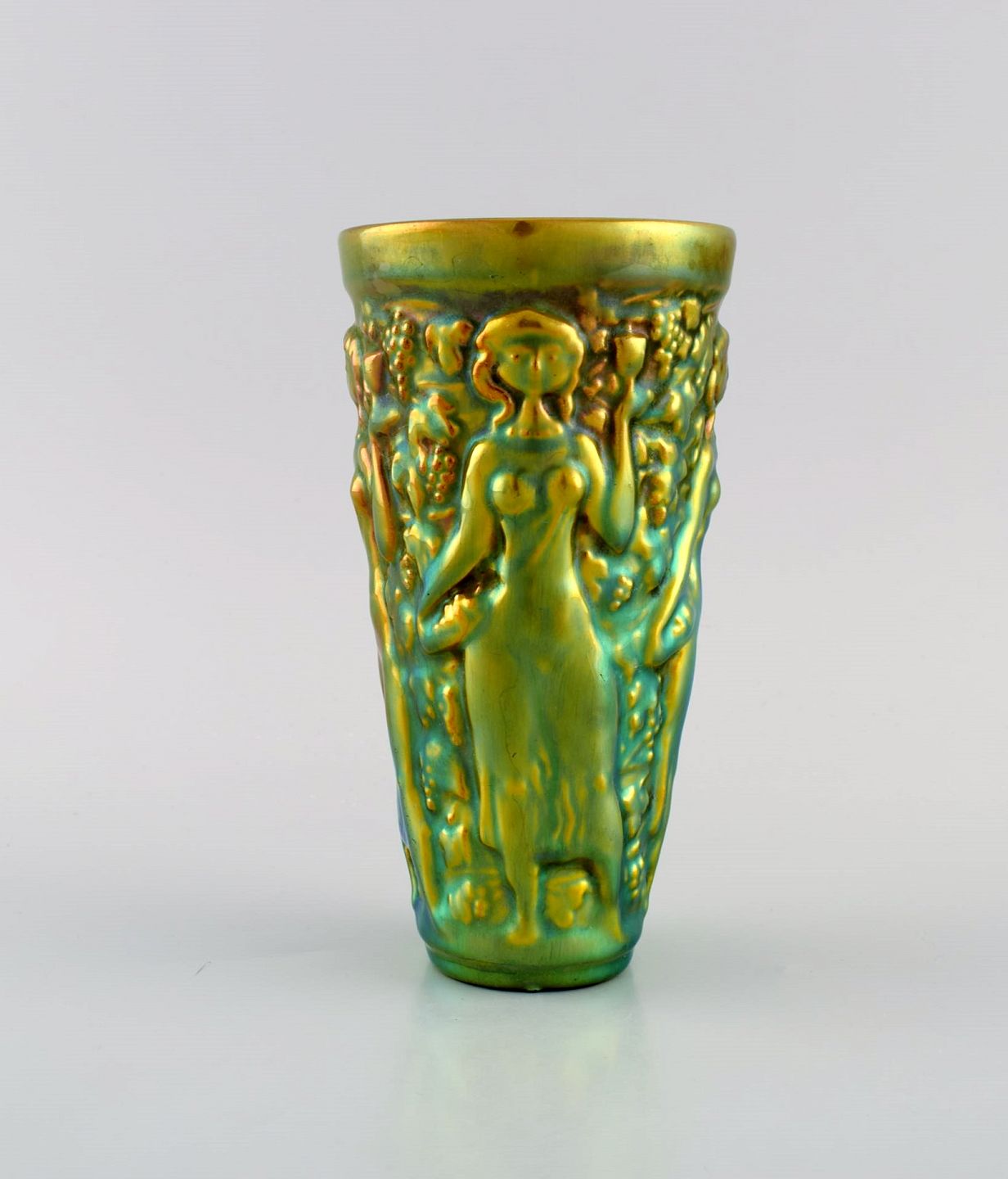 Zsolnay vase i glaseret keramik modelleret med kvinder der plukker druer. Smuk lustreglasur. Midt 1900-tallet. Måler: 16,7 x 9 cm. I flot stand. Stemplet.