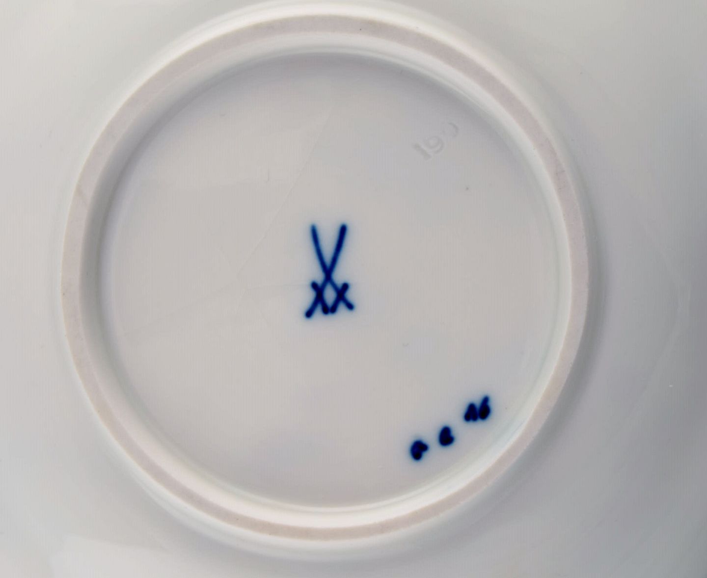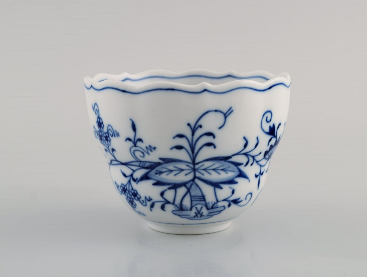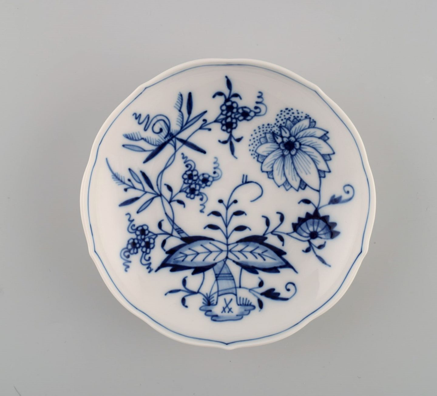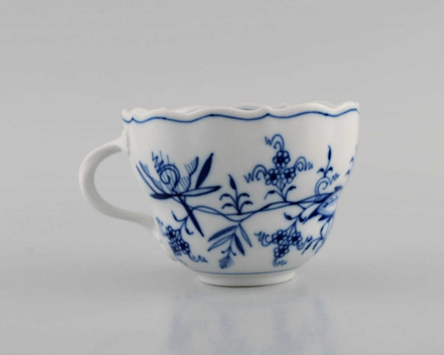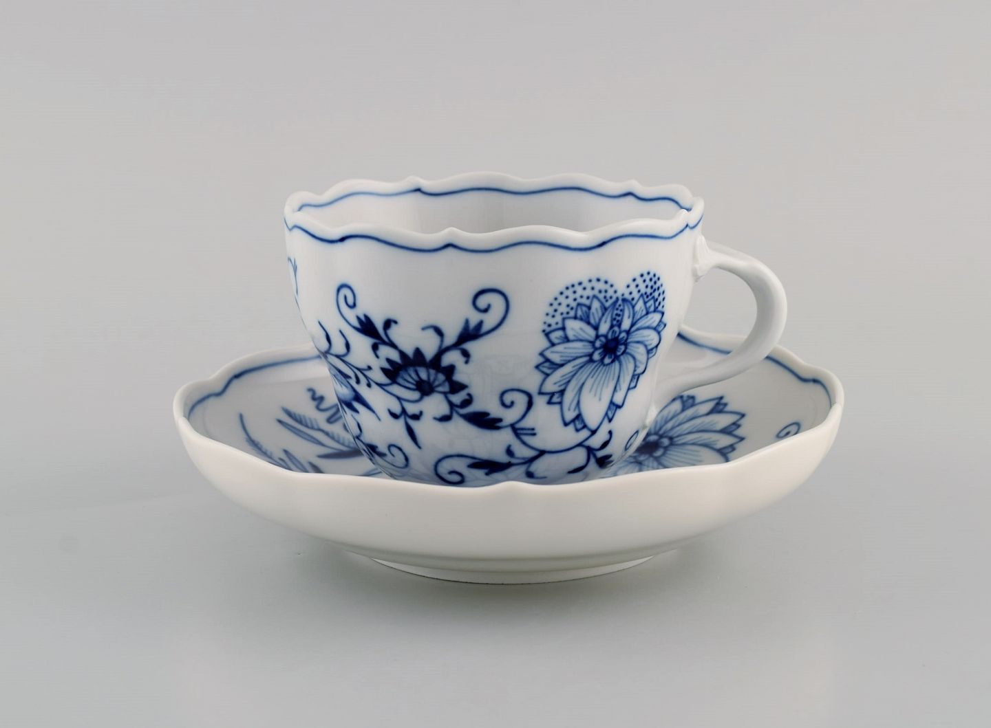 Fem Meissen Løgmønstret kaffekopper med underkopper i håndmalet porcelæn. Tidligt 1900-tallet. Koppen måler: 8,8 x 6,5 cm. Underkop diameter: 14 cm. I flot stand. Stemplet. 1. Sortering.