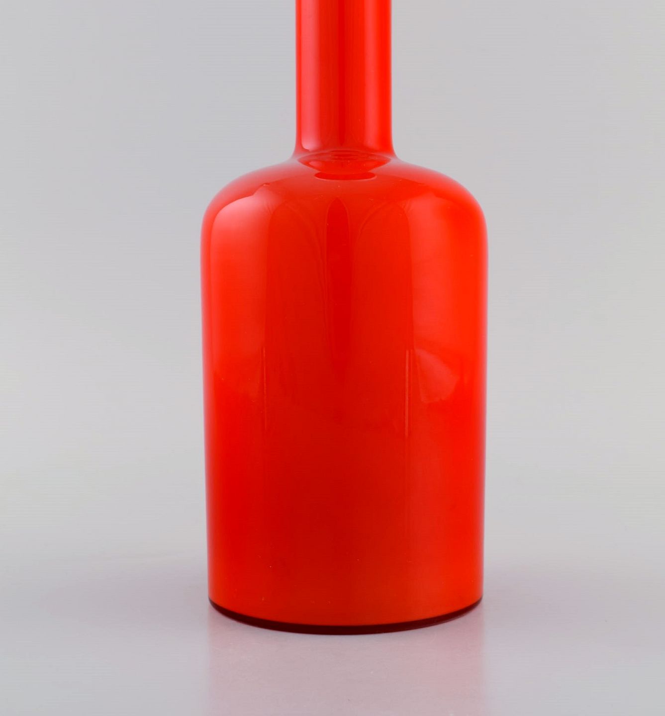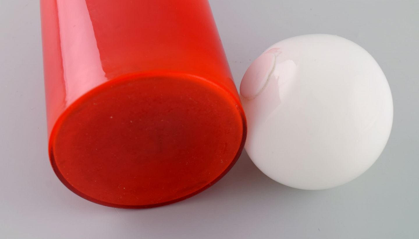 Otto Brauer for Holmegaard. Vase/flaske i rødt mundblæst kunstglas med hvid kugle. 1960'erne.