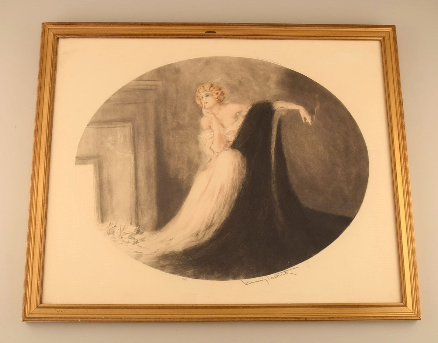 Louis Icart (1888-1950). Radering på papir. "Sapho". Dateret 1929. Lysmål: 51 x 40 cm. Totalmål: 59,5 x 47,5 cm. Rammen måler: 3 cm. I flot stand. Signeret med blyant.