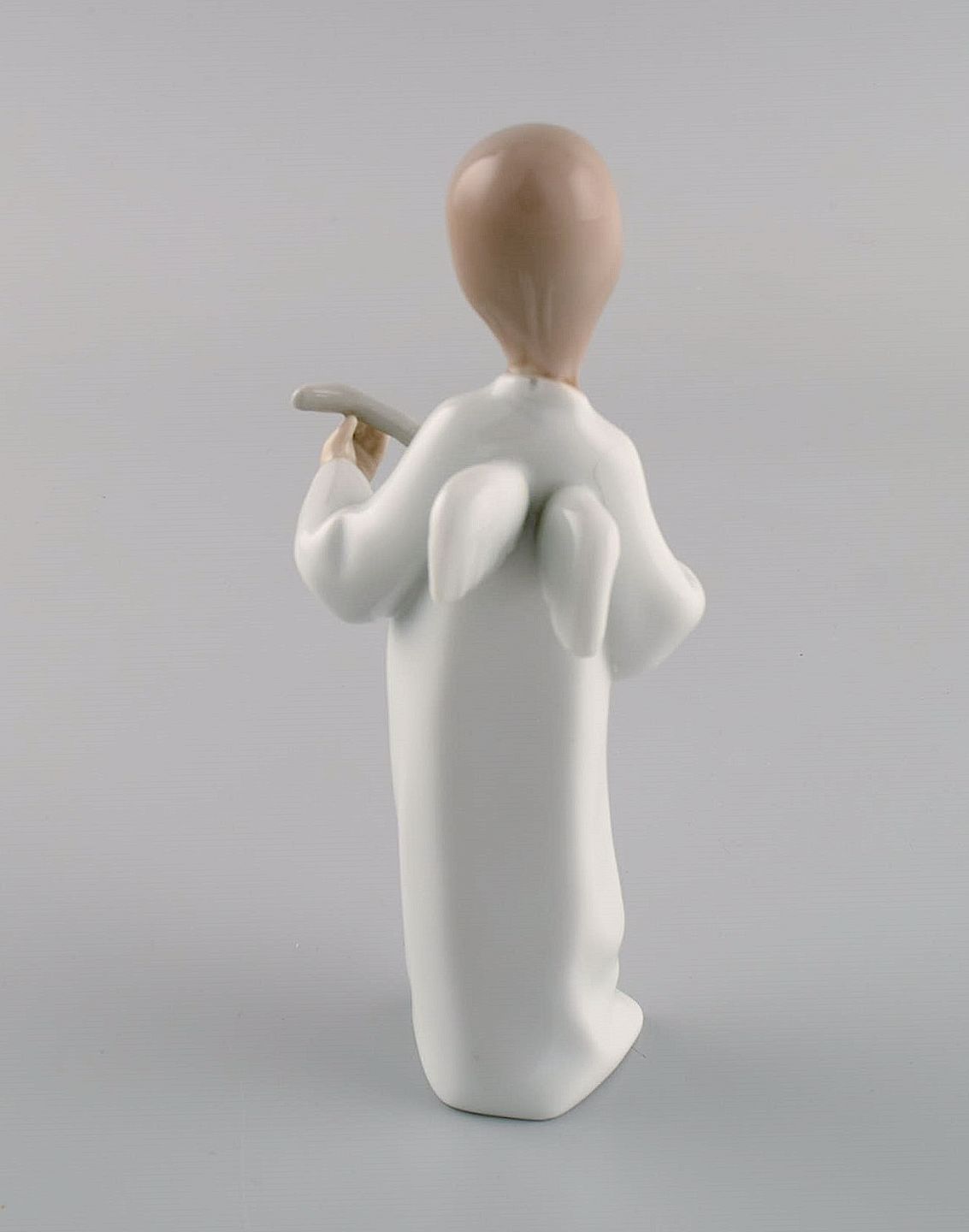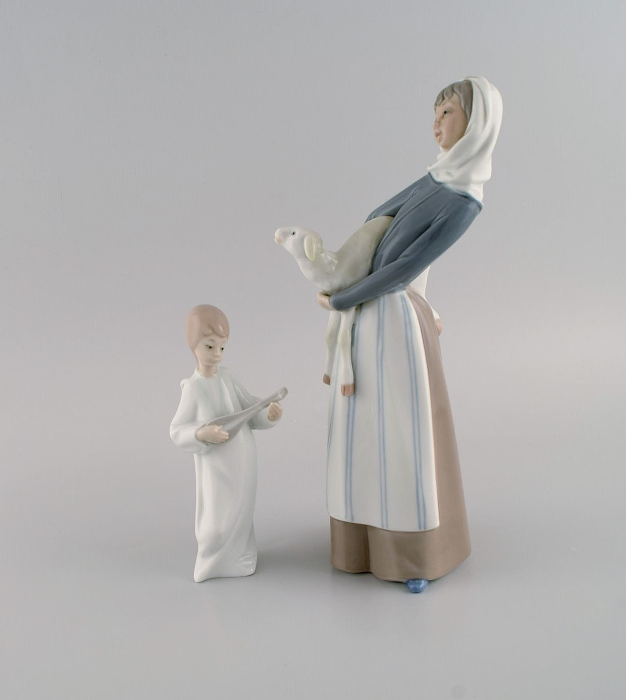 Lladro og Nao, Spanien. To porcelænsfigurer. Pige med lam og engledreng. 1970/80'erne. Største måler: 27,5 x 12 cm. I flot stand. Stemplet.