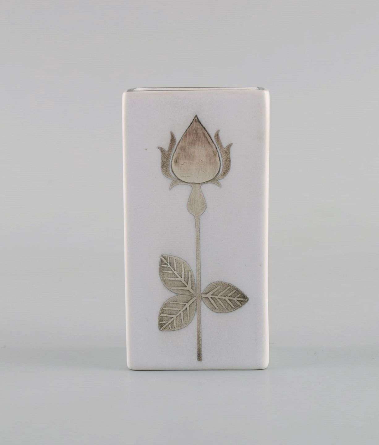 Sven Jonson (1919-1989) for Gustavsberg. Fem små Lagun vaser i glaseret stentøj med sølvindlæg i form af blomster. Midt 1900-tallet.