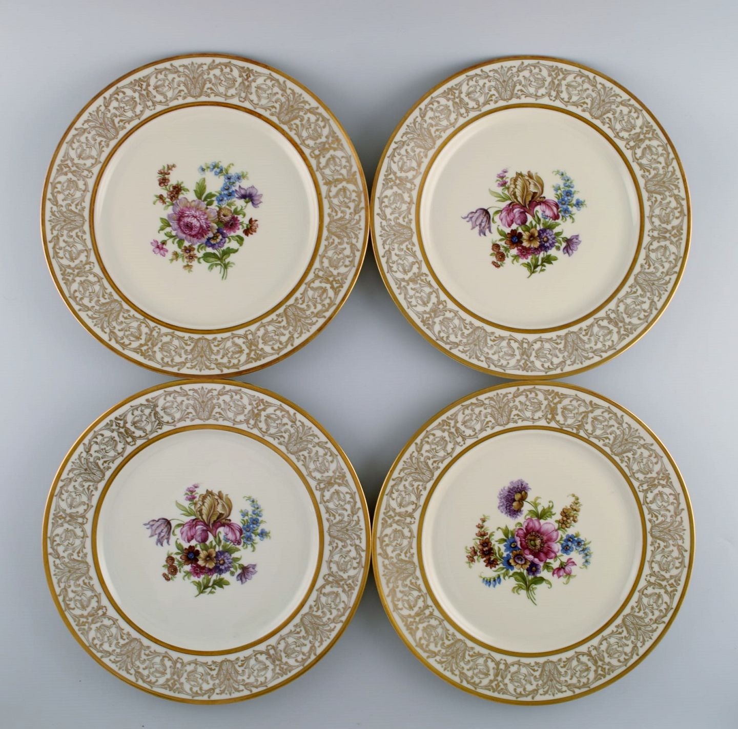 Tolv Tirschenreuth middagstallerkener i porcelæn dekoreret med blomster og gulddekoration. Tyskland, midt 1900-tallet. Diameter: 28 cm. I flot stand. Stemplet.