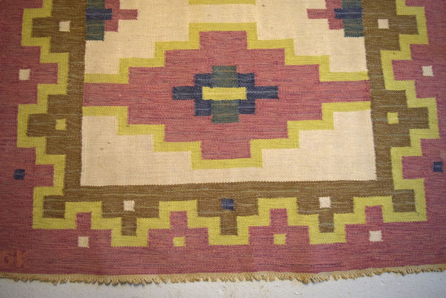 Svensk tekstildesigner. Stort håndvævet RÖLAKAN tæppe i ren uld med geometriske felter og rene linjer. Midt 1900-tallet. Måler: 250 x 165 cm. I flot stand. Signeret i monogram.
