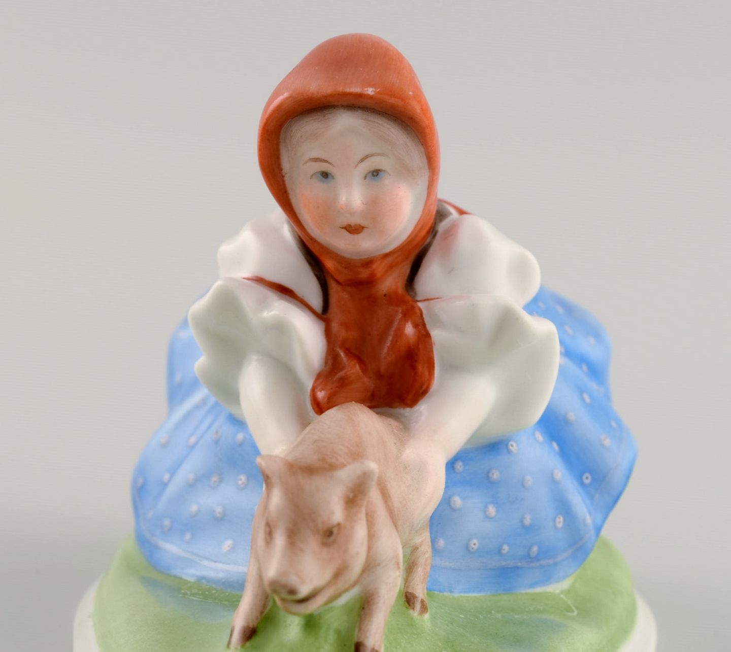 Herend figure in hand-painted porcelain. Peasant girl with piglet. Mid-20th century. Measures: 13.5 x 8.5 cm. In excellent condition. Stamped.