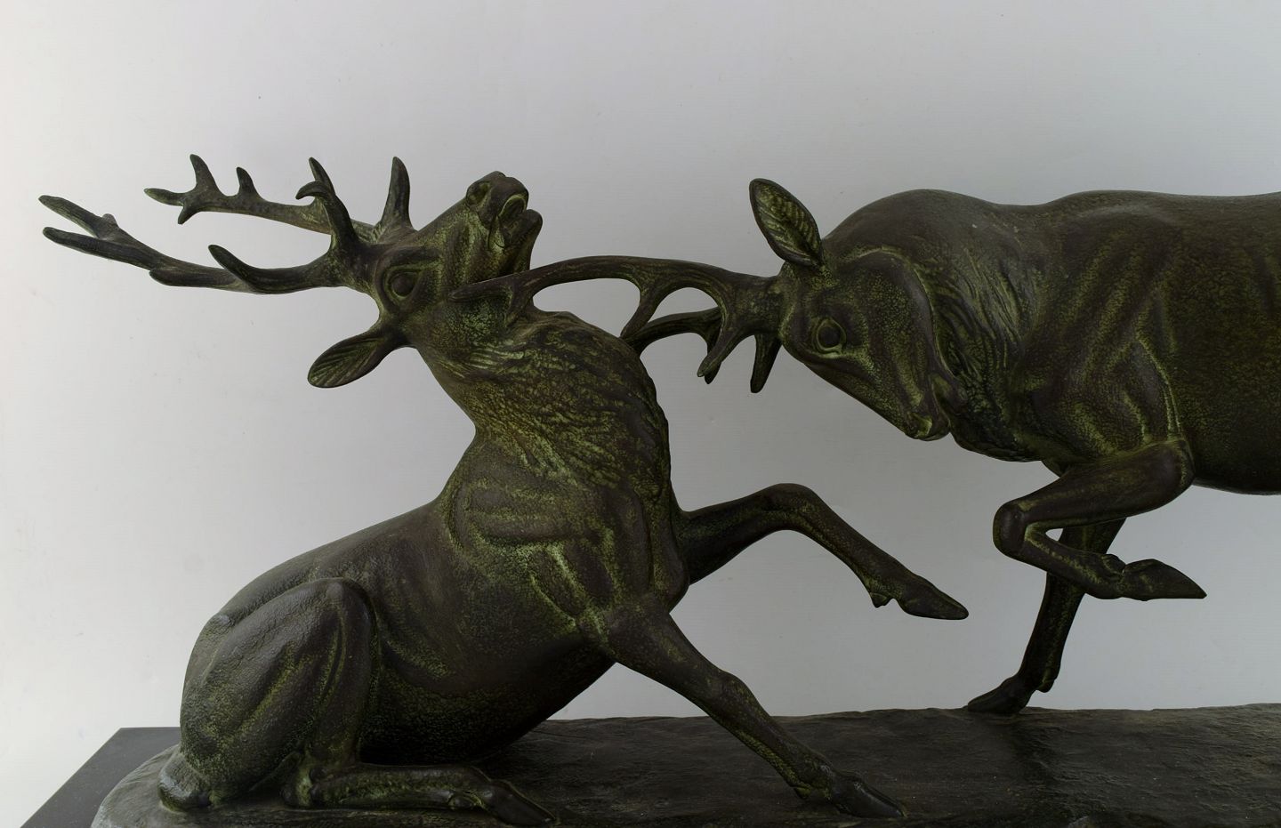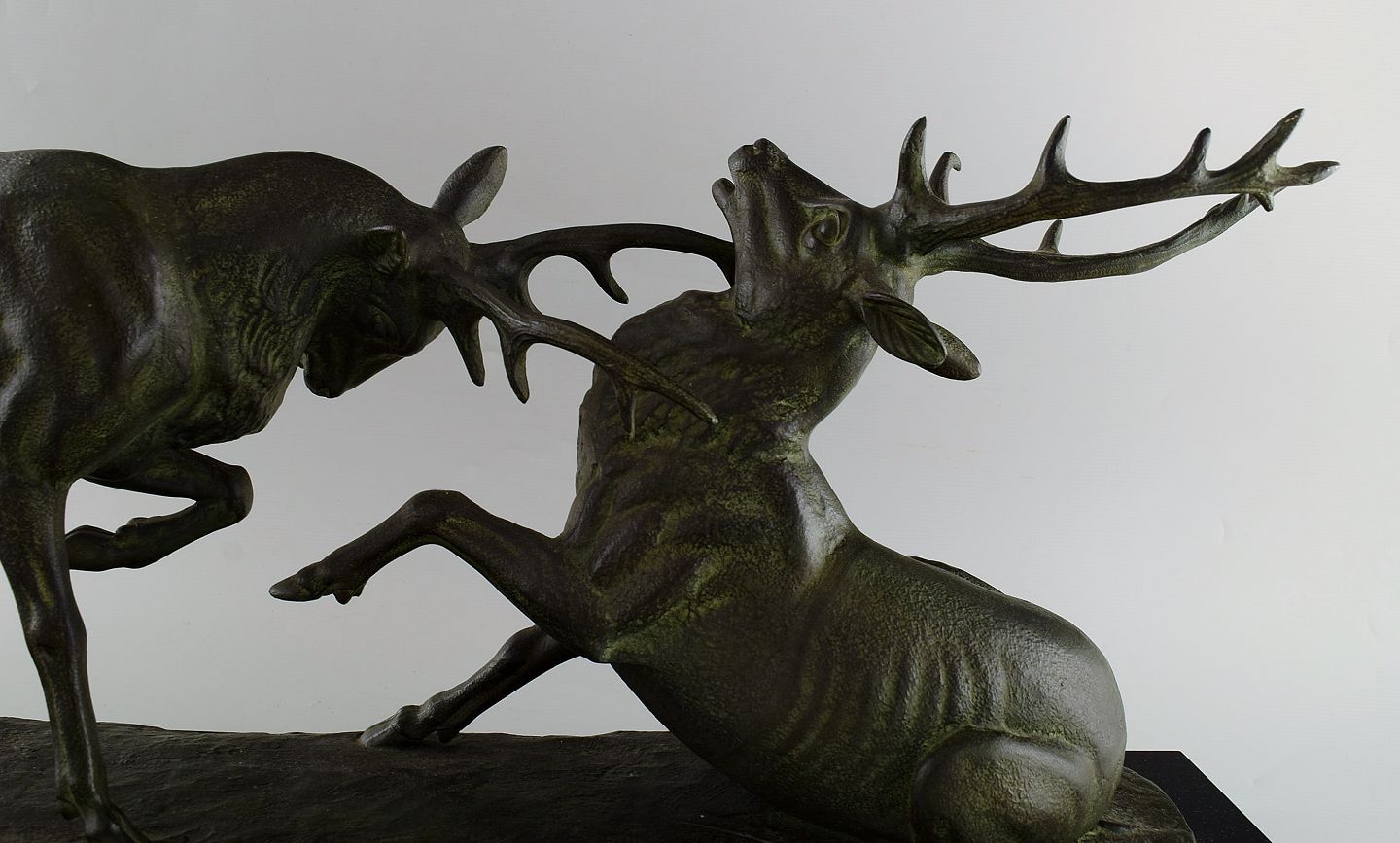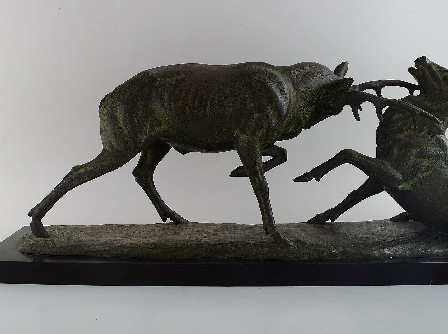 Irénée Rochard (1906-1984), Frankrig. Kolossal skulptur i patineret bronze på marmorbase. Kæmpende kronhjorte. Midt 1900-tallet.