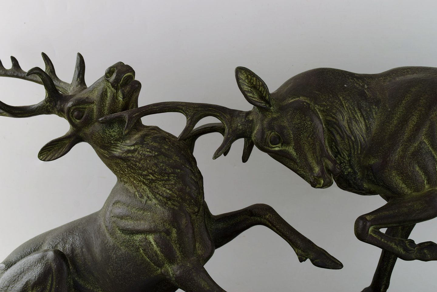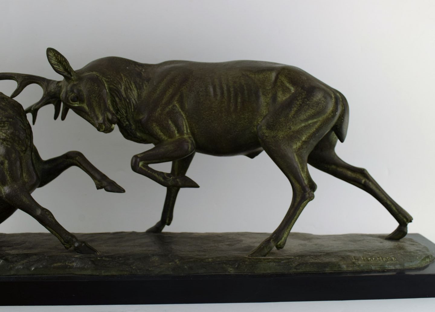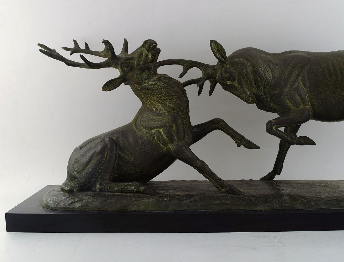 Irénée Rochard (1906-1984), Frankrig. Kolossal skulptur i patineret bronze på marmorbase. Kæmpende kronhjorte. Midt 1900-tallet.