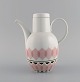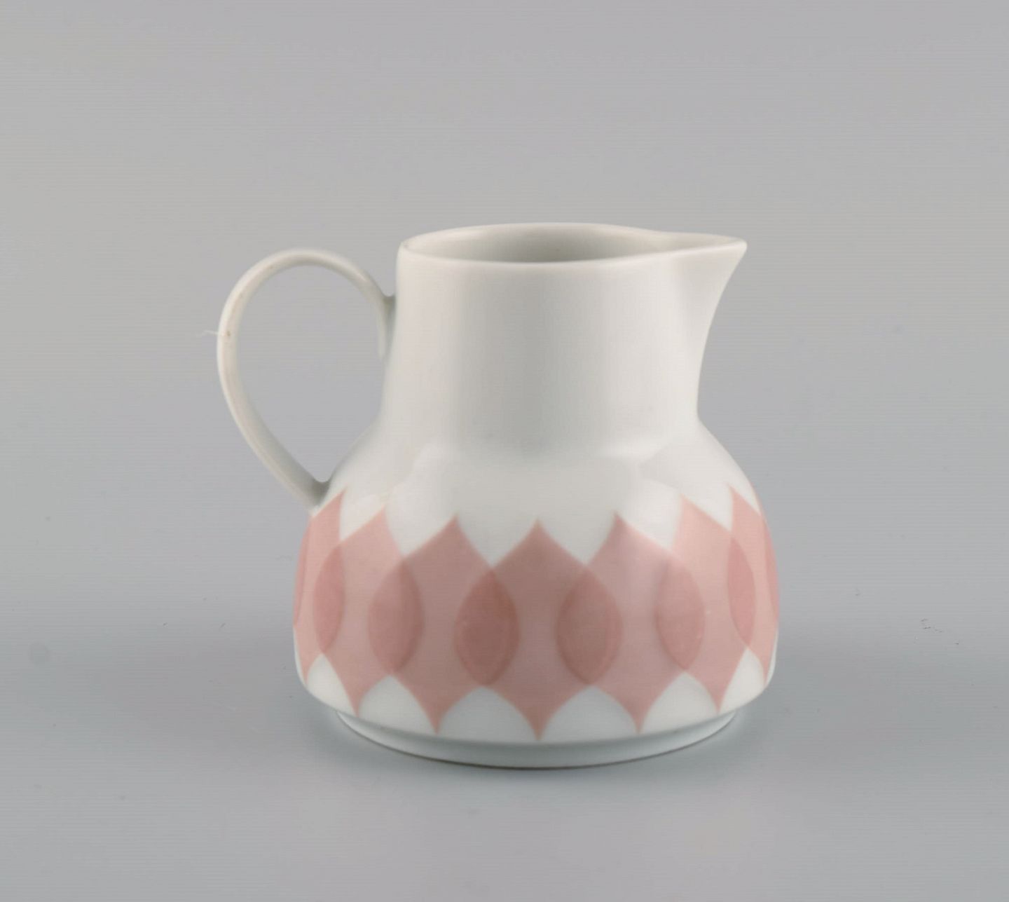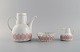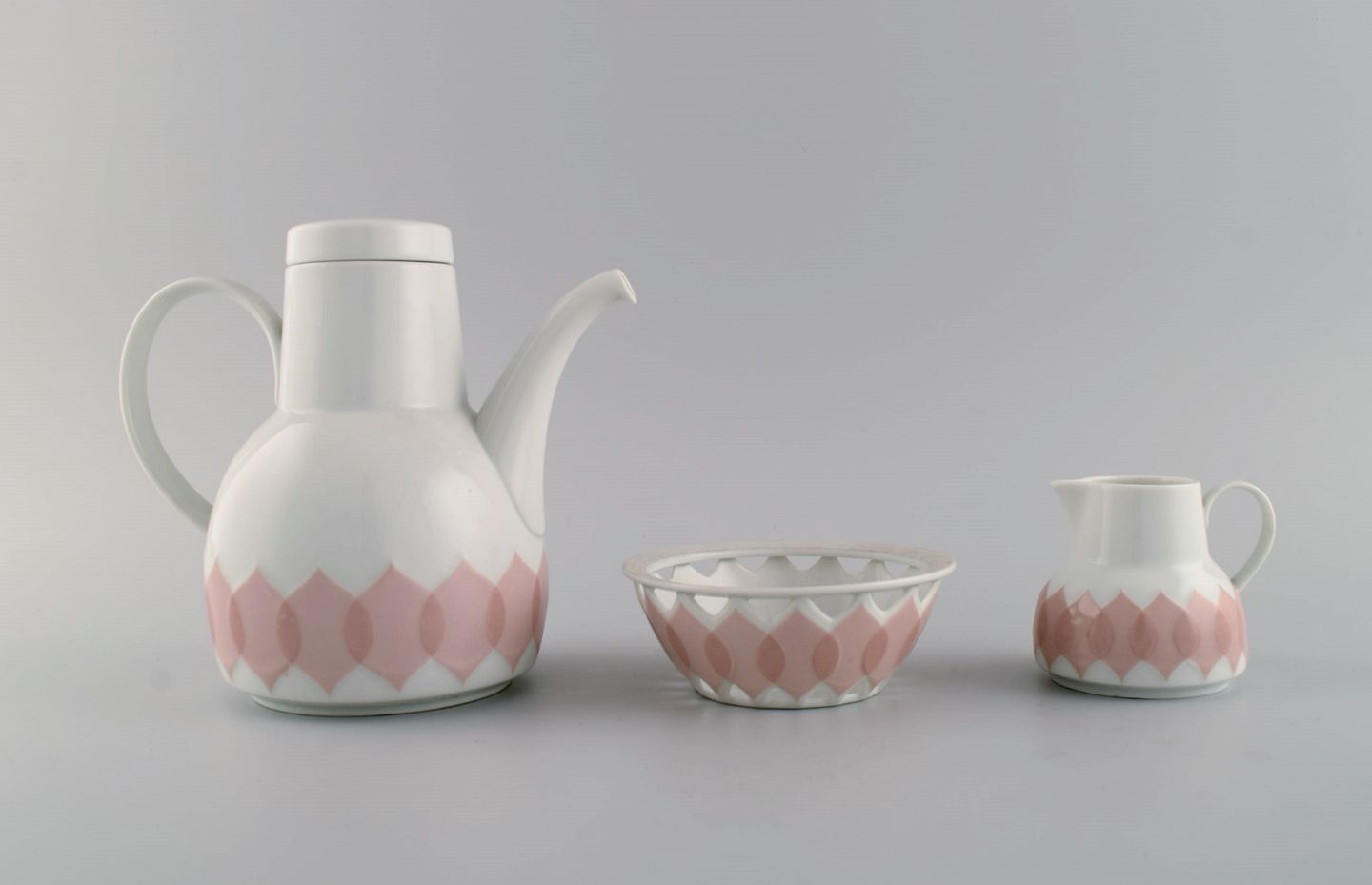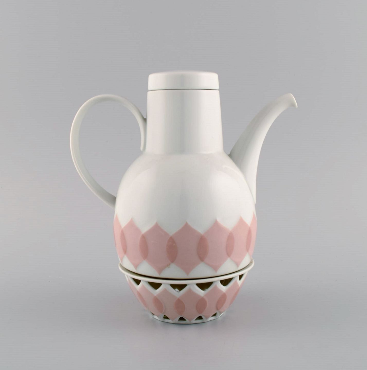 Bjørn Wiinblad for Rosenthal. Lotus porcelain service. Coffee pot with heater for tealight candles and creamer decorated with pink lotus leaves. 1980s.