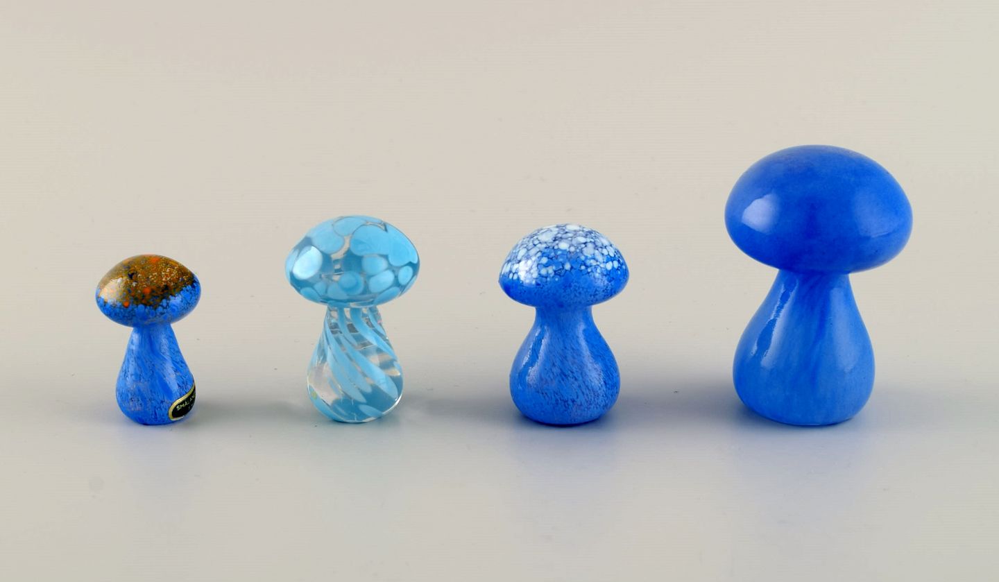 Smålandshyttan, Sverige. Syv svampe i mundblæst kunstglas. 1960/70'erne. Største måler: 6,5 x 5,2 cm. I flot stand. Mærkat.