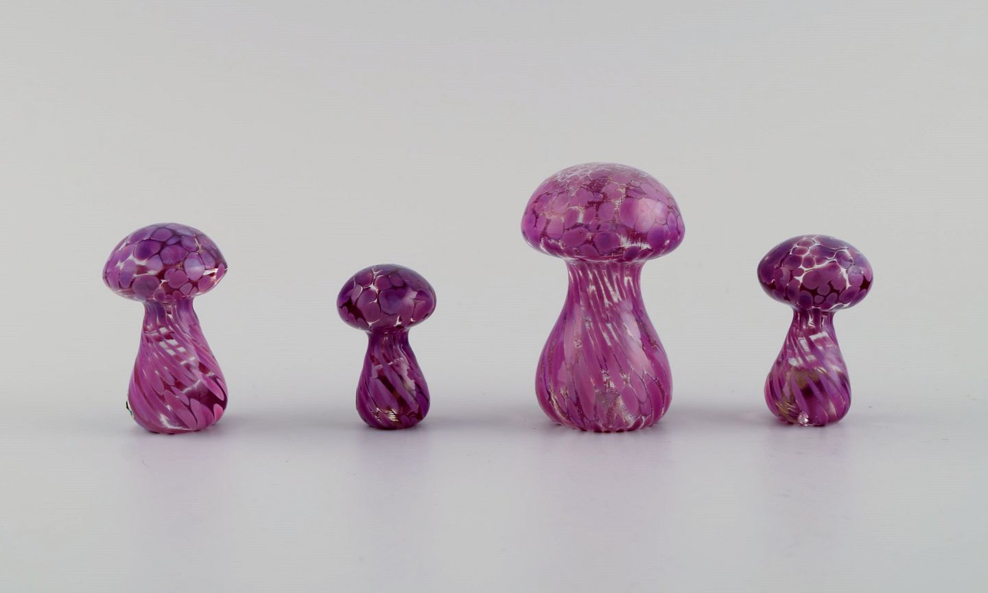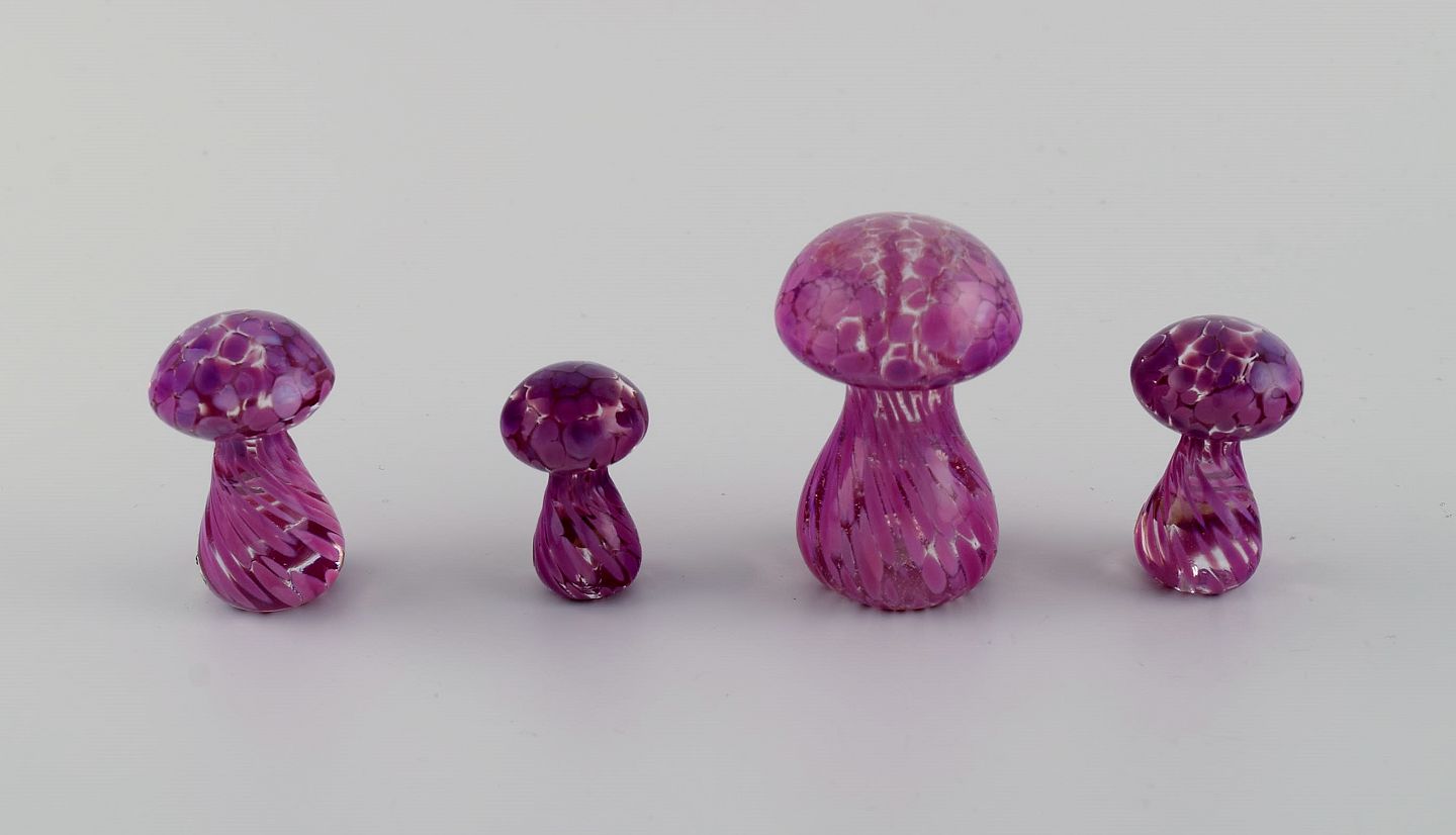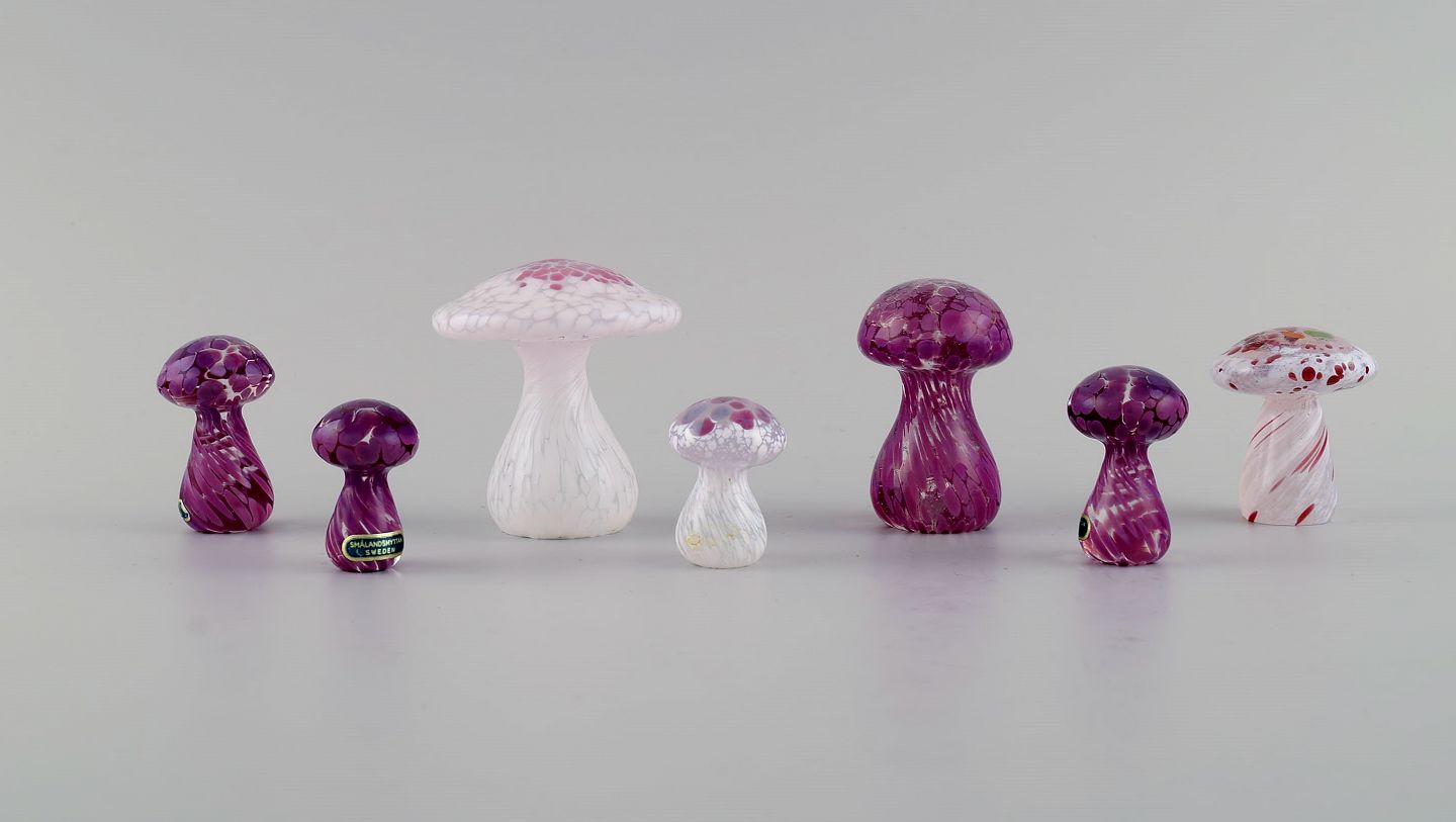 Smålandshyttan, Sweden. Seven mushrooms in mouth-blown art glass. Purple and pink shades. 1960/70s. Largest measures: 7.2 x 6.5 cm. In excellent condition. Sticker.