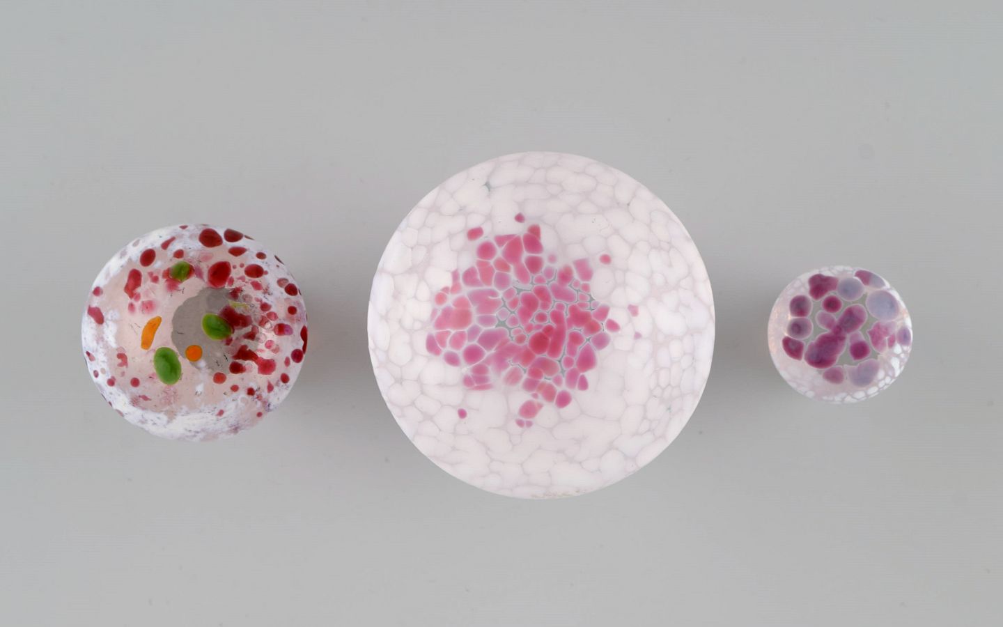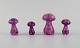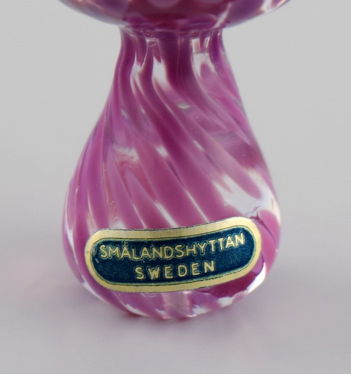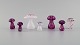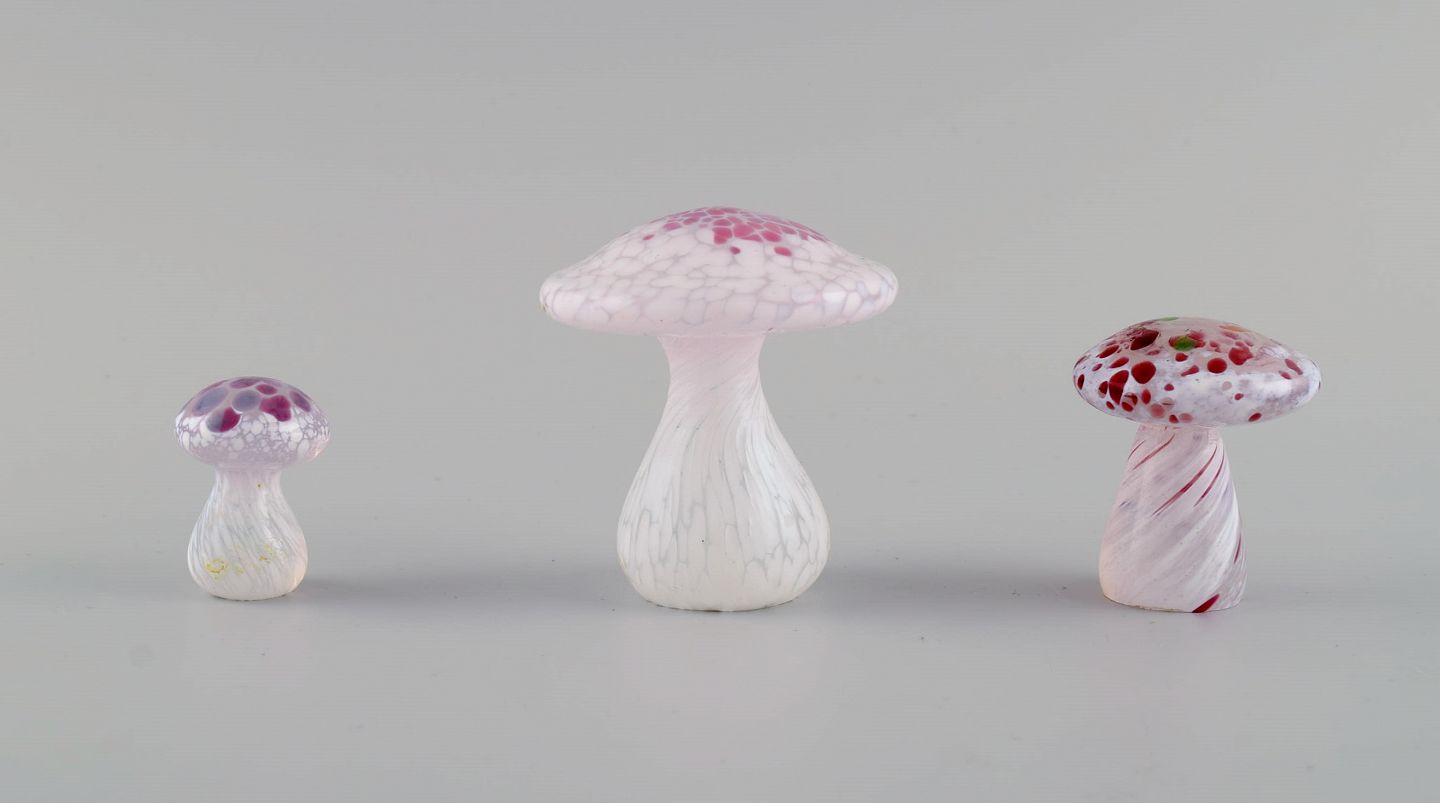 Smålandshyttan, Sweden. Seven mushrooms in mouth-blown art glass. Purple and pink shades. 1960/70s. Largest measures: 7.2 x 6.5 cm. In excellent condition. Sticker.