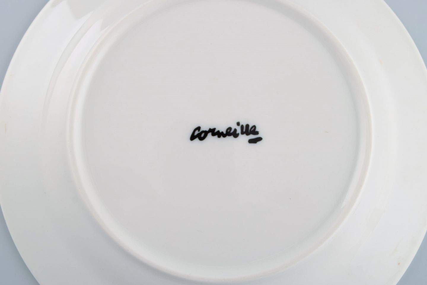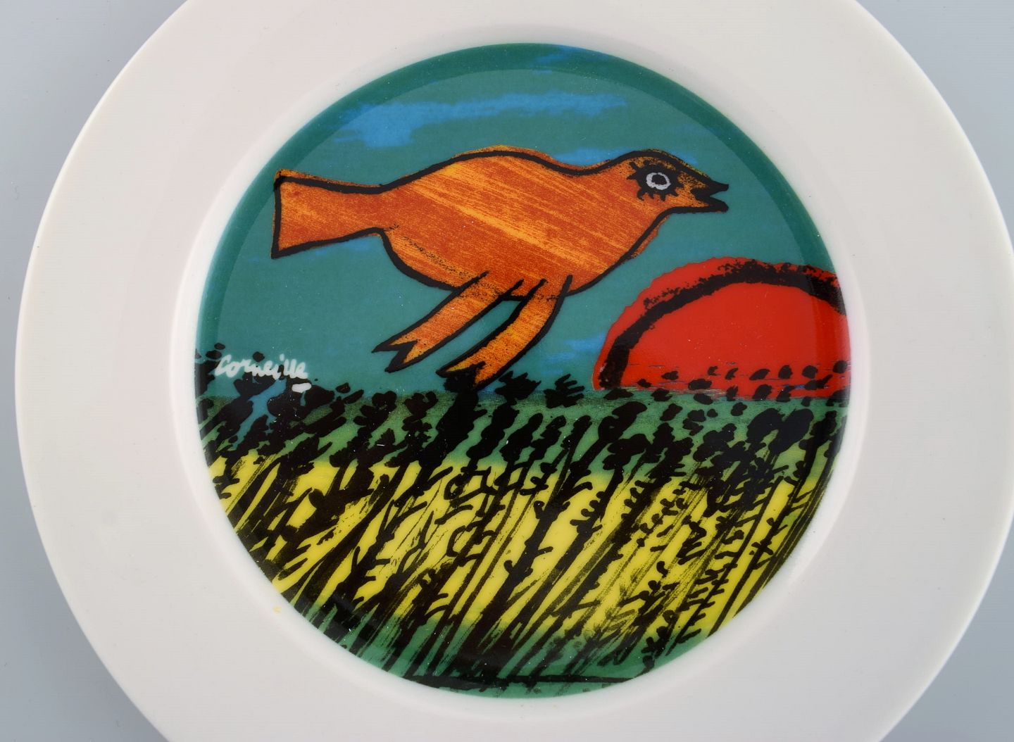 Corneille (Guillaume Cornelis van Beverloo), Hollandsk CoBrA kunstner (1922-2010). Kaffekop, tallerken og æggebæger i porcelæn dekoreret med fugle over mark med solopgang. 1980/90'erne.