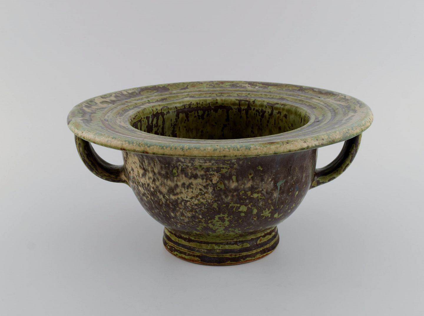 Patrick Nordstrøm/Carl Halier for Royal Copenhagen. Stor unika vase med hanke i glaseret keramik. Smuk glasur i grønne og jordnuancer. Dateret 1924.