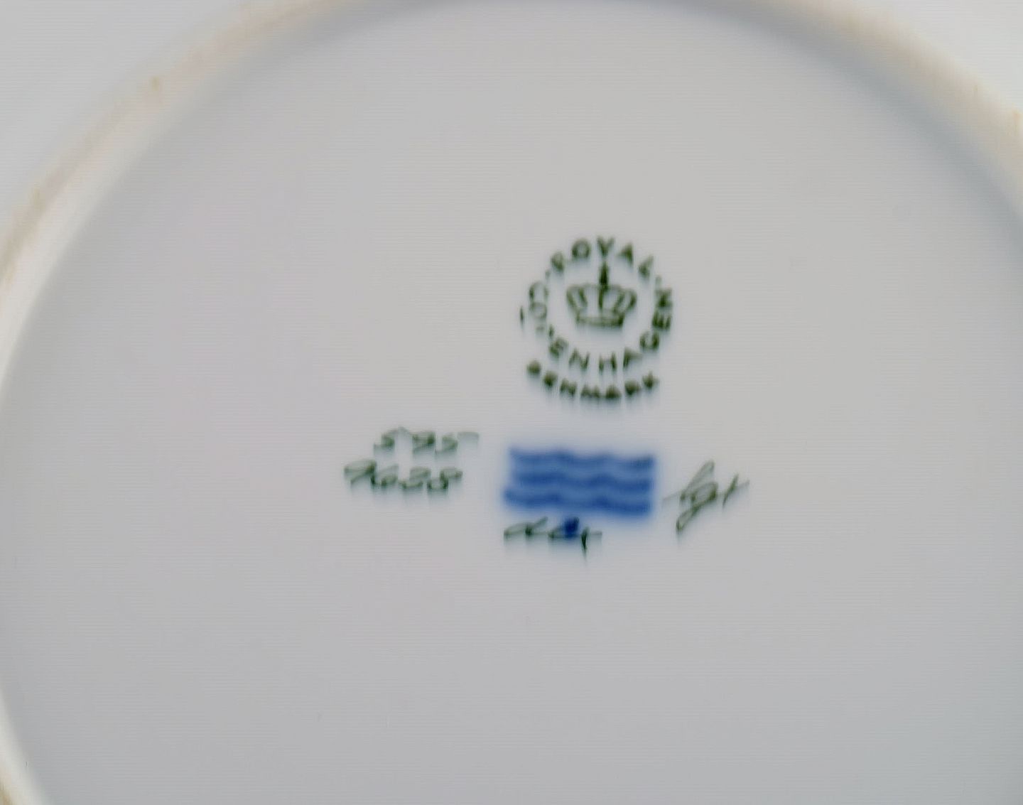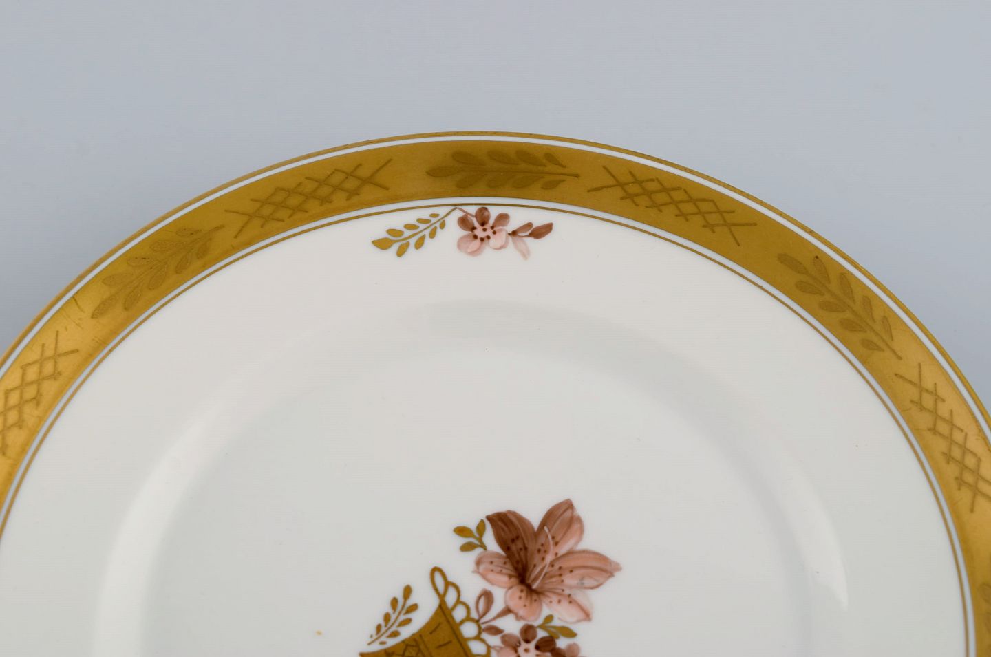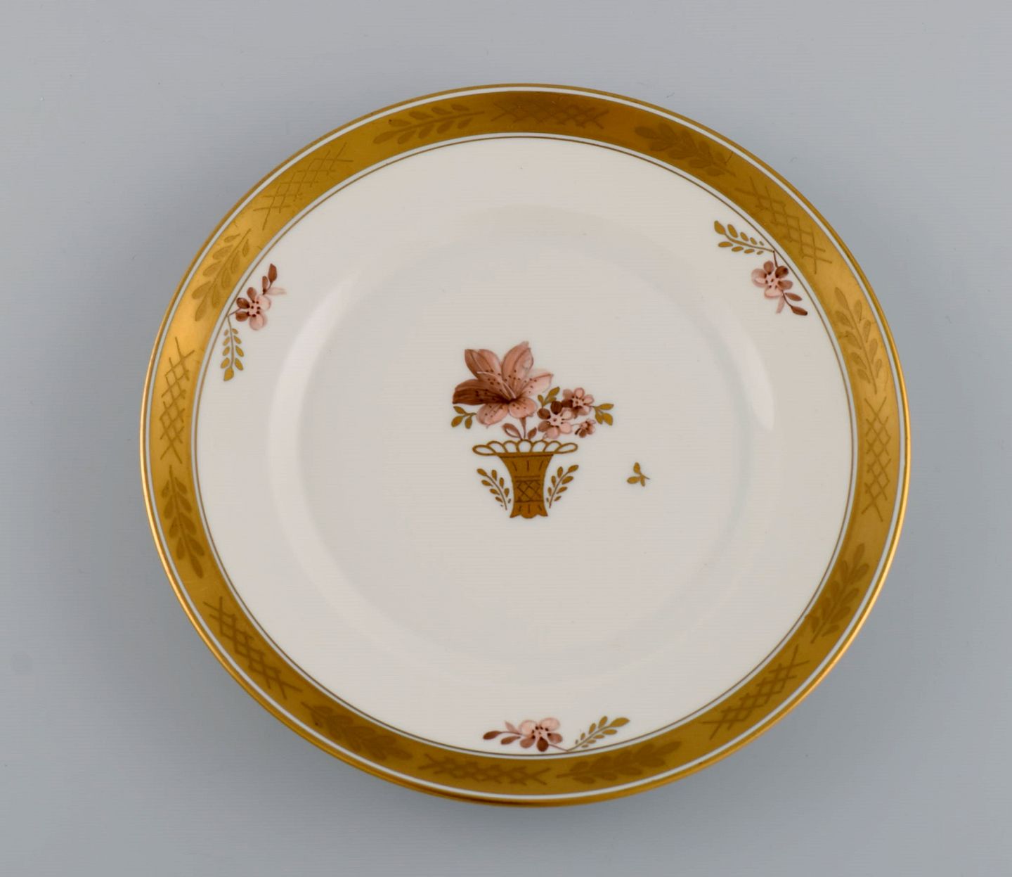 Otte Royal Copenhagen Guldkurv frokosttallerkener i håndmalet porcelæn med blomster og gulddekoration. 1960'erne. Modelnummer 595/9528.
