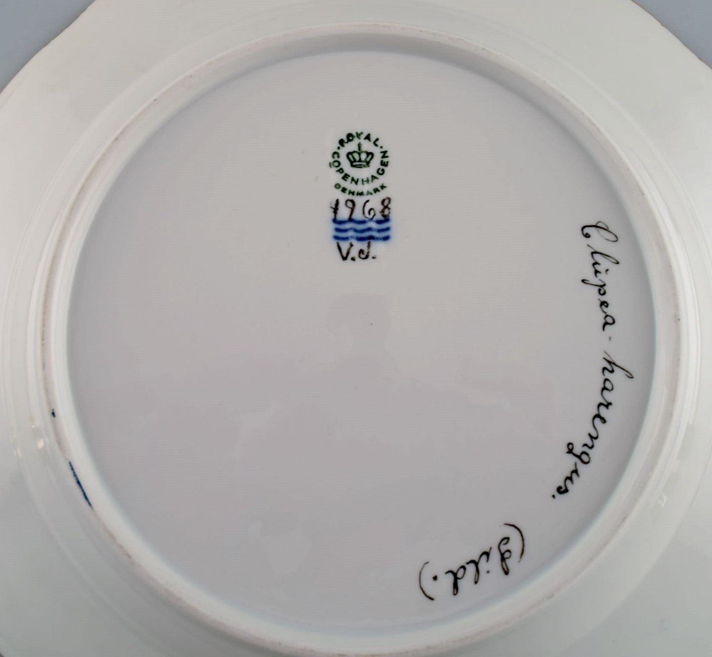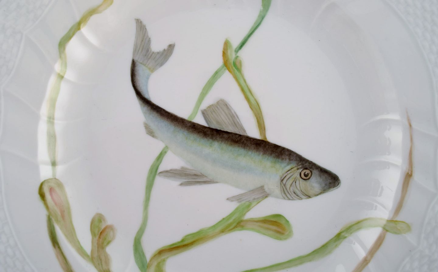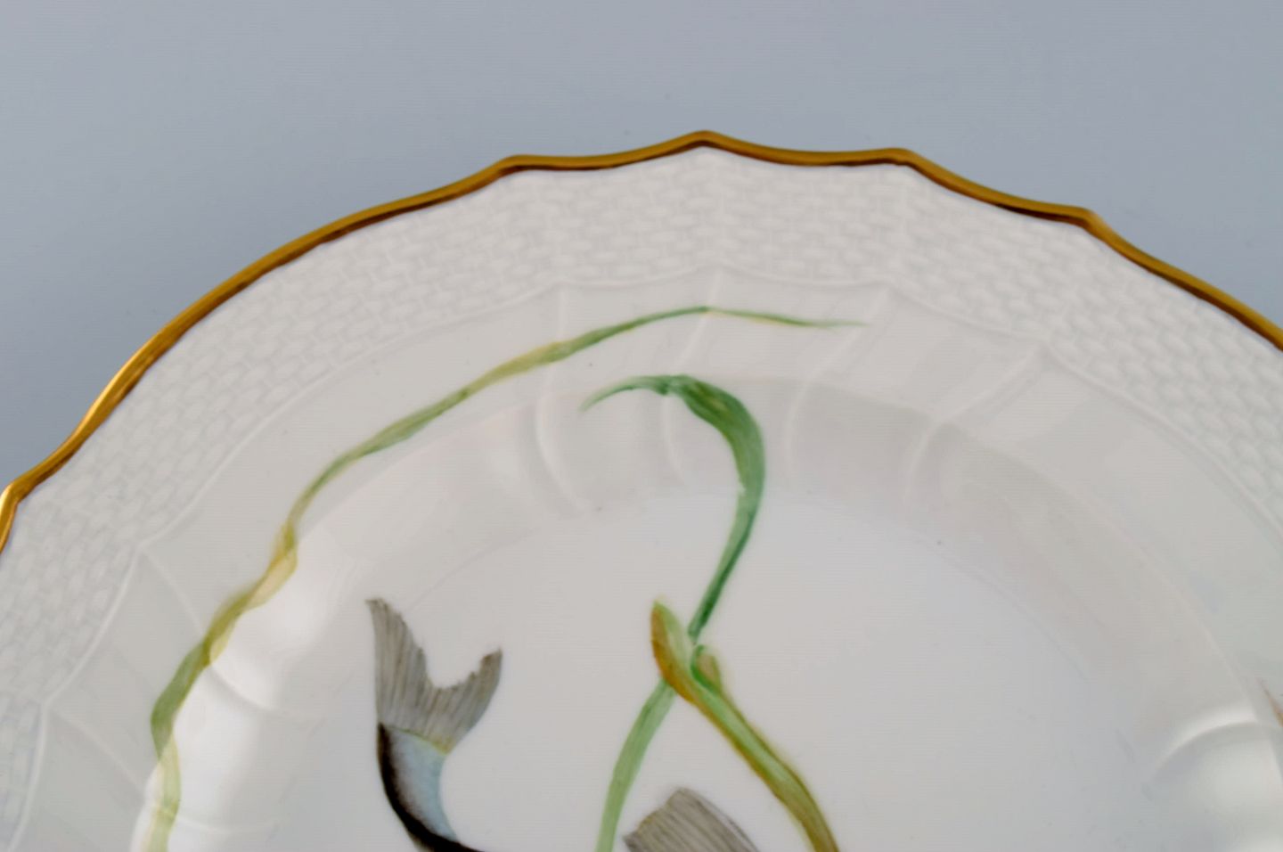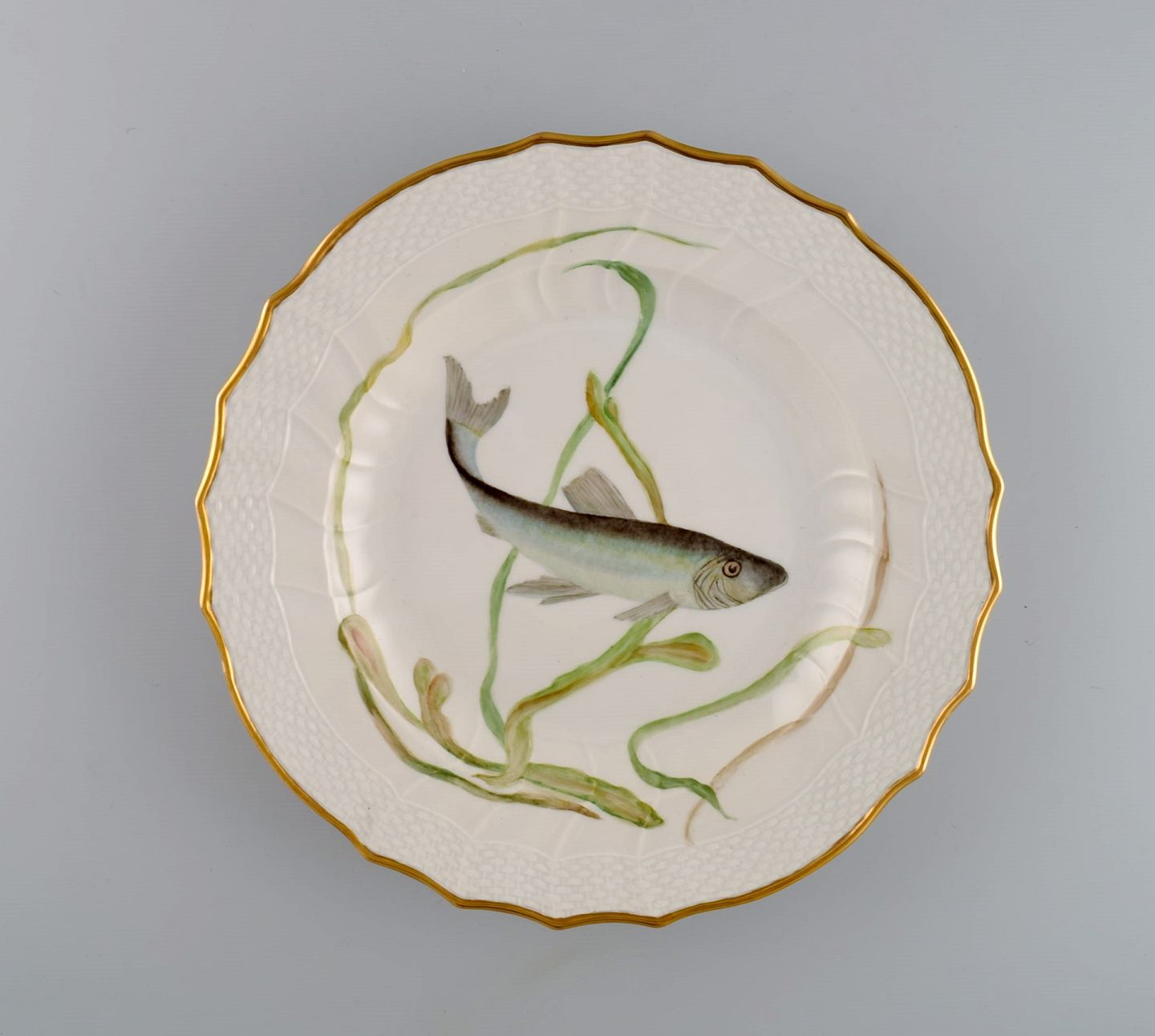 Royal Copenhagen middagstallerken i porcelæn med håndmalet fiskemotiv og guldkant. Flora / Fauna Danica stil. Dateret 1968.