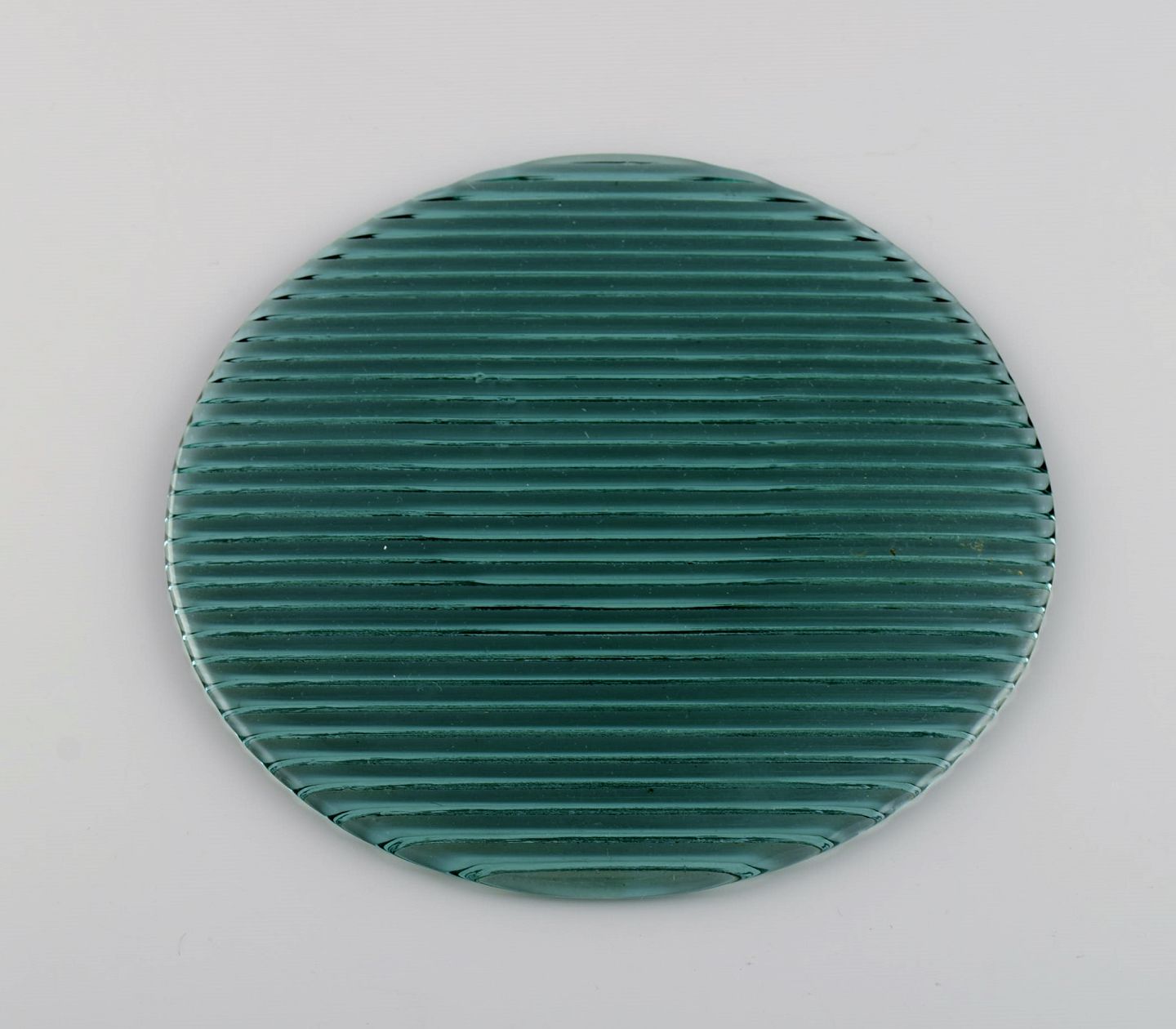Per Lütken for Holmegaard. Seks "Buffet" tallerkener i blågrønt mundblæst kunstglas. 1980'erne. Diameter: 18 - 19 cm. I flot stand.