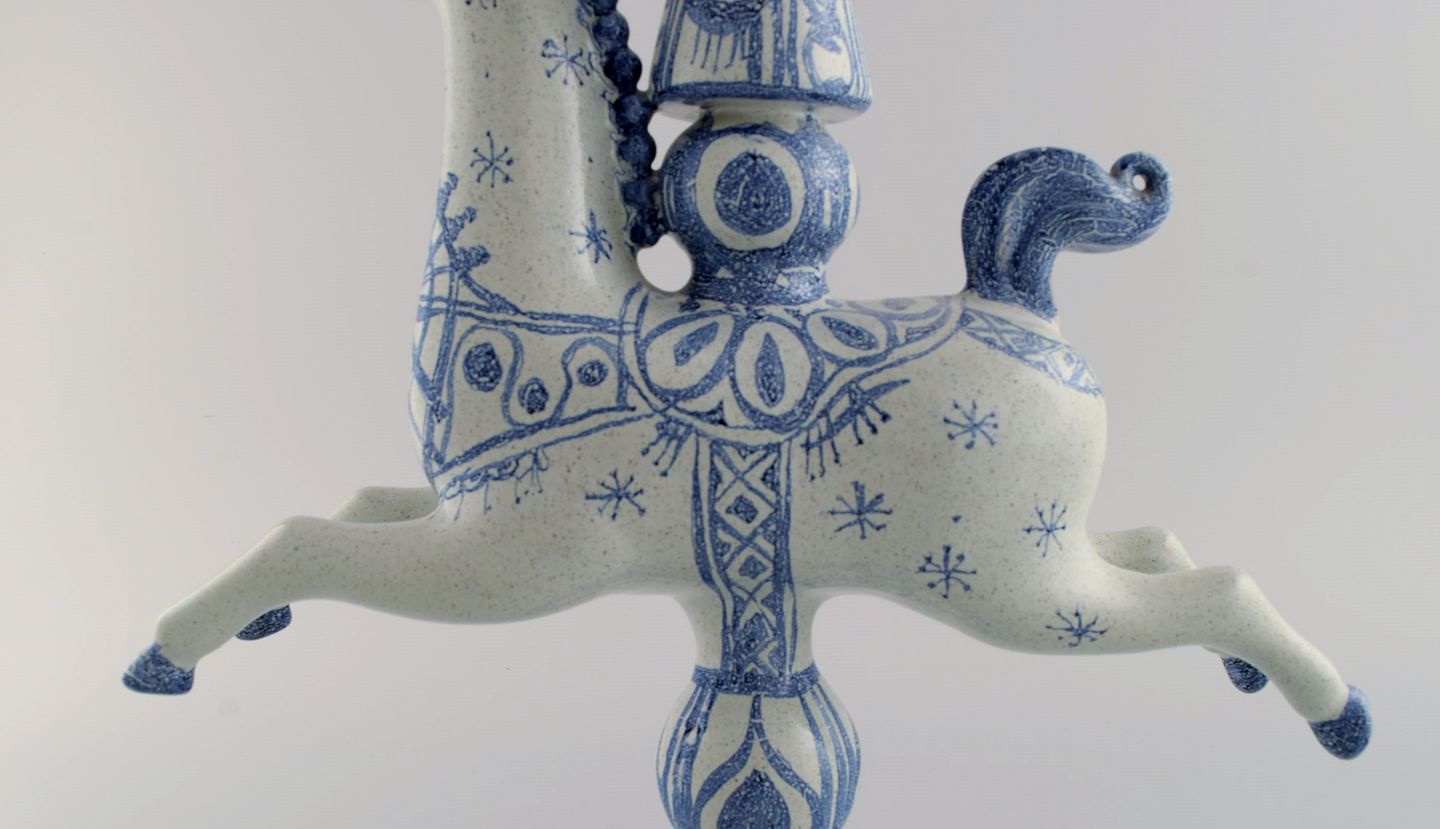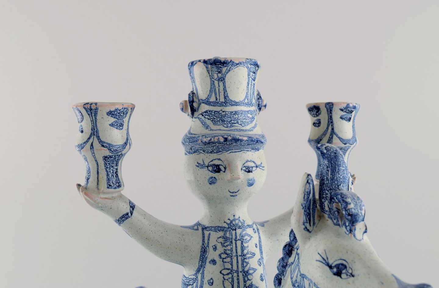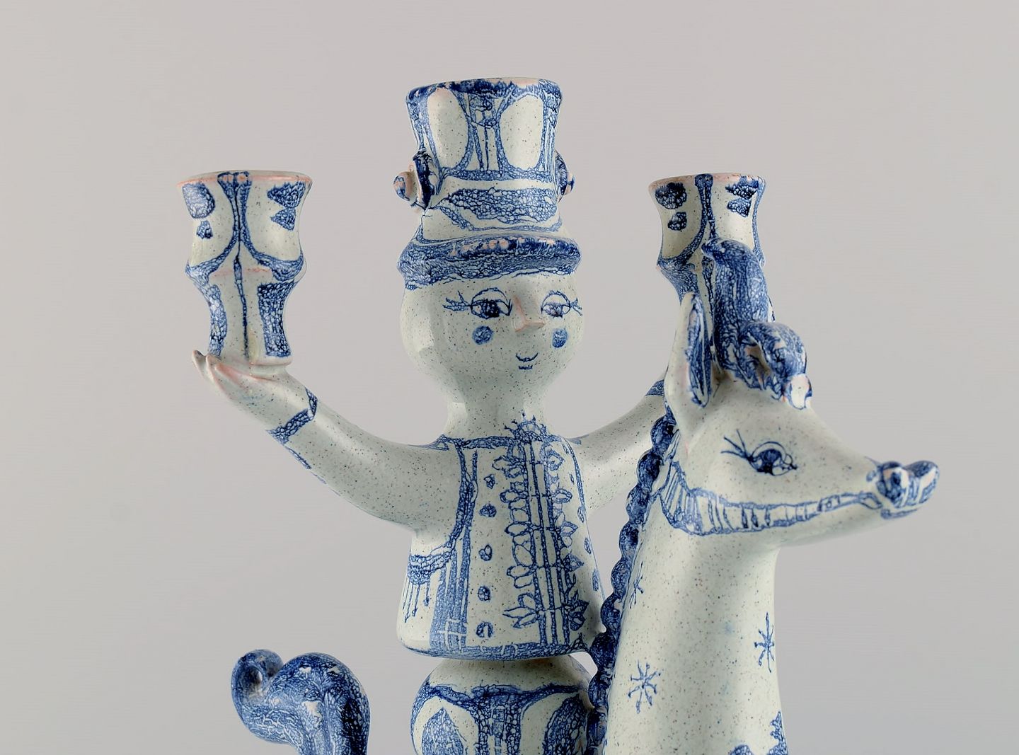Bjørn Wiinblad (1918-2006), Danmark. Stor unika figur/lysestage i håndmalet keramik. Rytter til hest. Dateret 1963. Måler: 39 x 30 cm. I flot stand. Signeret og dateret Modelnummer L5.