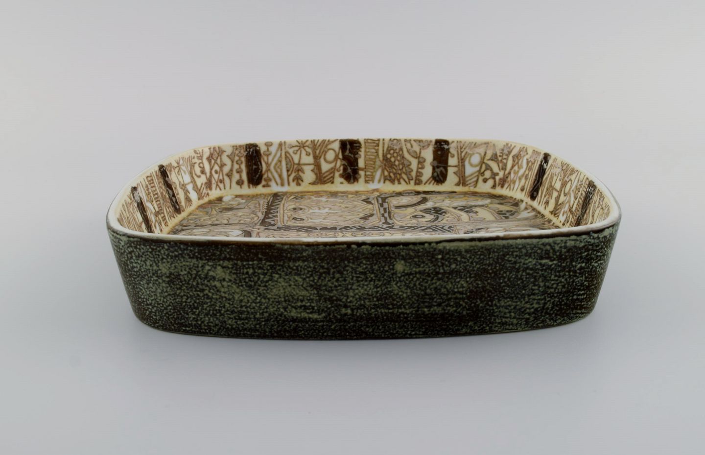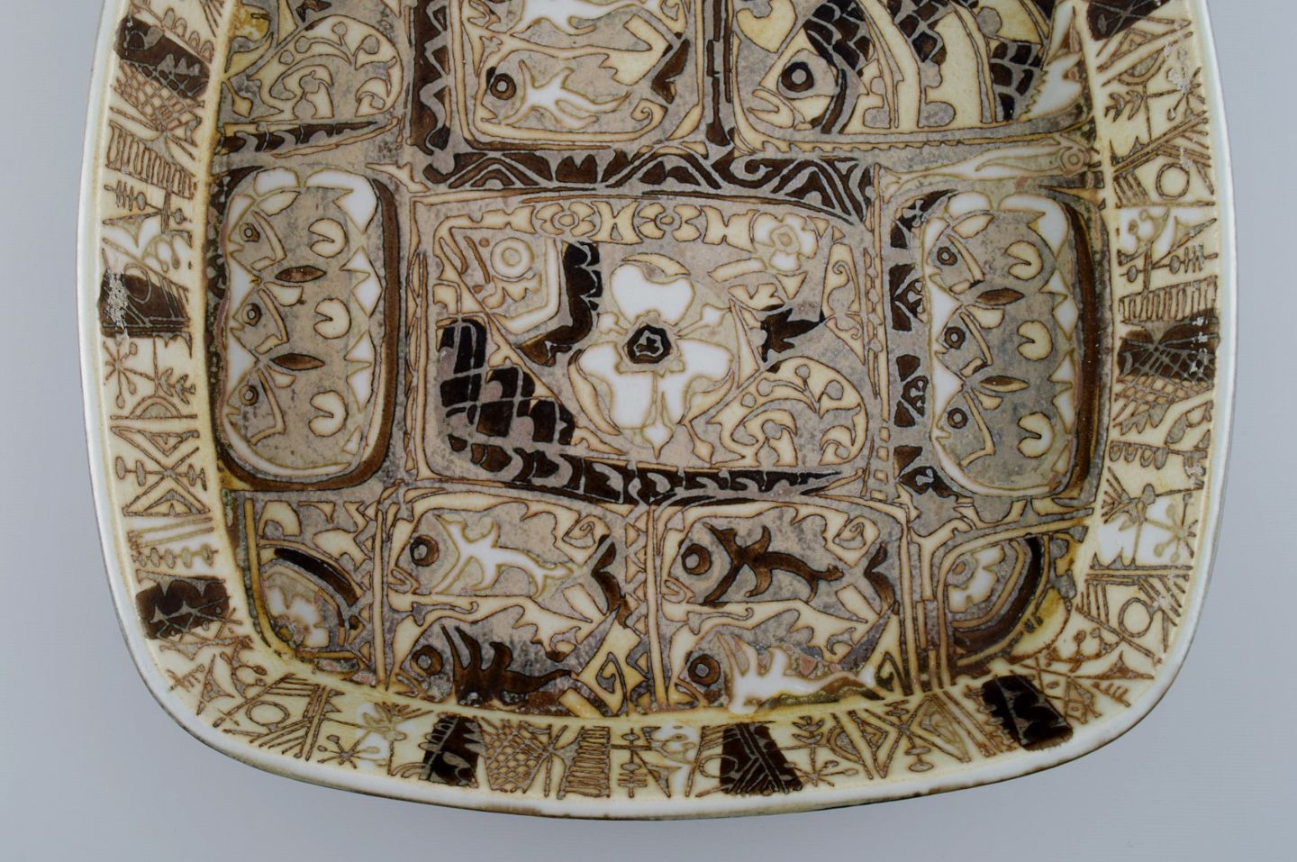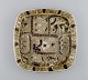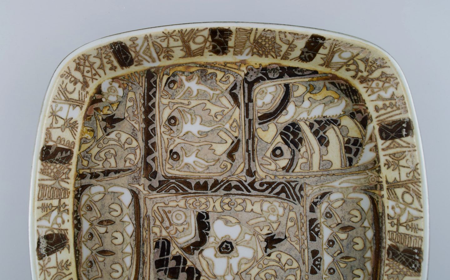 Nils Thorsson og Johanne Gerber for Aluminia, Royal Copenhagen. To kvadratiske Baca fade dekoreret med fisk, mønstret glasur i sand og lyse brune nuancer. 1960/70'erne.