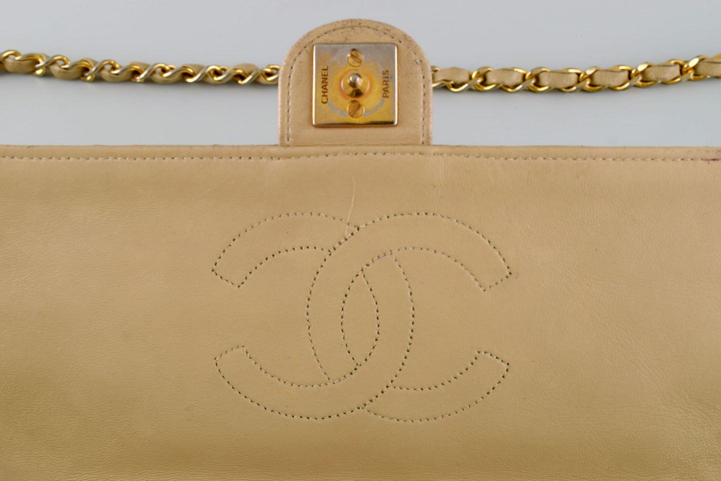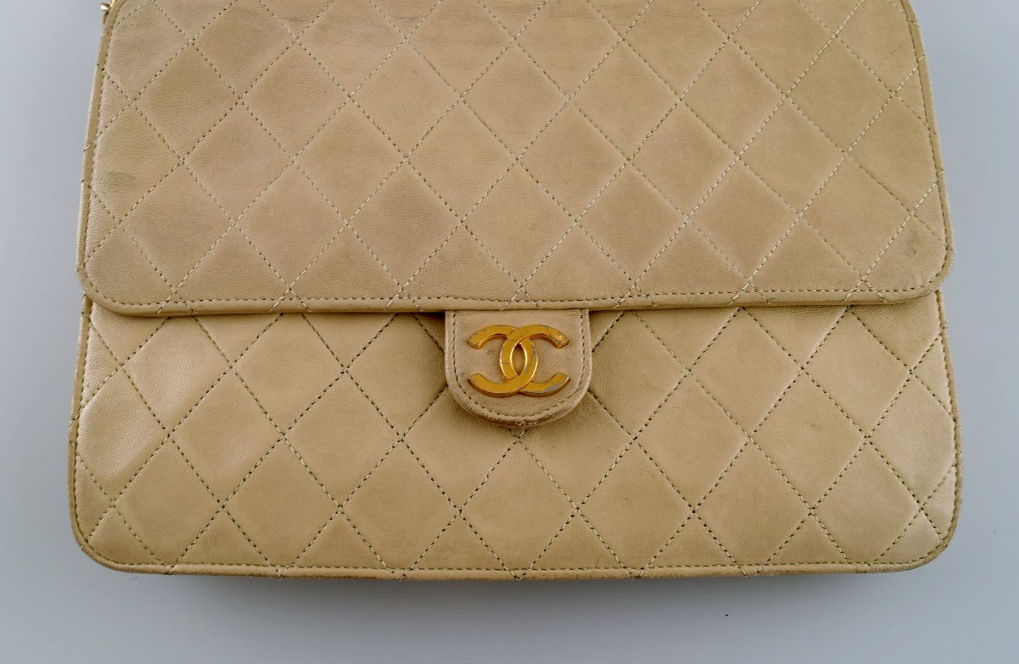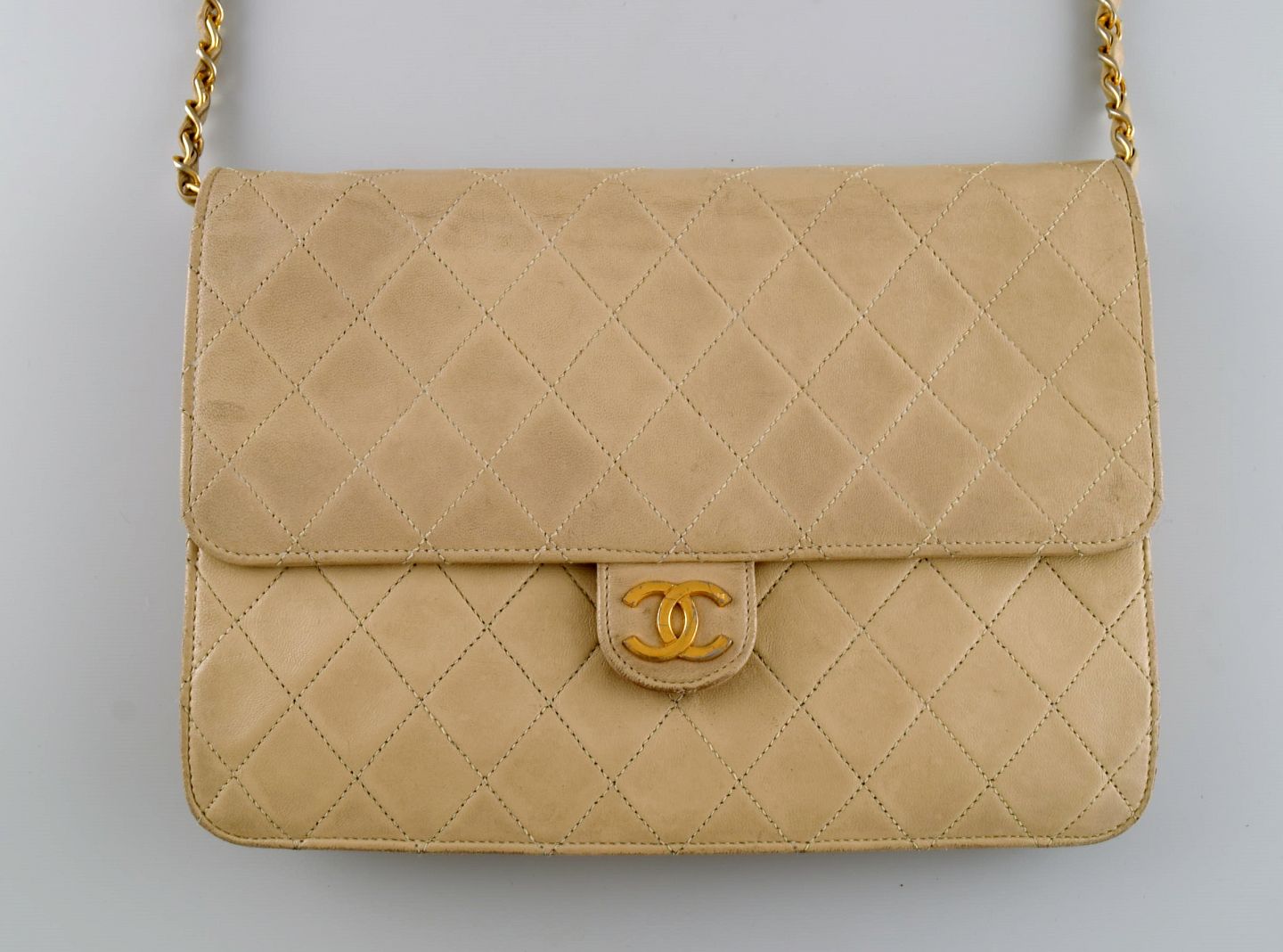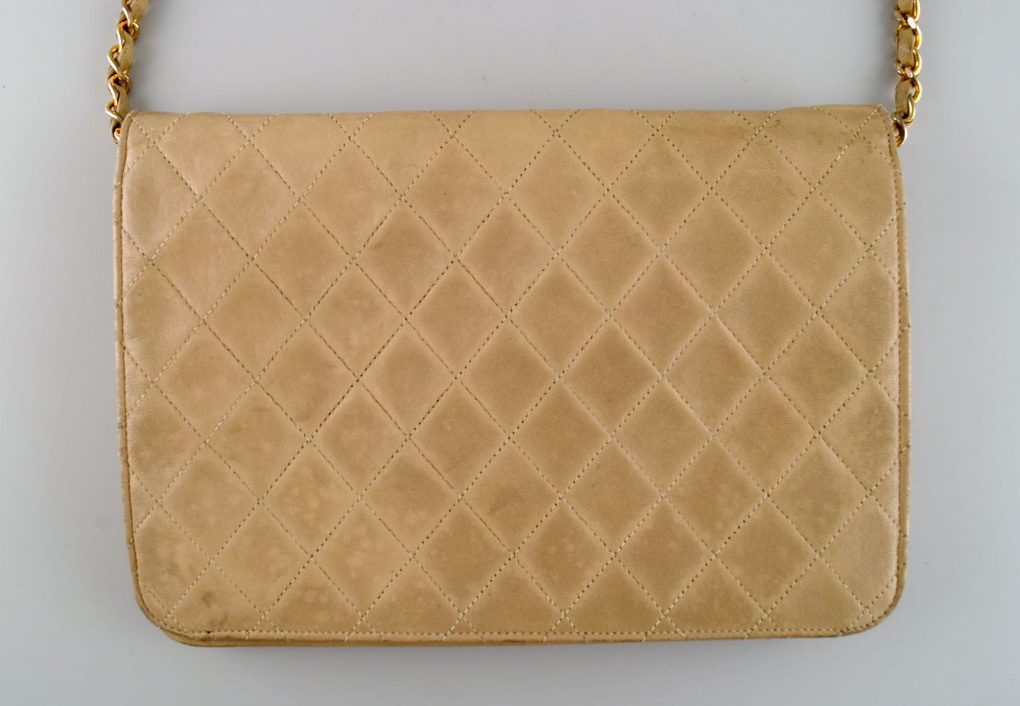Vintage Chanel calfskin shoulder bag. Seams in checkered pattern. French design, 1970s. Measures: 25 x 18 cm. In excellent condition. Minor signs of use. Stamped.