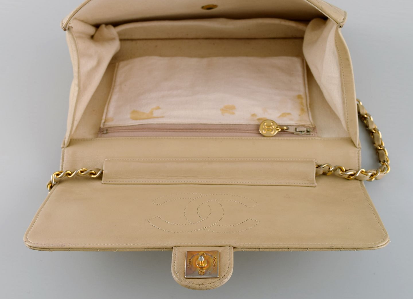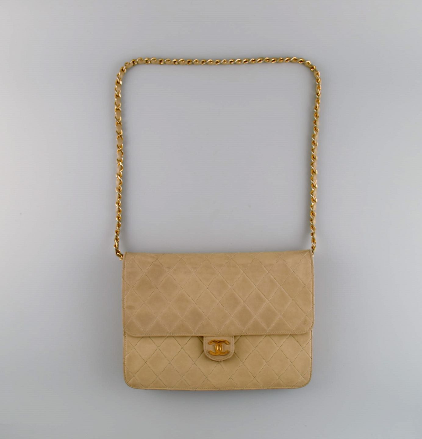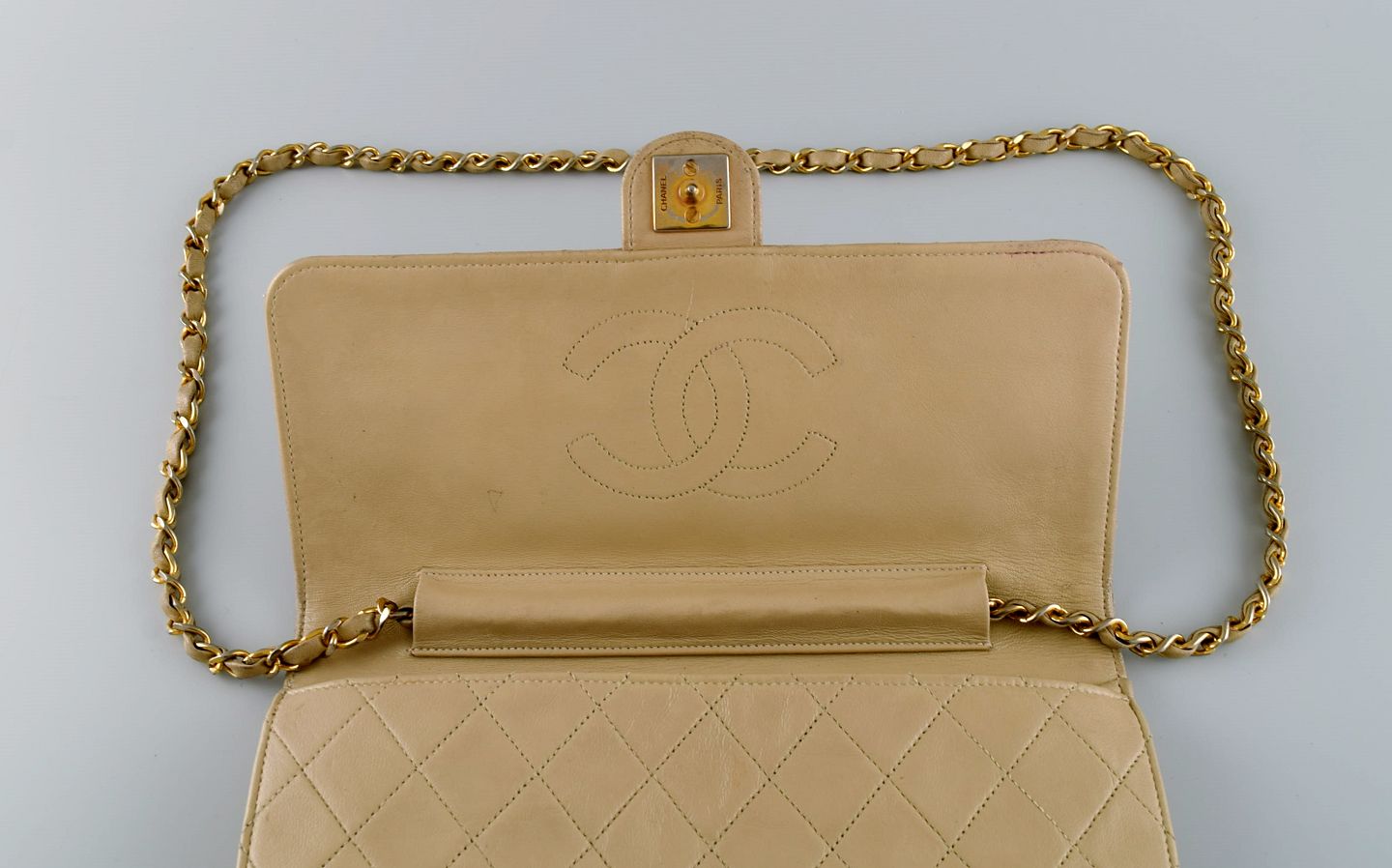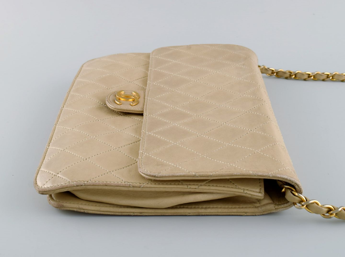 Vintage Chanel calfskin shoulder bag. Seams in checkered pattern. French design, 1970s. Measures: 25 x 18 cm. In excellent condition. Minor signs of use. Stamped.