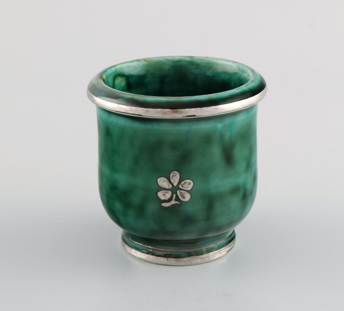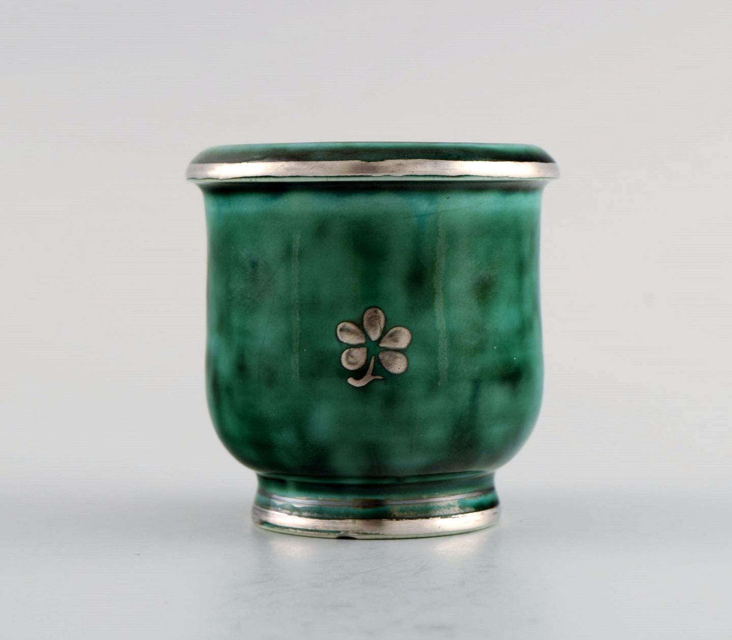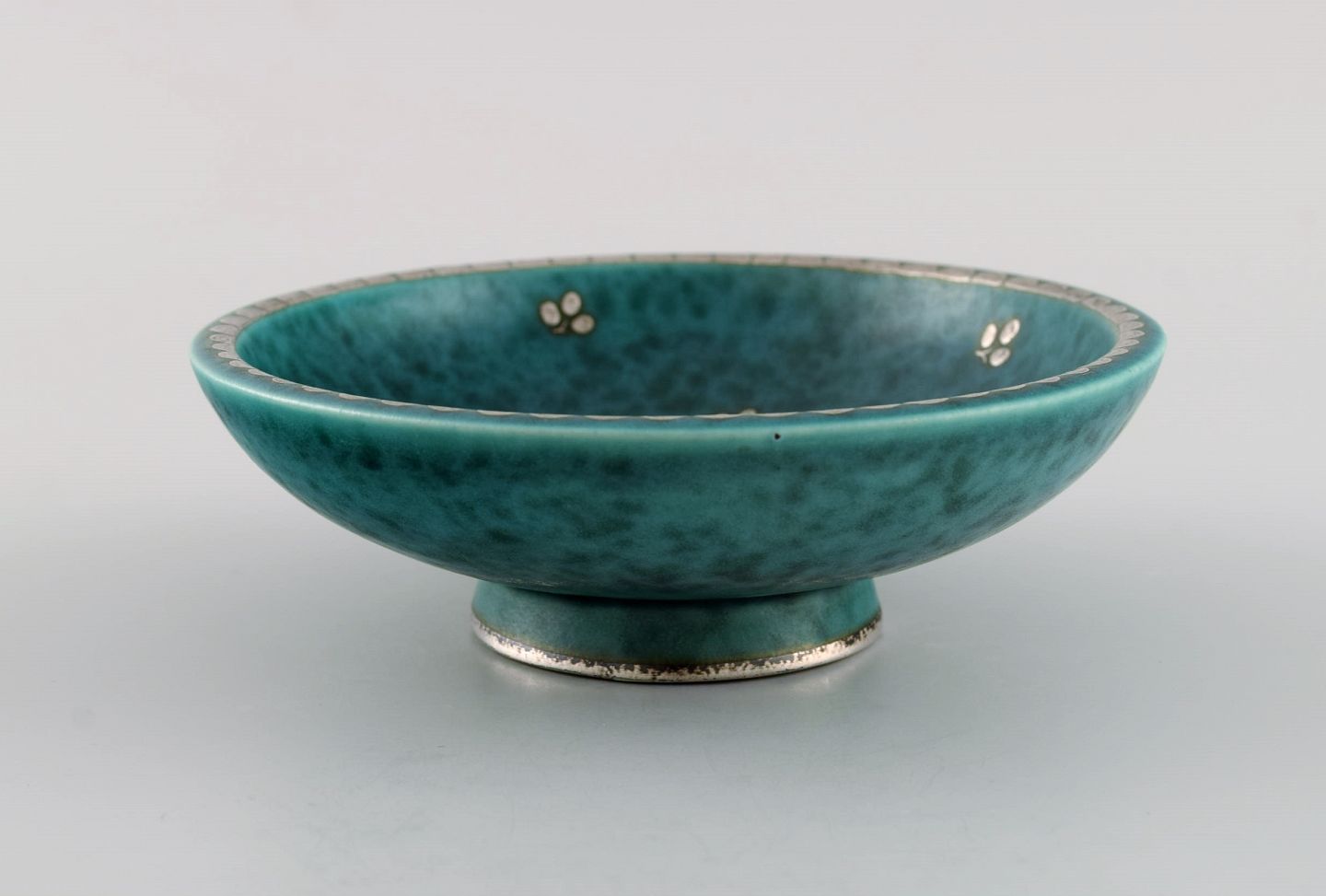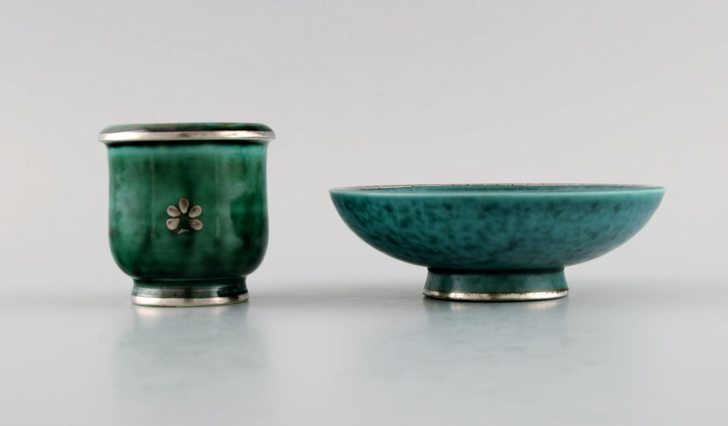 Wilhelm Kåge (1889-1960) for Gustavsberg. Argenta vase og skål i glaseret keramik. Smuk glasur i grønne nuancer med sølvindlæg. Midt 1900-tallet.