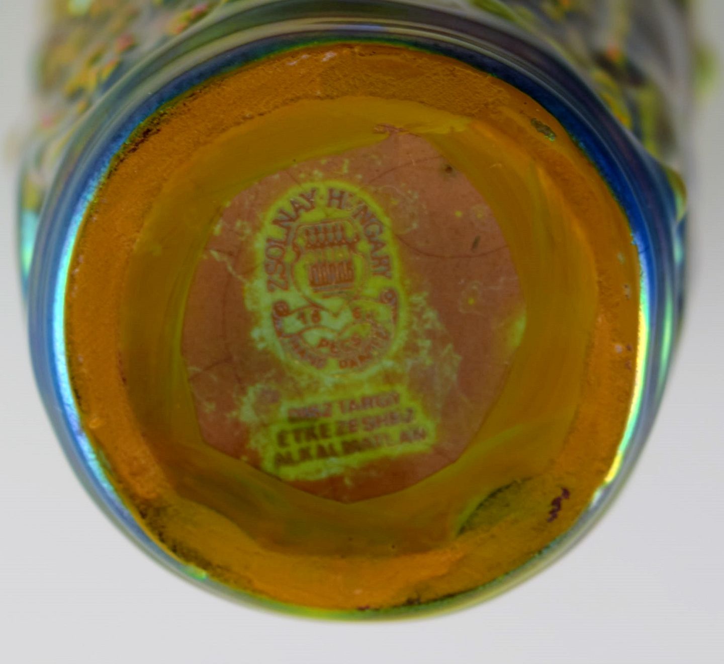 Zsolnay vase i glaseret keramik modelleret med kvinder der plukker druer. Smuk lustreglasur. Midt 1900-tallet. Måler: 15,5 x 8 cm. I flot stand. Stemplet.