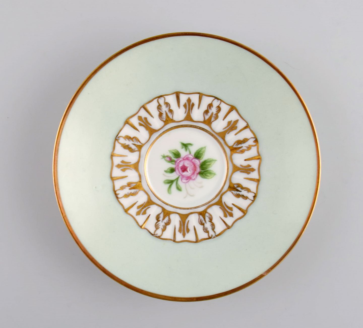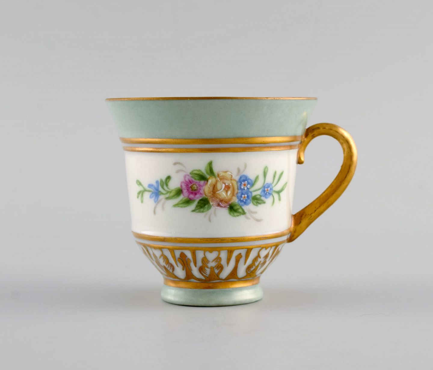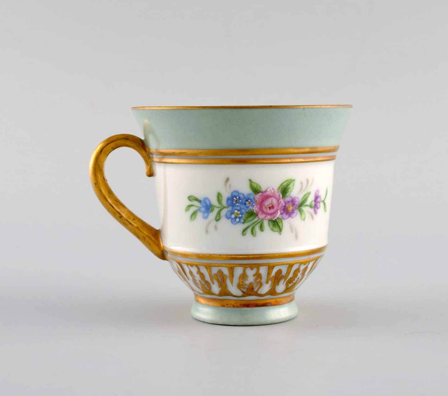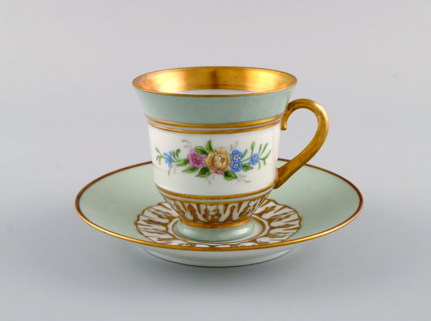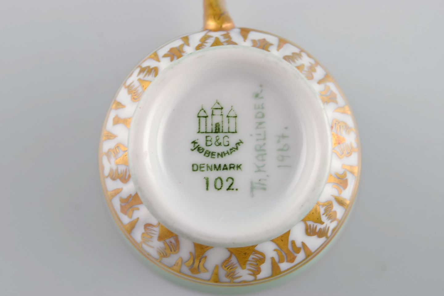 Syv Bing & Grøndahl kaffekopper med underkopper. Blomster og gulddekoration på lysegrøn baggrund. 1960'erne. Koppen måler: 7,5 x 7,3 cm. Underkop diameter: 13,5 cm. I flot stand. Stemplet. 1. Sortering.