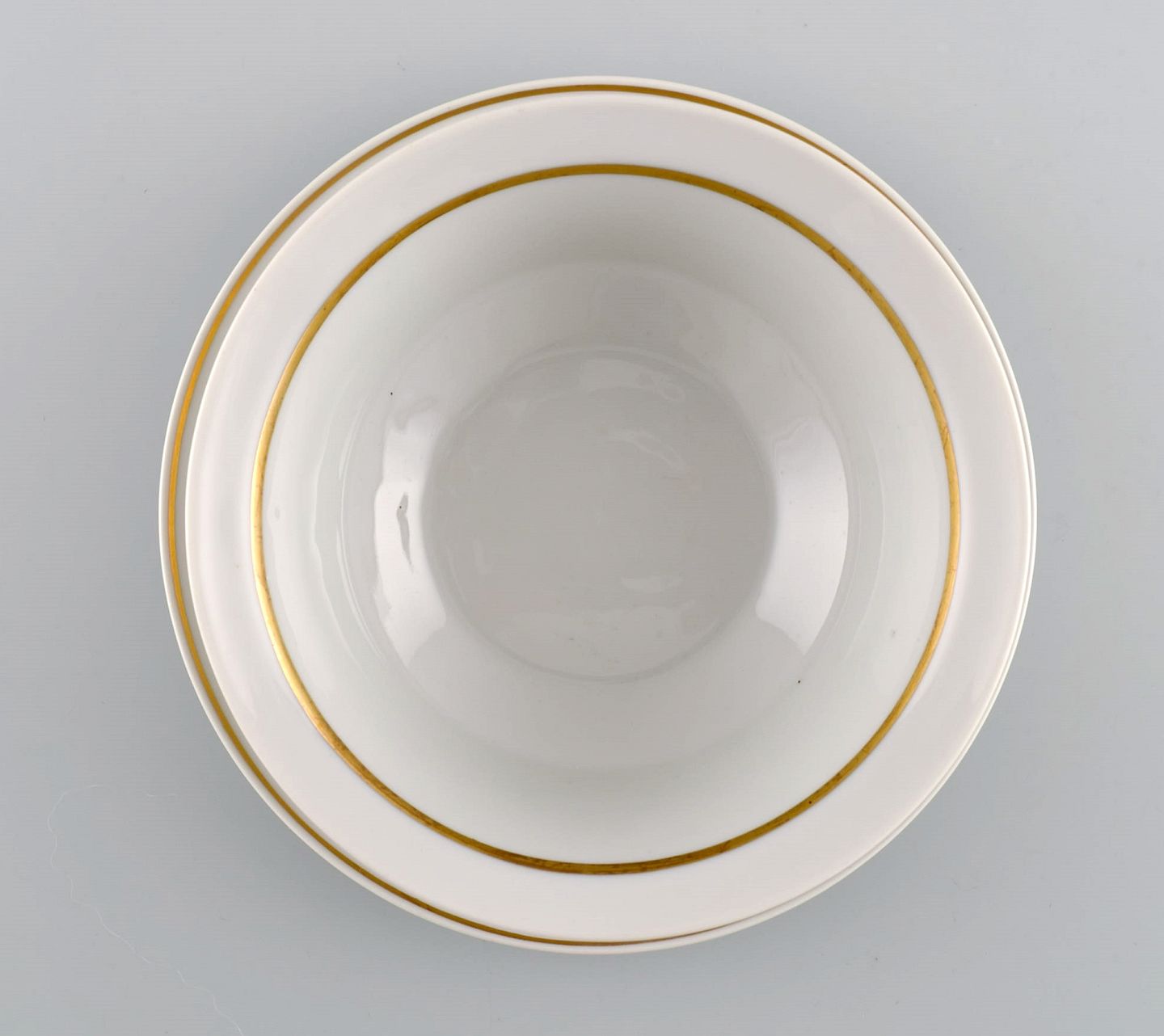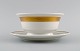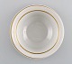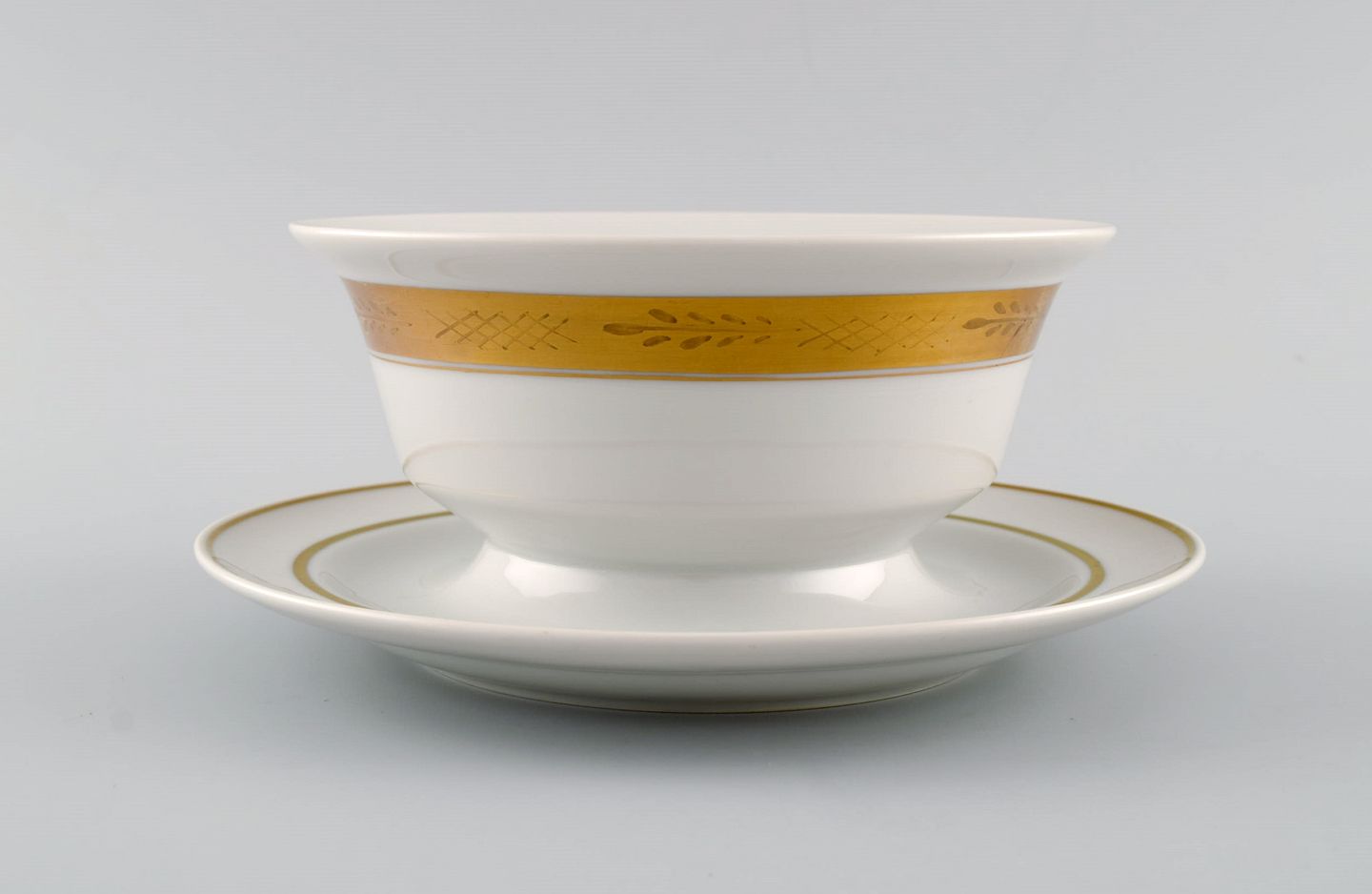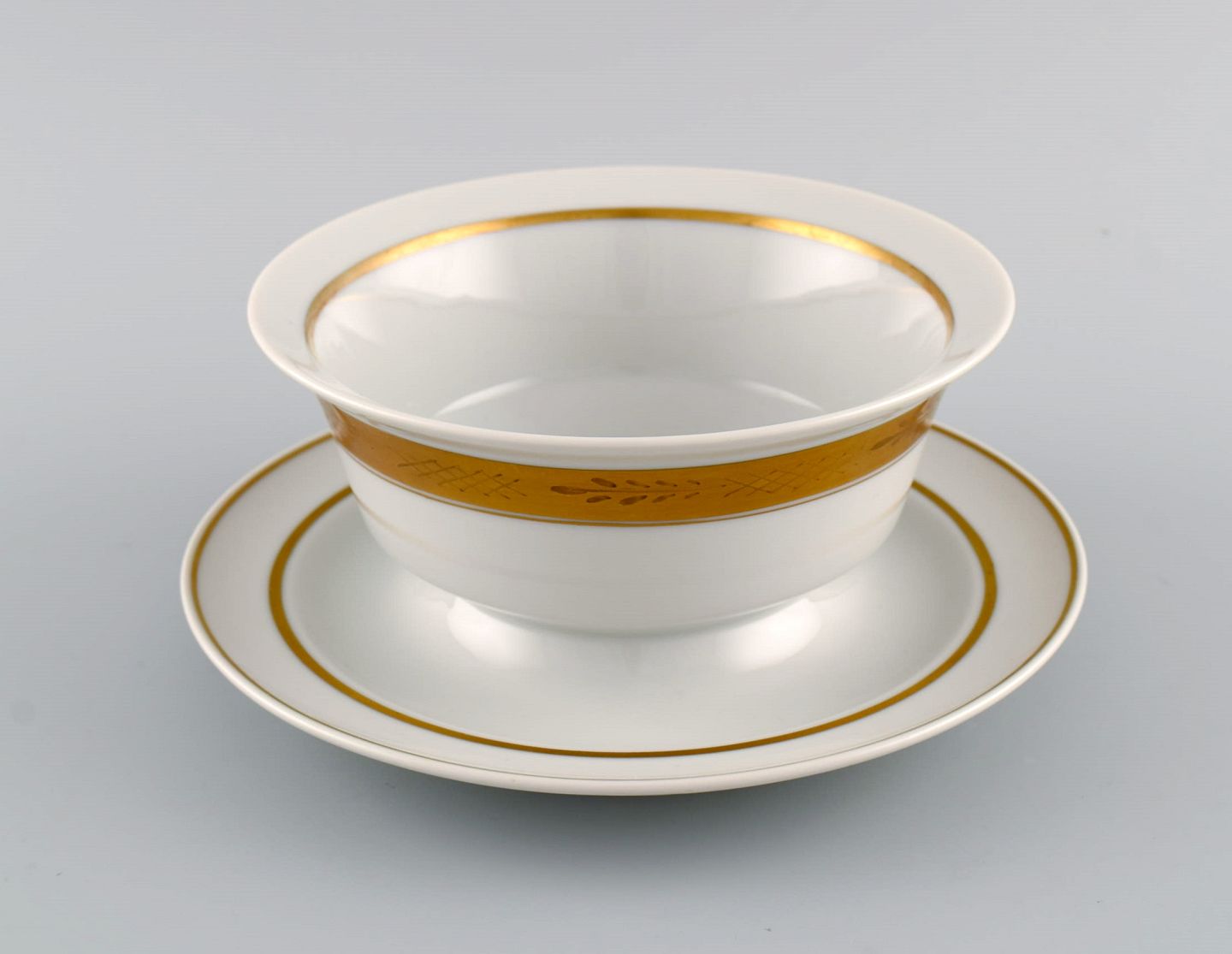 Royal Copenhagen stel nr. 607. Sovseskål i porcelæn. Guldkant med bladværk. Modelnummer 607/9580. Dateret 1944. Måler: 20 x 9 cm. I flot stand. Stemplet. 1. Sortering.