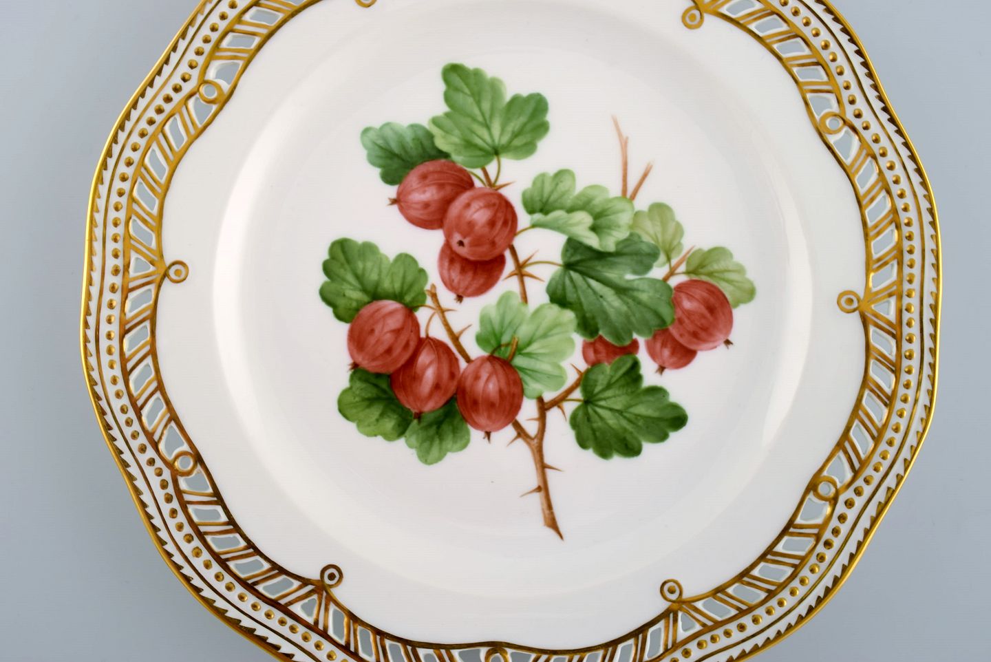 Royal Copenhagen Flora Danica frugttallerken i gennembrudt porcelæn med håndmalede bær og gulddekoration. Modelnummer 429/3584. Dateret 1963.