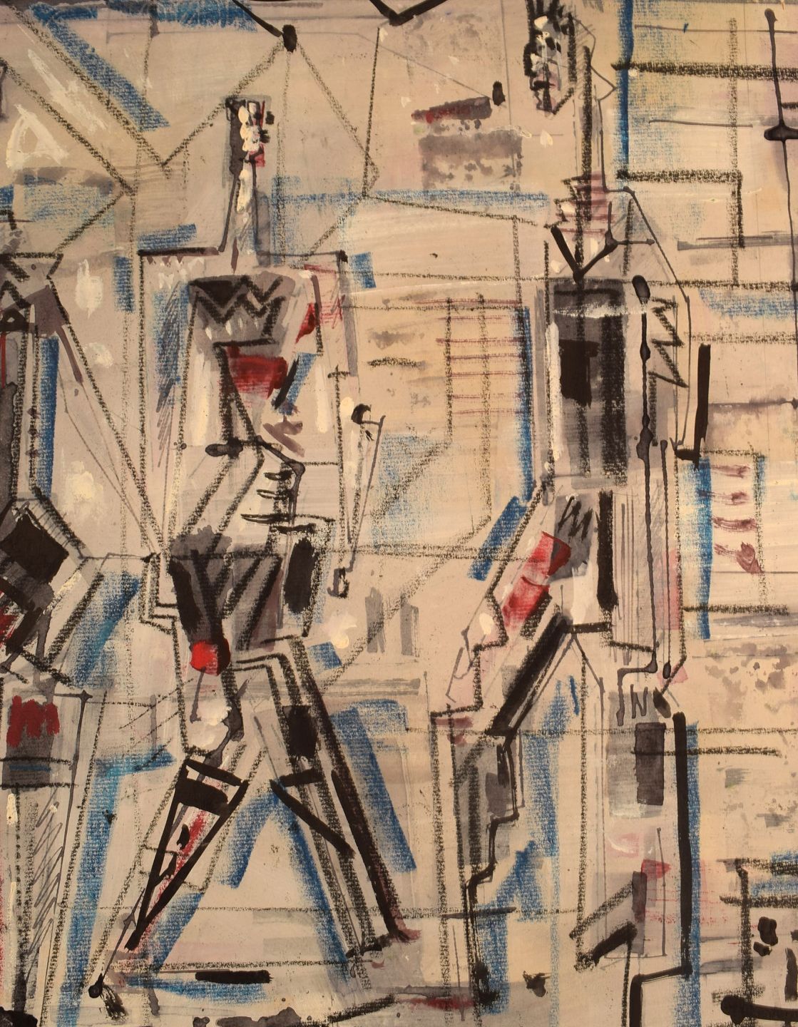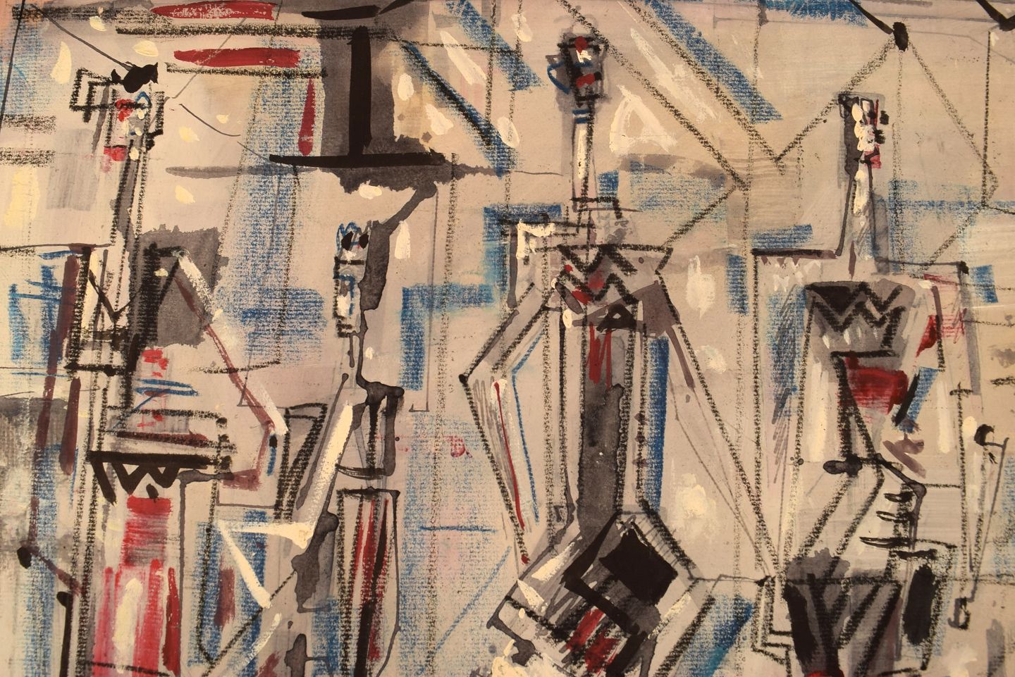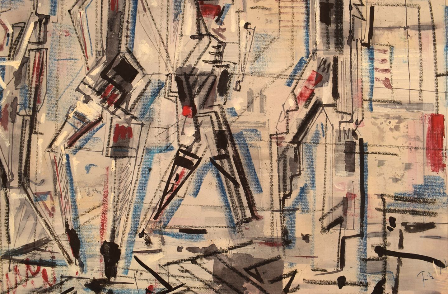 Fritz Huhnen (1895-1981), tysk kunstner. Mixed media på lærred. Fem personer. Midt 1900-tallet. Lærredet måler: 60 x 49 cm. Rammen måler: 1,5 cm. I flot stand. Signeret.