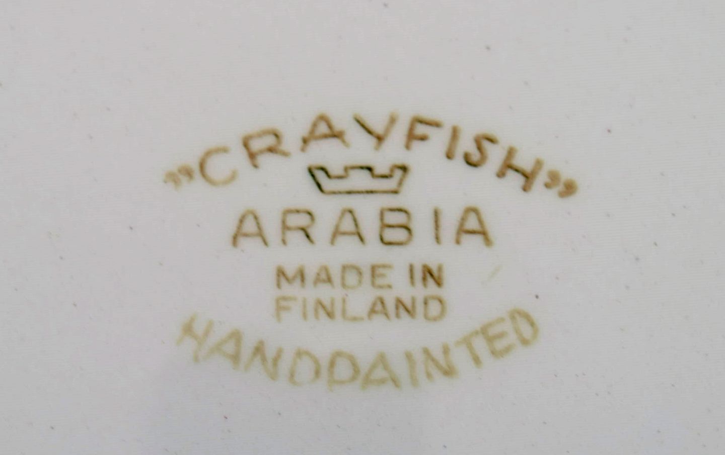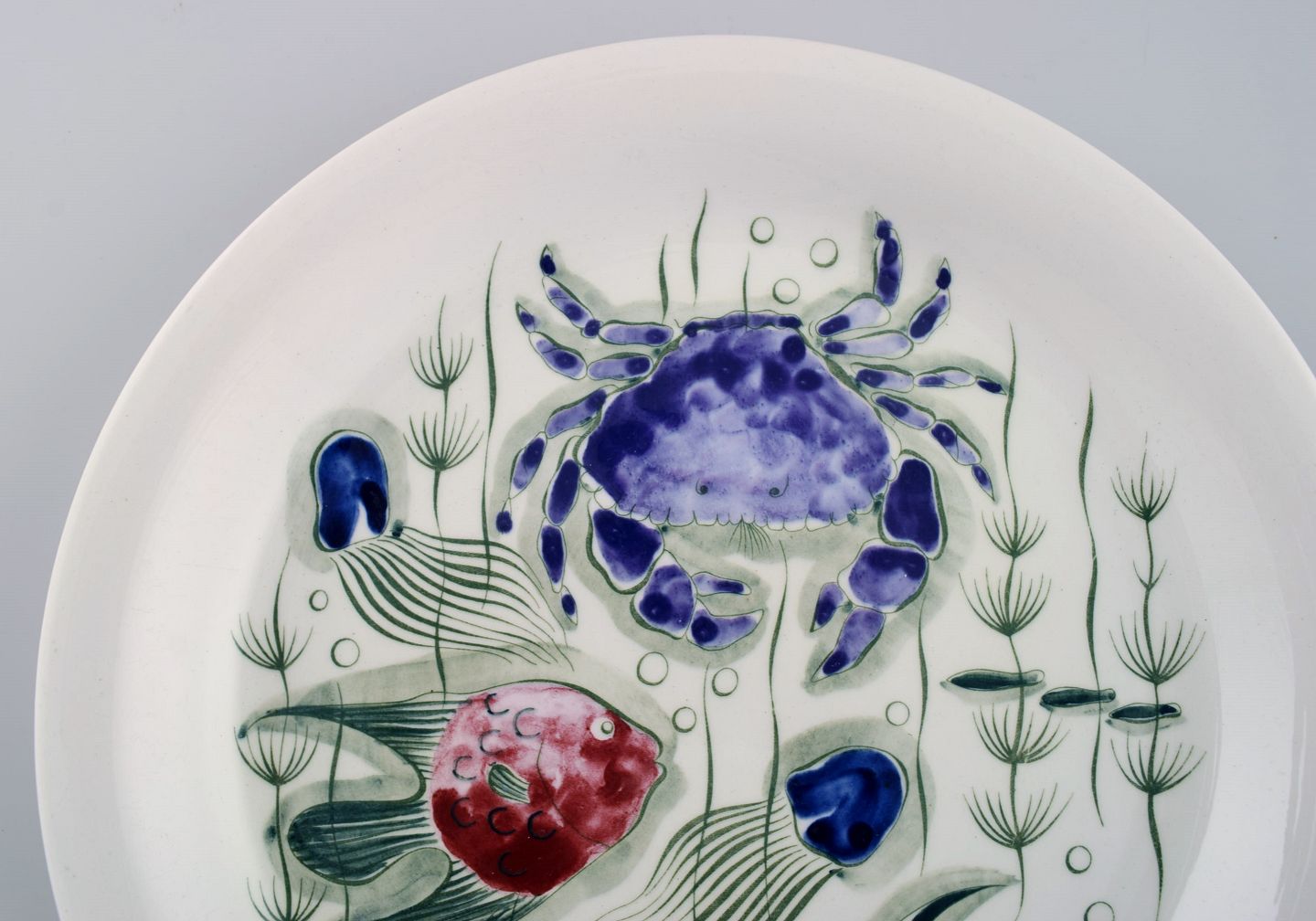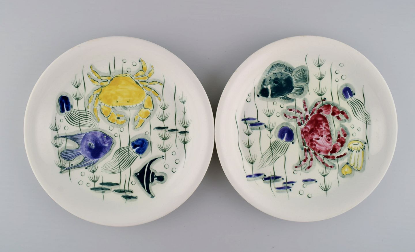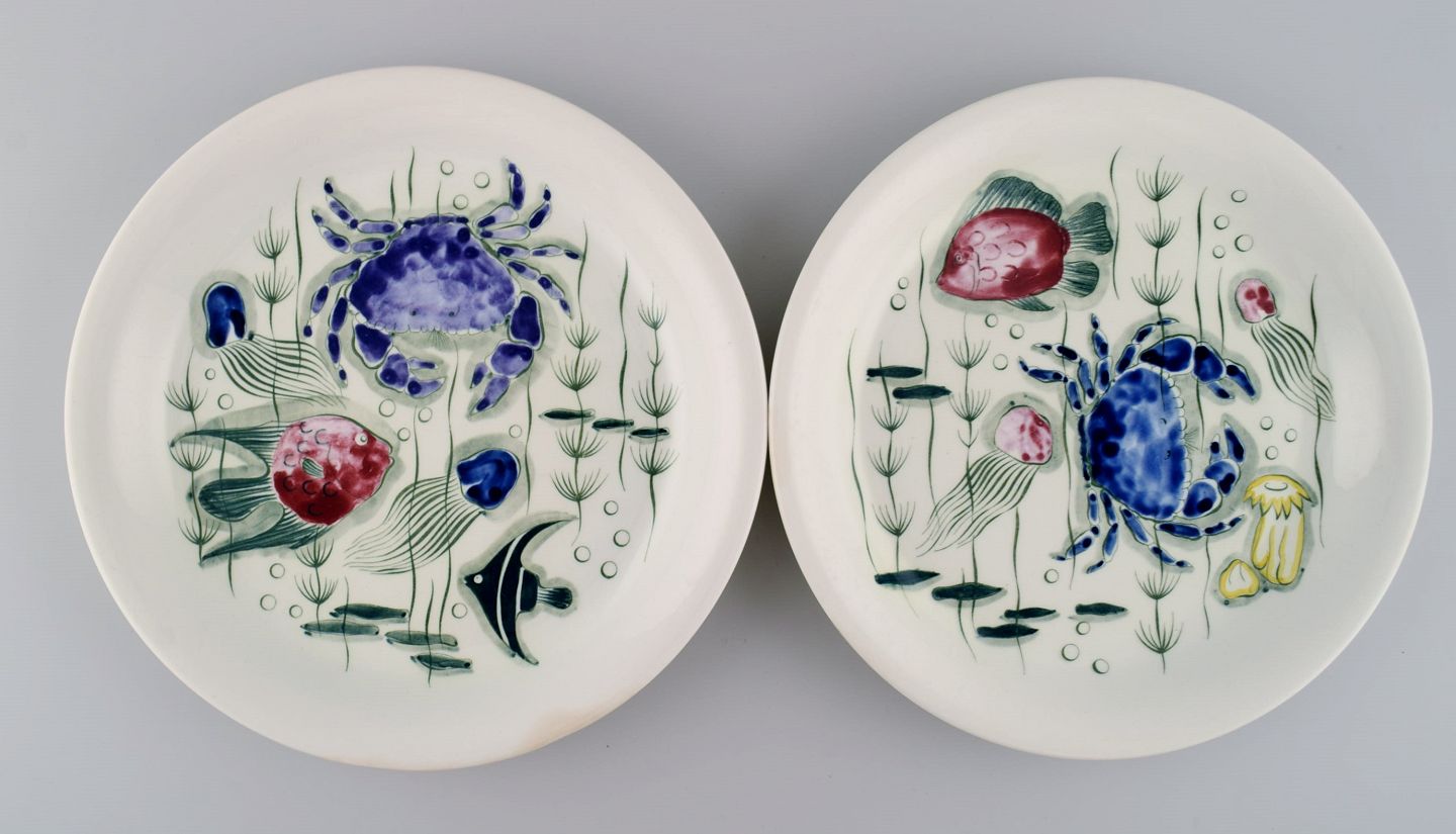 Anja Juurikkala for Arabia. Four "Crayfish" dinner plates in hand-painted stoneware. Underwater scene with fish and crabs. Mid 20th century. Diameter: 25 cm. In excellent condition. Stamped.