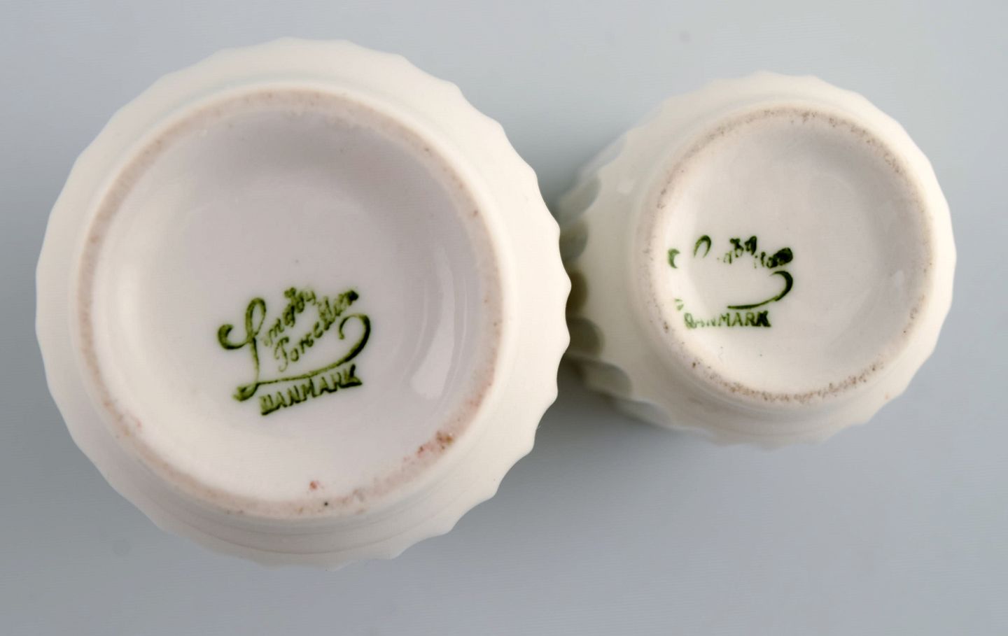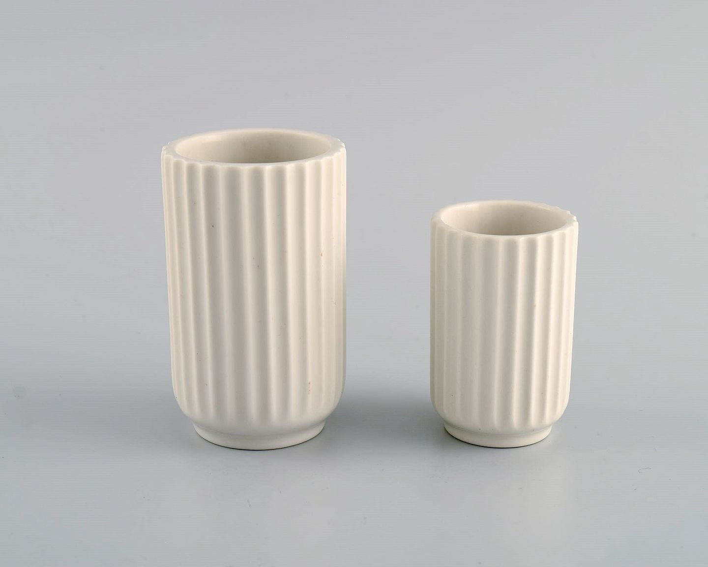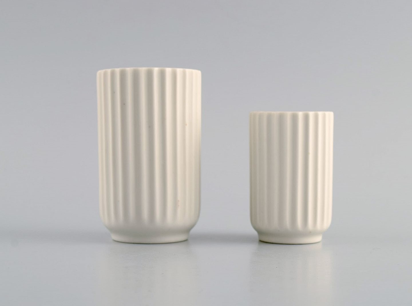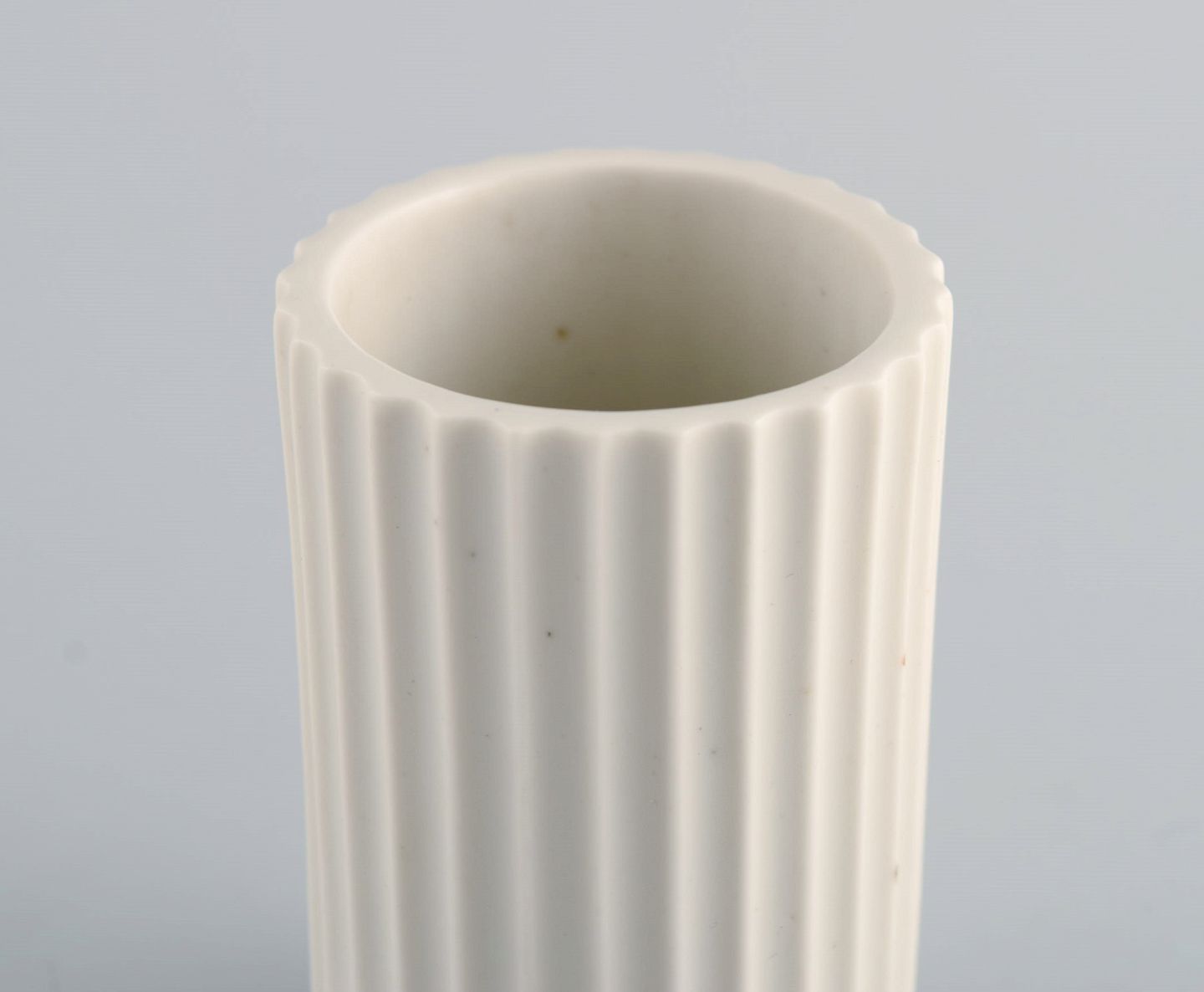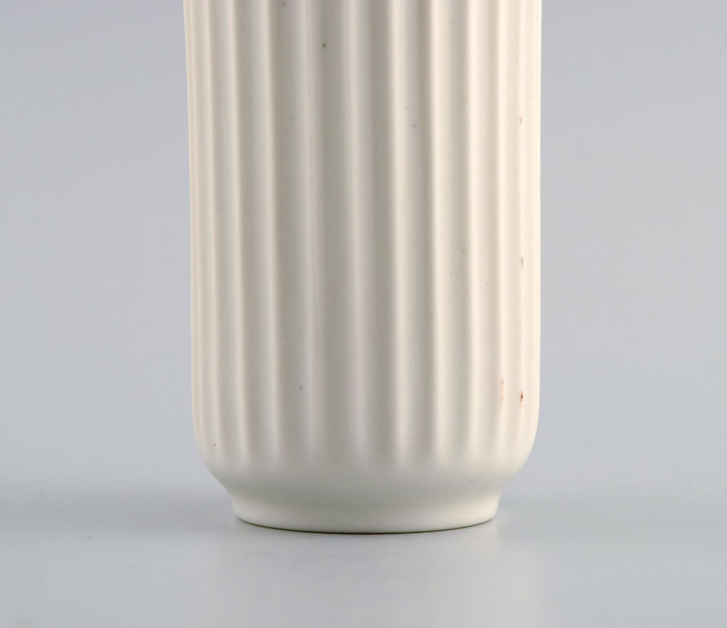 Et par tidlige Lyngby porcelænsvaser med kanneleret korpus. Dateret 1936-1940. Måler: 8,2 x 5 cm. I flot stand. Stemplet.