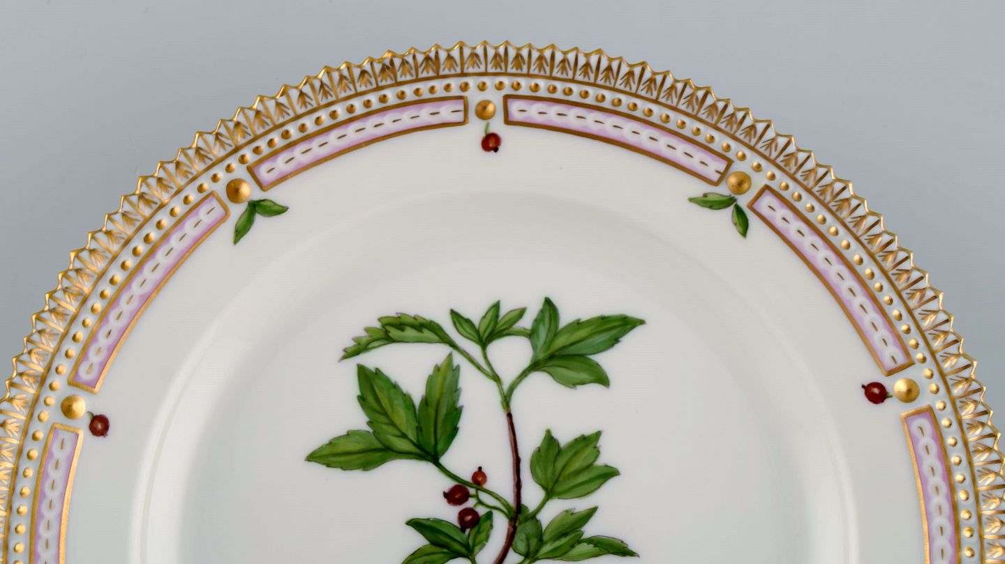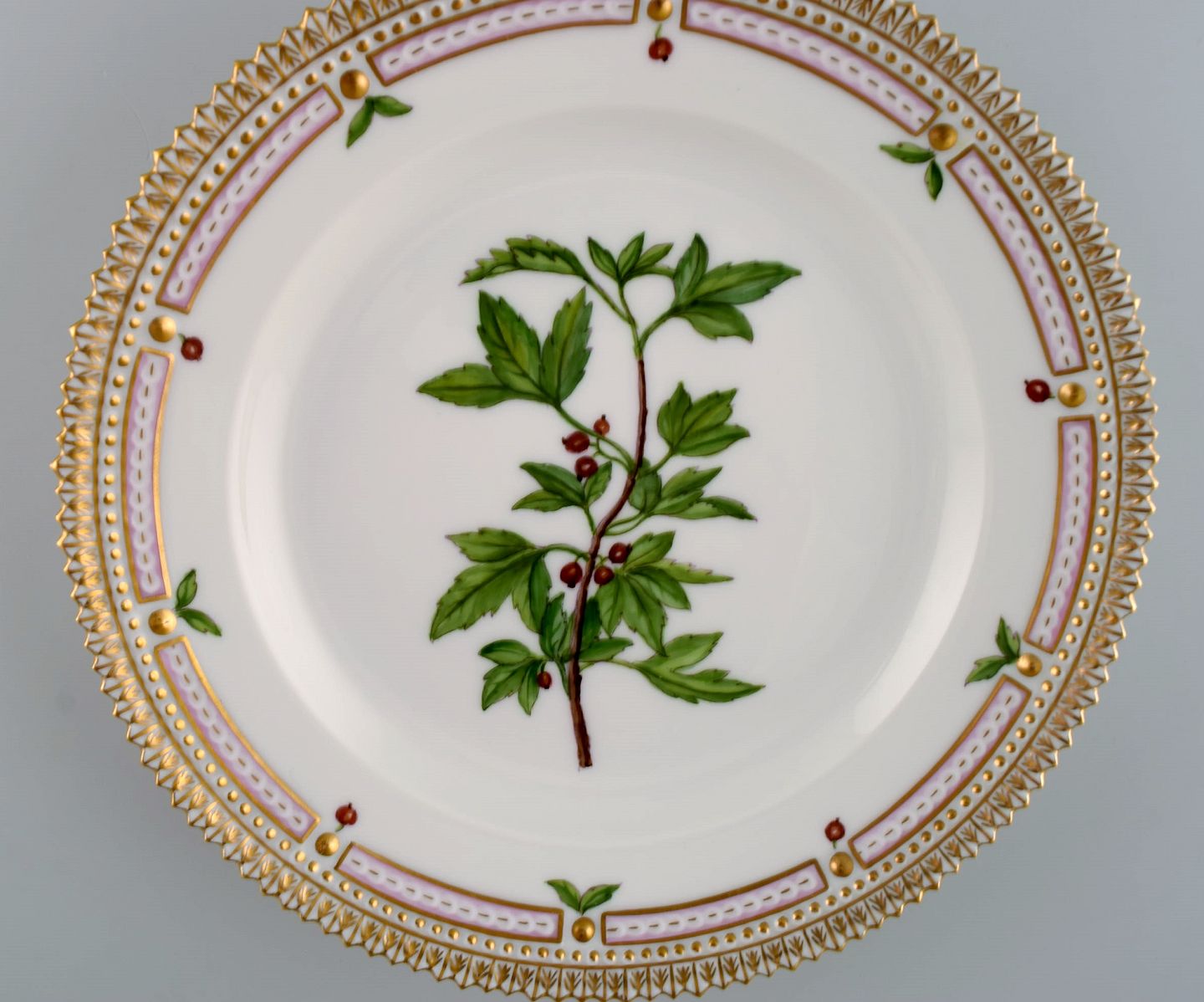 Royal Copenhagen Flora Danica salattallerken i håndmalet porcelæn med blomster og gulddekoration. Modelnummer 20/3573.