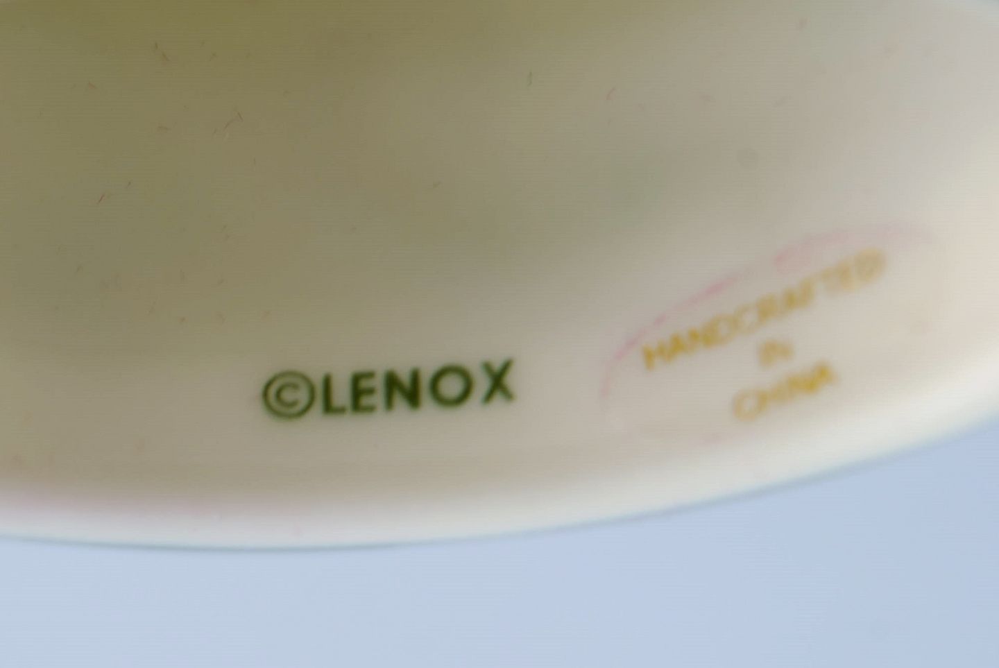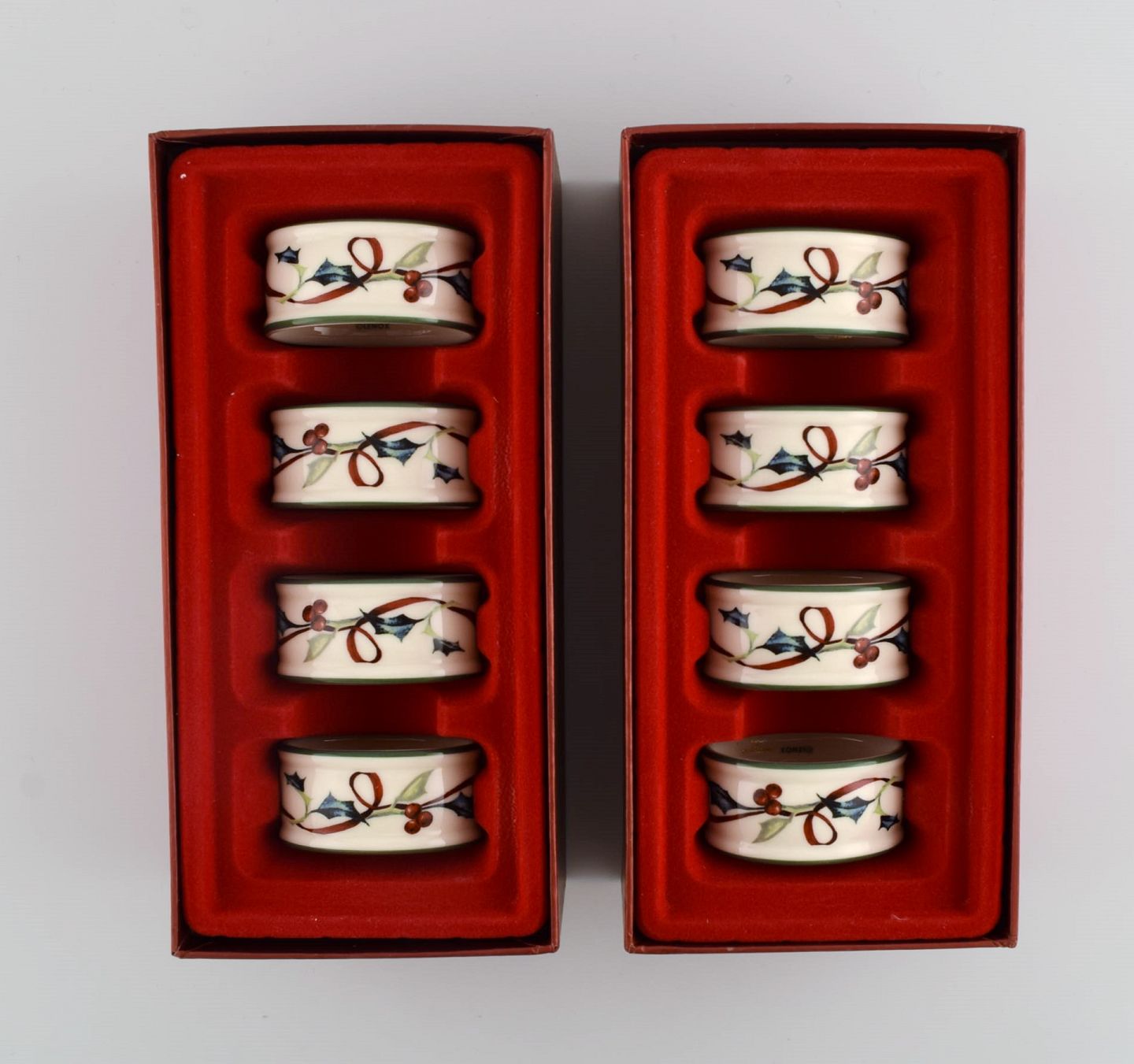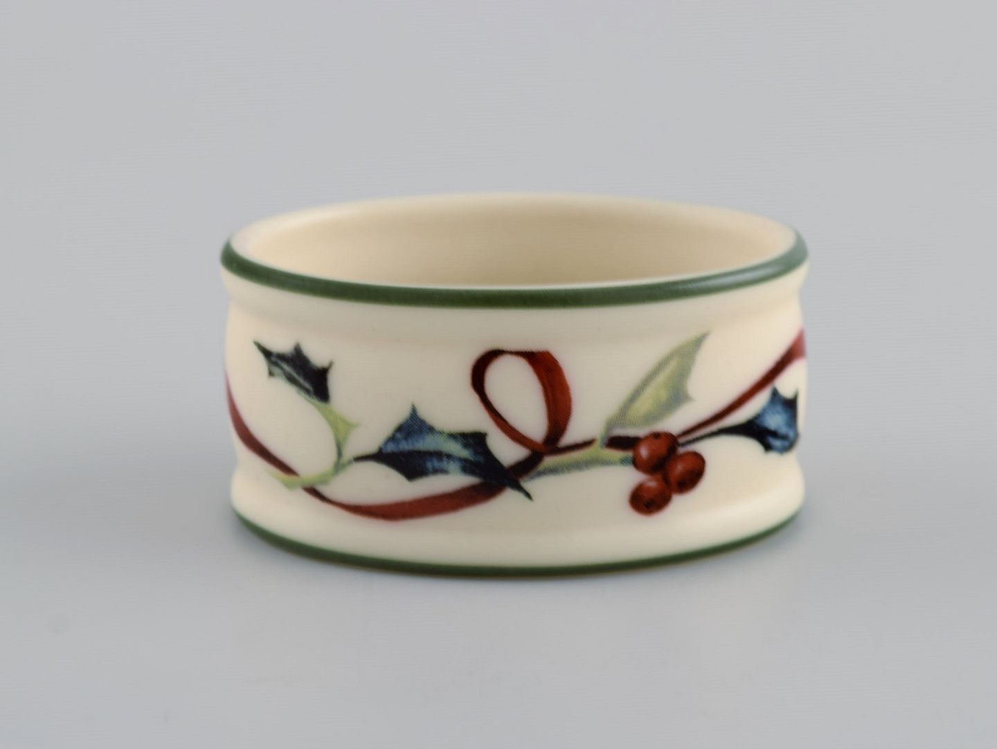 Catherine McClung for Lenox. "Winter greetings everyday". Eight napkin rings in glazed stoneware decorated with mistletoe and red ribbon. Approx. 2000.
