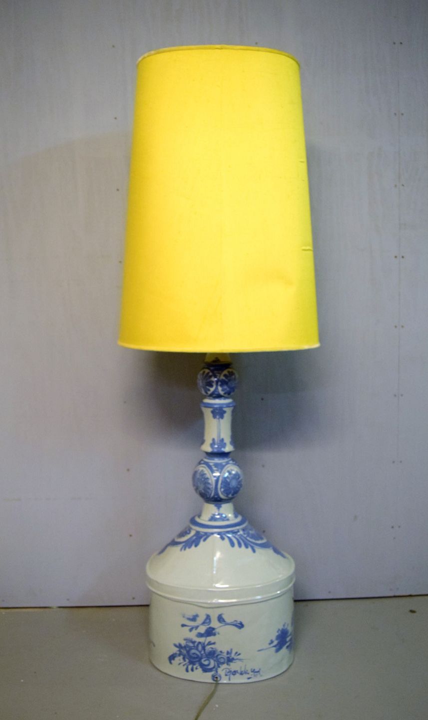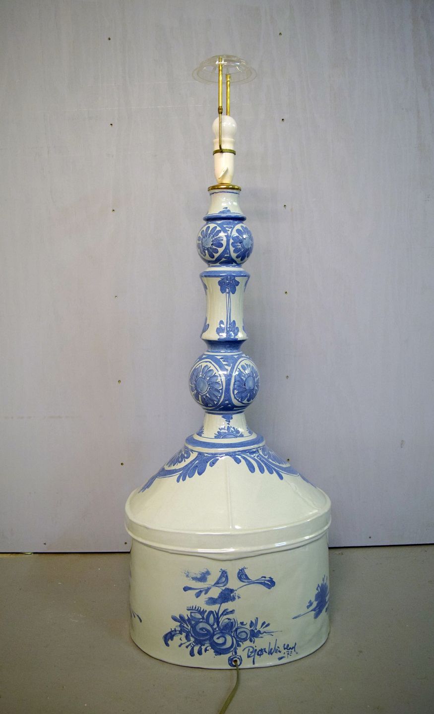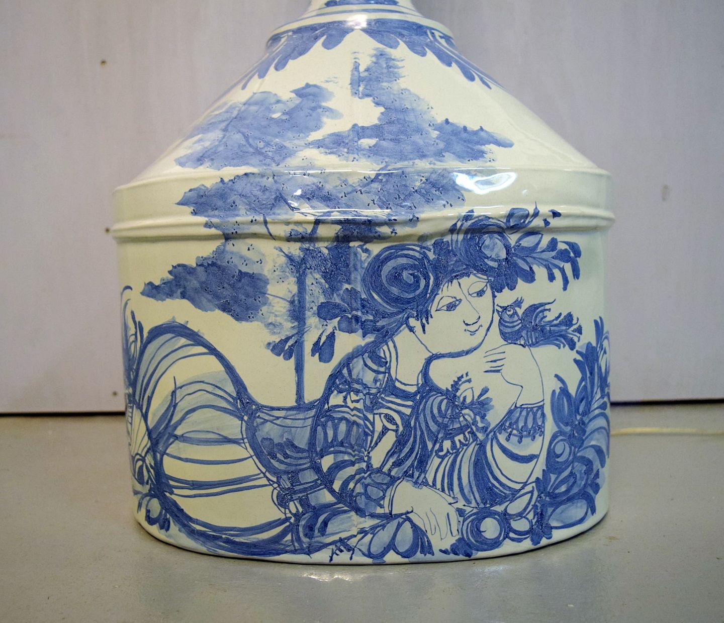 Bjørn Wiinblad (1918-2006), Danmark. Kolossal unika gulvlampe i blåglaseret keramik, dekoreret med ung kvinde i naturen og blomster ornamentik. Original gul skærm. Dateret 1973.