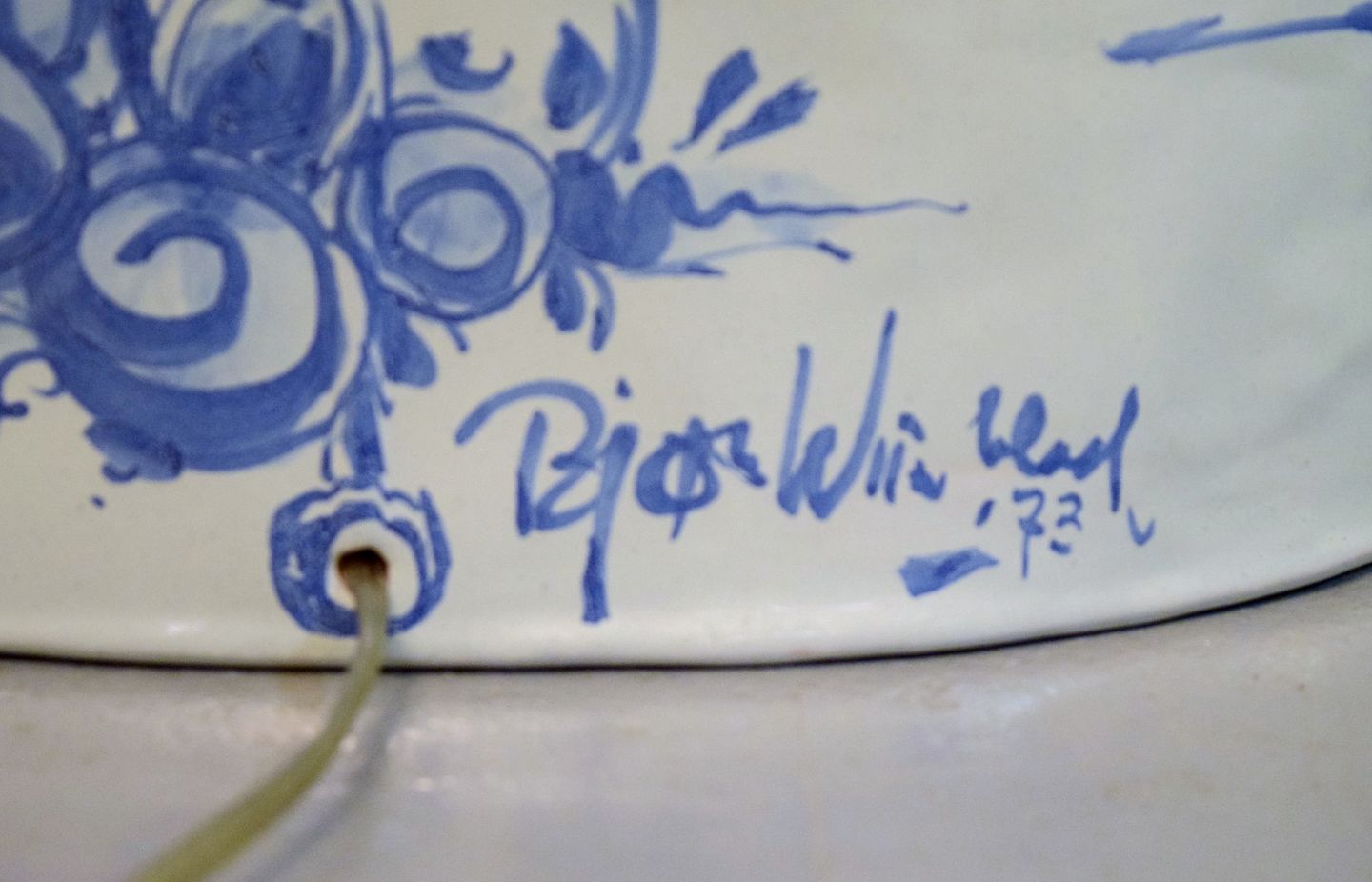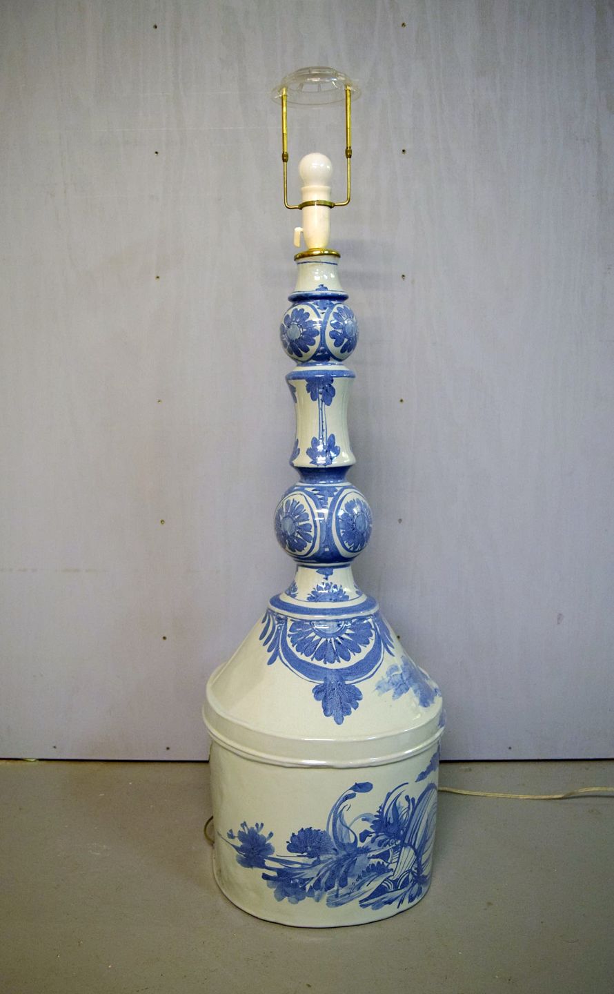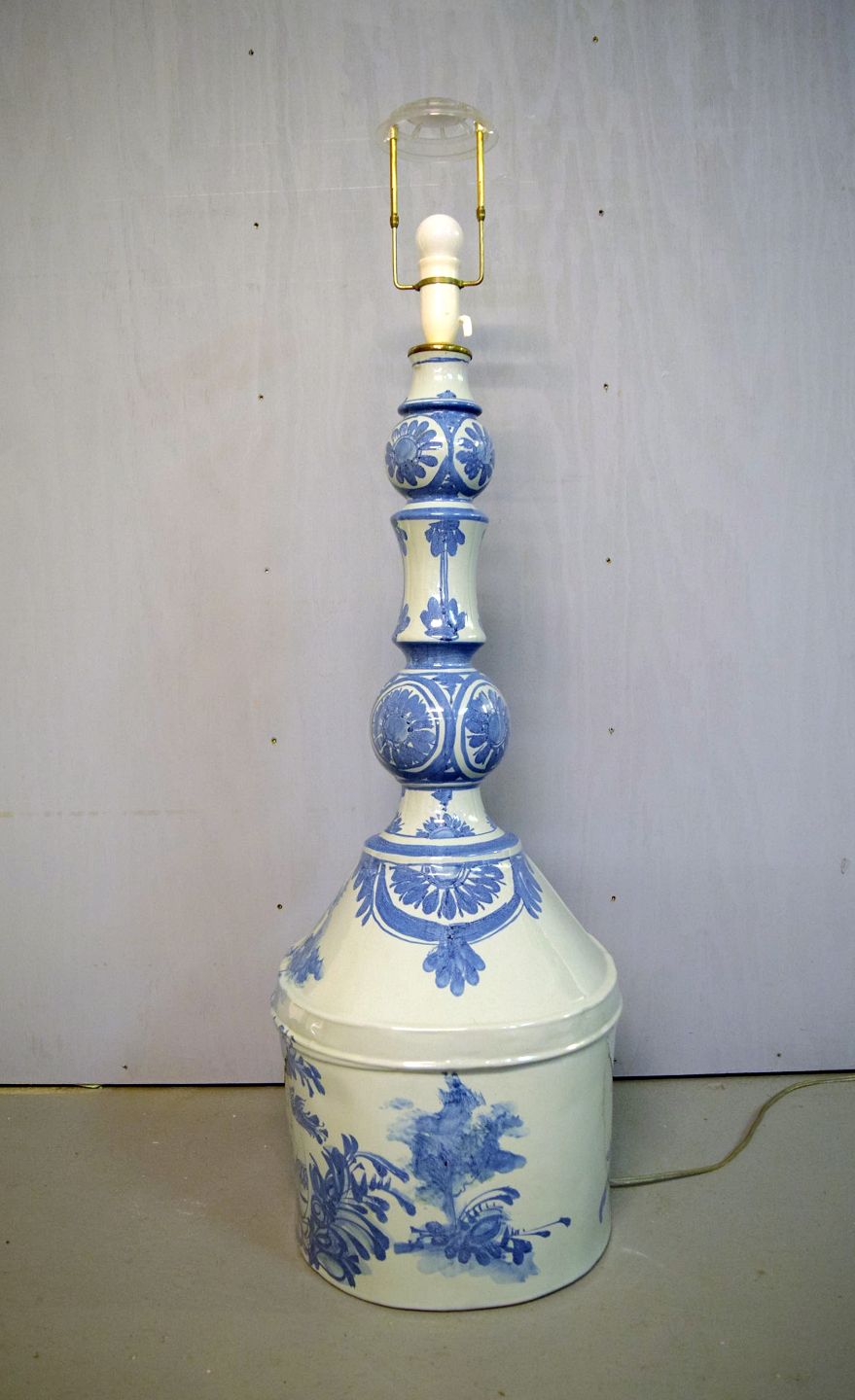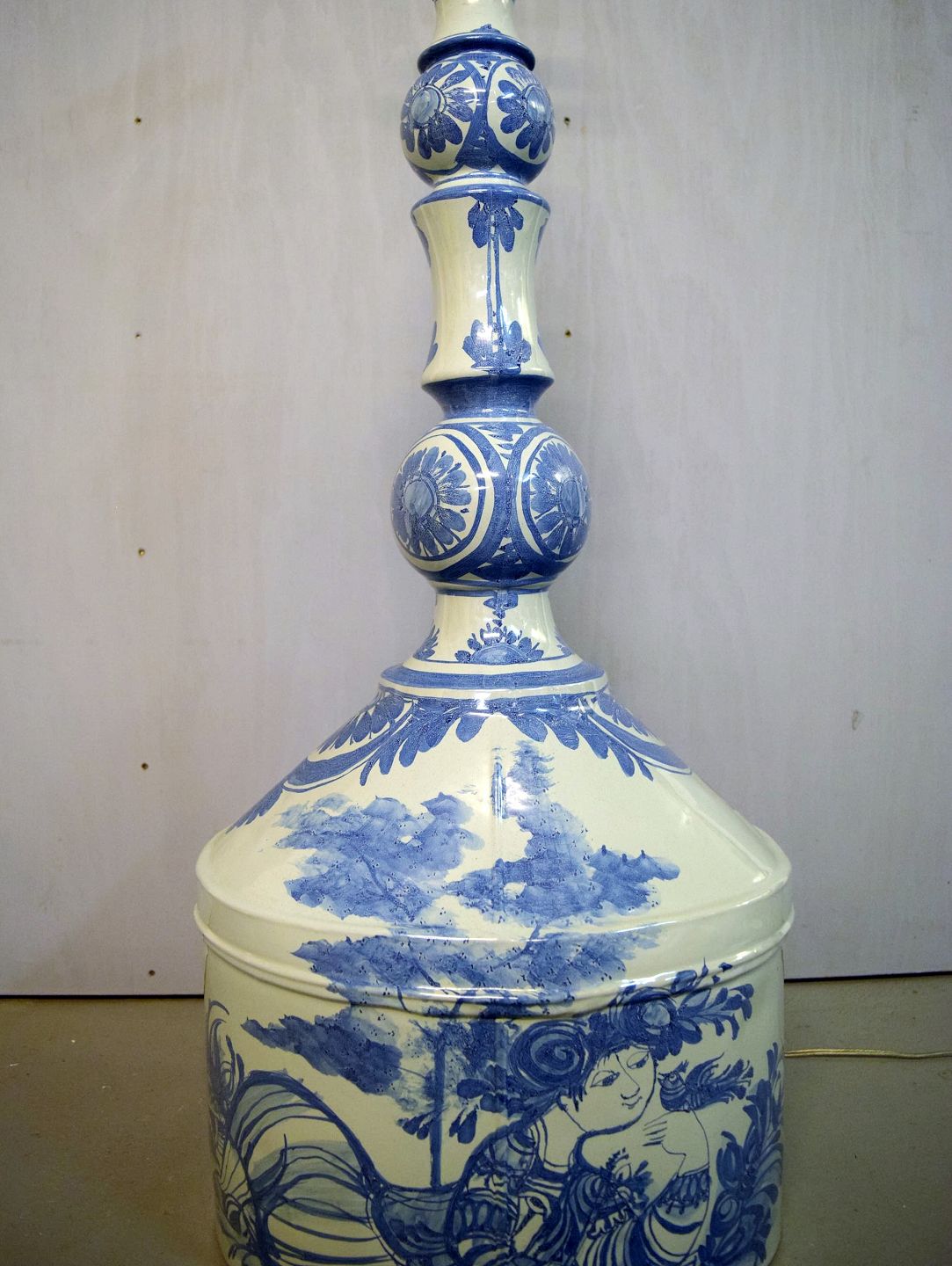 Bjørn Wiinblad (1918-2006), Danmark. Kolossal unika gulvlampe i blåglaseret keramik, dekoreret med ung kvinde i naturen og blomster ornamentik. Original gul skærm. Dateret 1973.