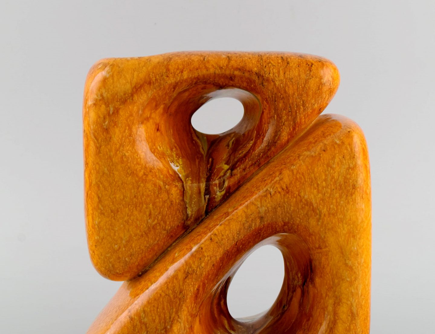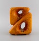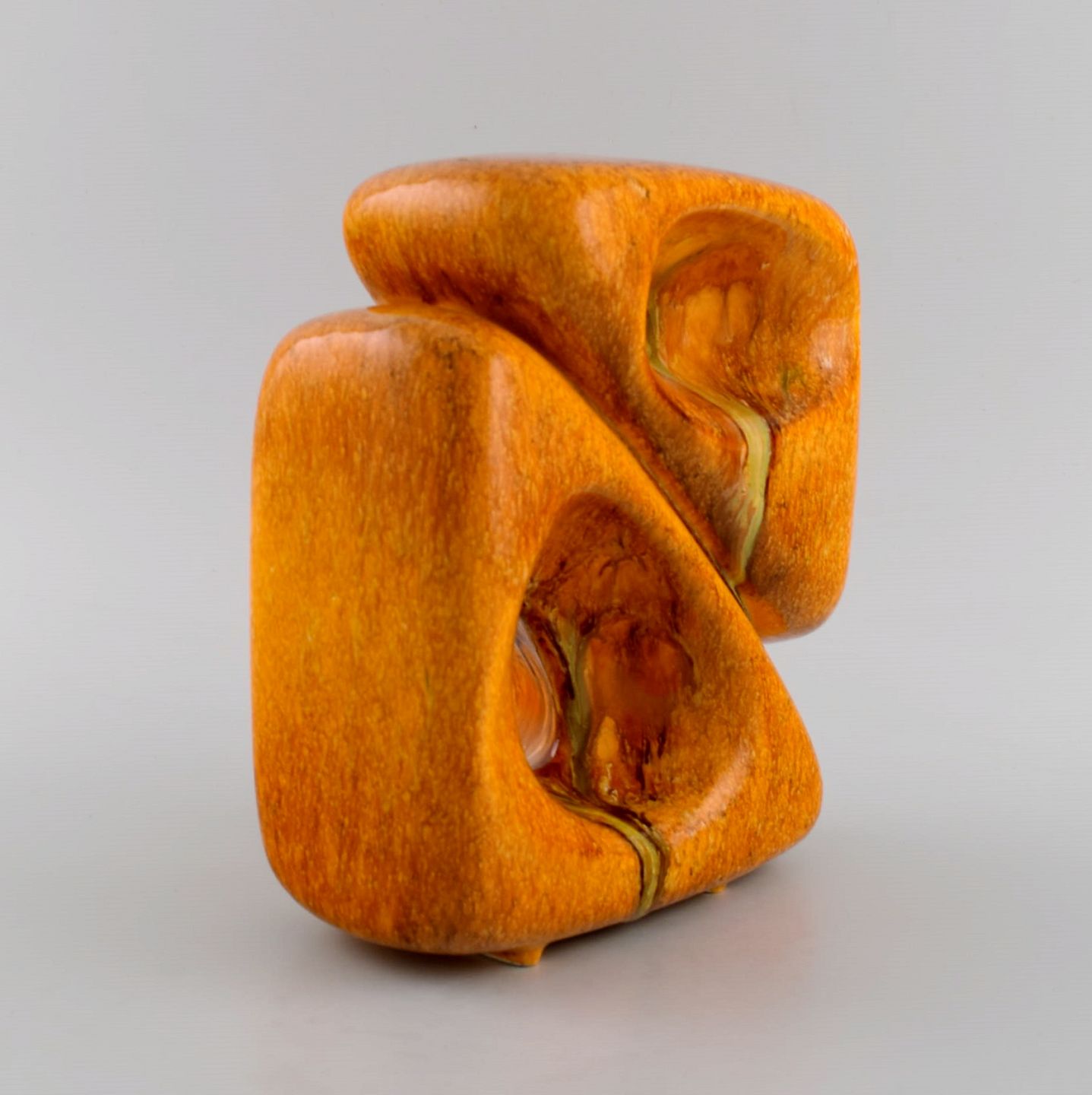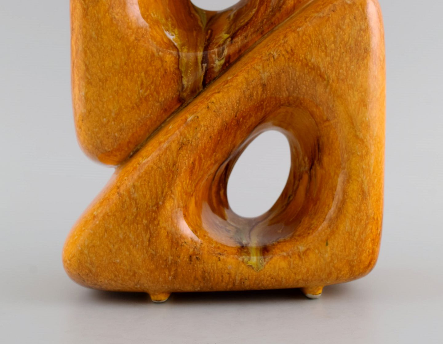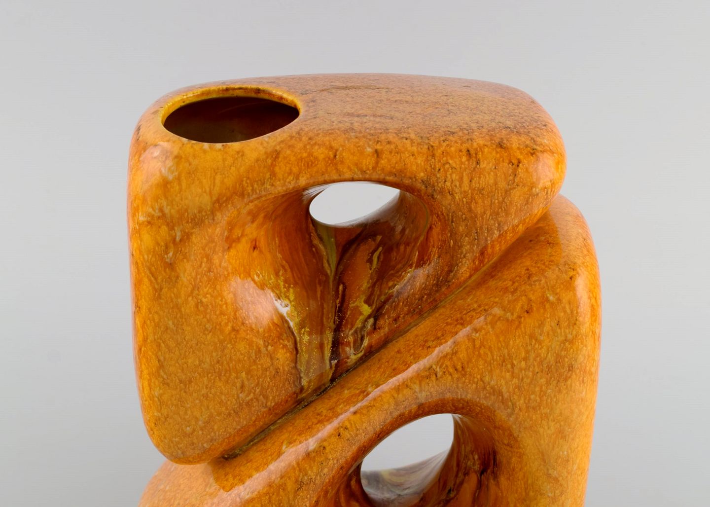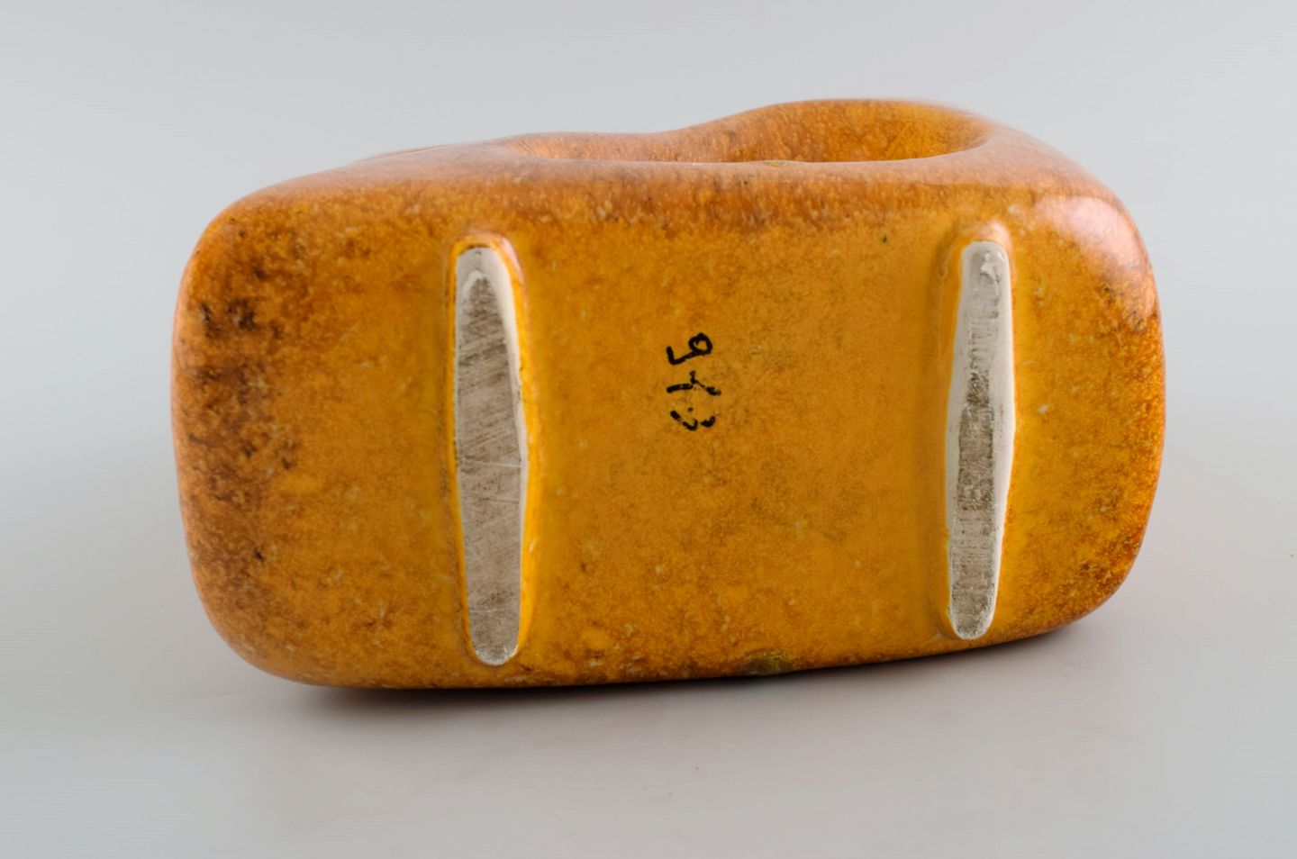 Organisk formet freeform vase i glaseret stentøj. Smuk glasur i sennepsgule nuancer. Italiensk design, 1970'erne. Måler: 19 x 16,5 cm. I flot stand. Signeret.