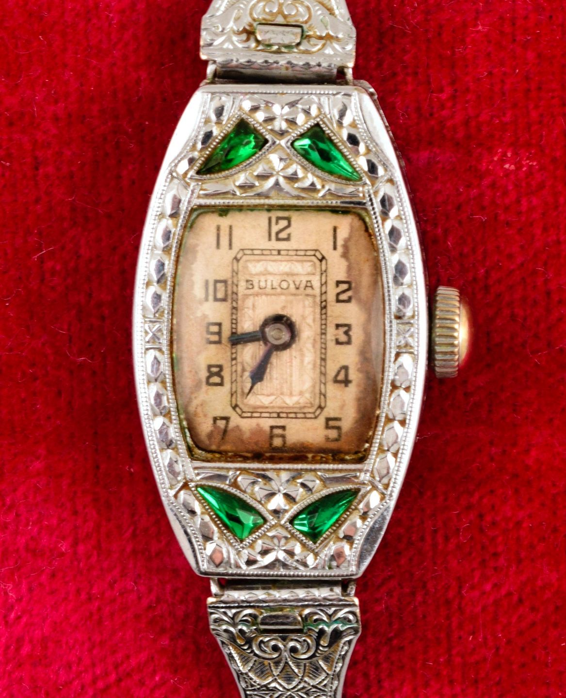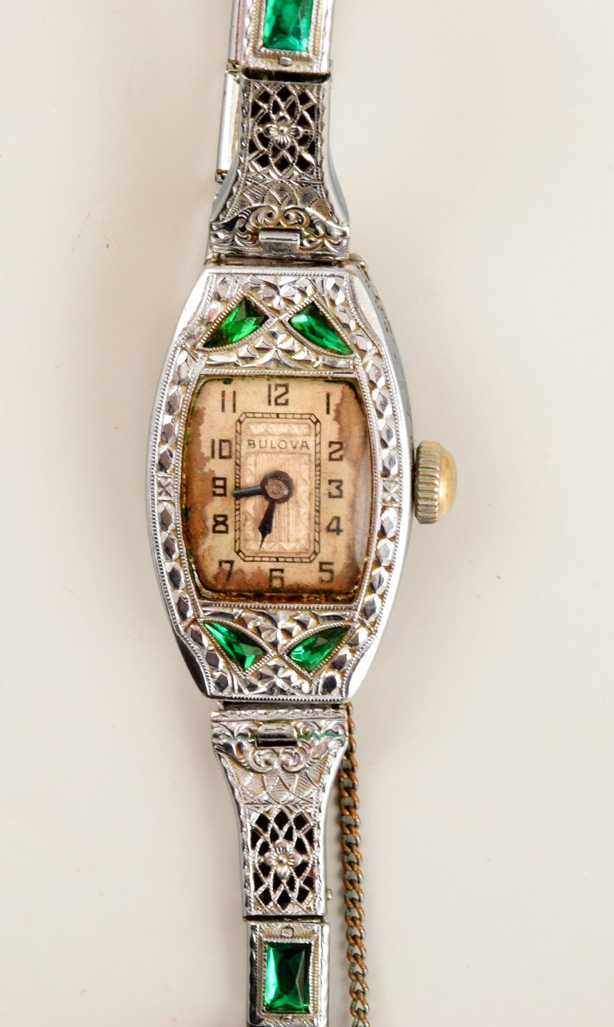 1929 BULOVA 'Miss Liberty' dame Art Deco armbåndsur, i 14 karat guld med grønne sten. Prydet med 15 ædelsten.
