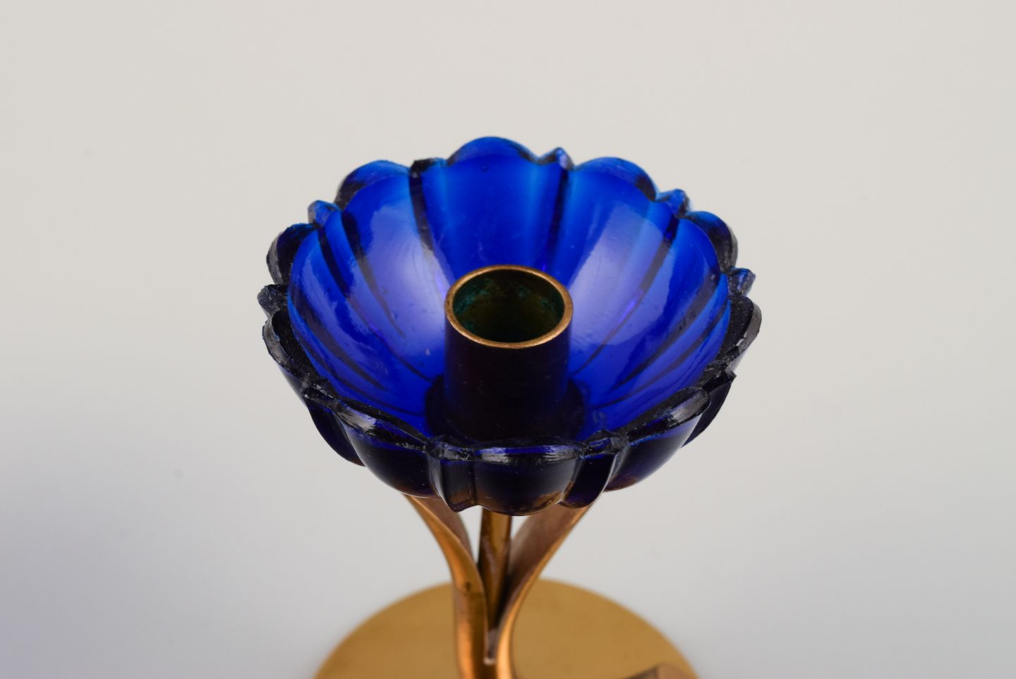 Gunnar Ander for Ystad Metall. Tre lysestager i messing og blåt kunstglas formet som blomster. 1950'erne.