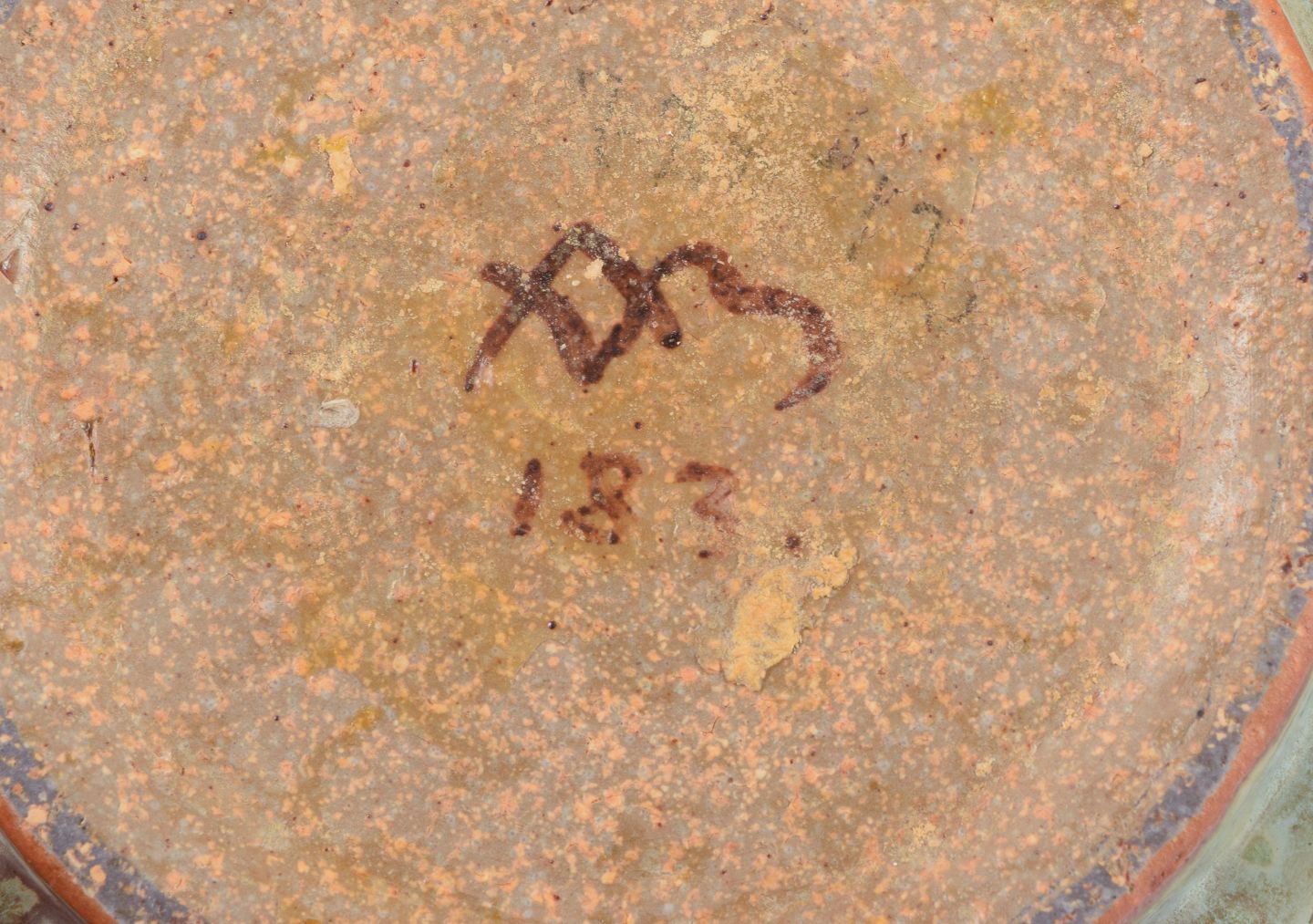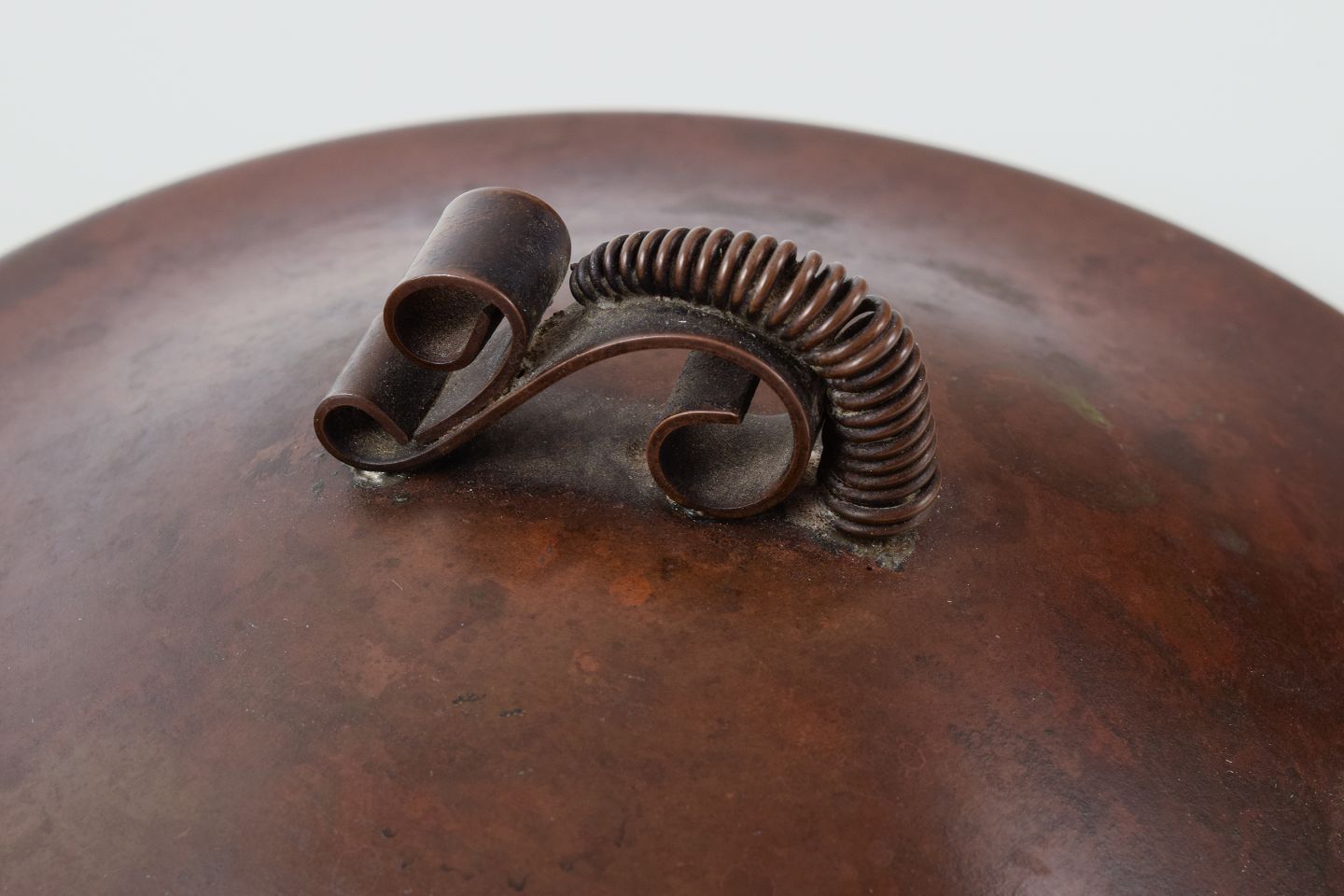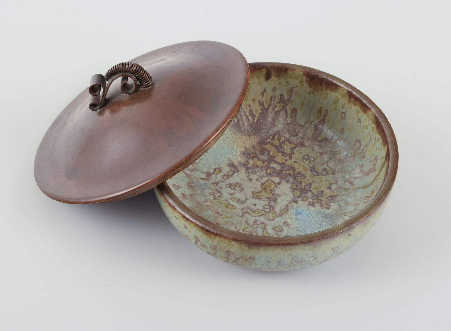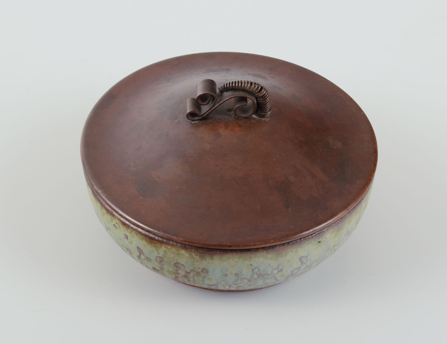 Arne Bang, Danmark. Art deco krukke i glaseret keramik med tilhørende bronzelåg. Smuk glasur i blågrønne nuancer. 1940'erne. Stemplet AB 183. I flot stand. Måler: 14,5 x H 8,5 cm.