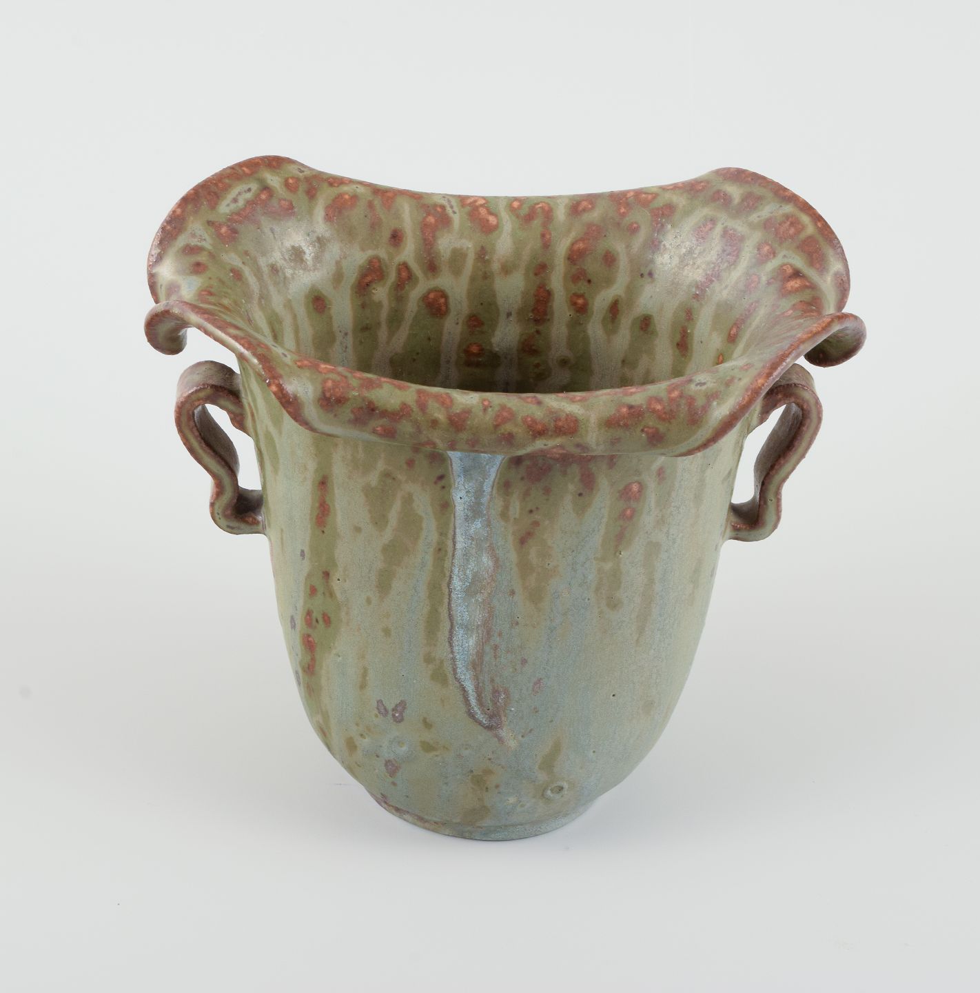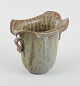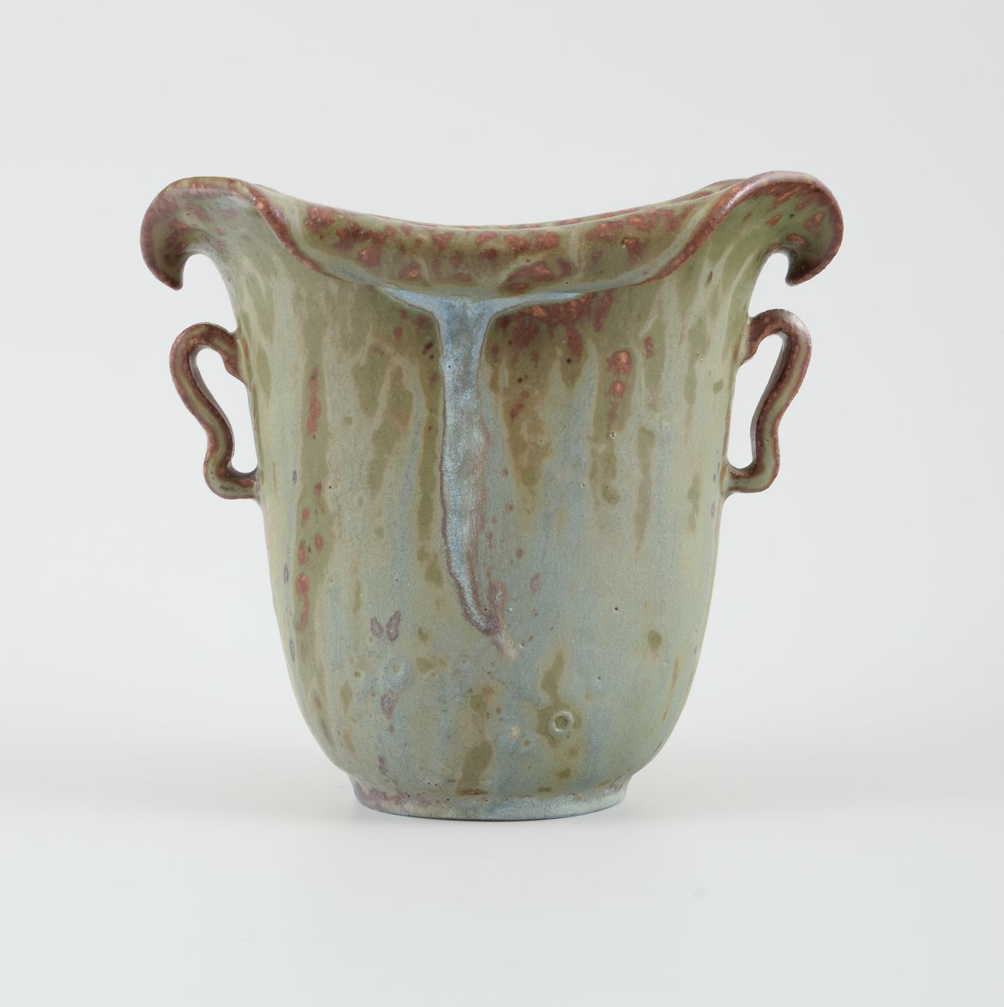 Arne Bang (1901-1983), Danmark. Vase i glaseret keramik med hanke. Modelnummer 76. Smuk glasur i grønne, brune og blå nuancer. 1940'erne.