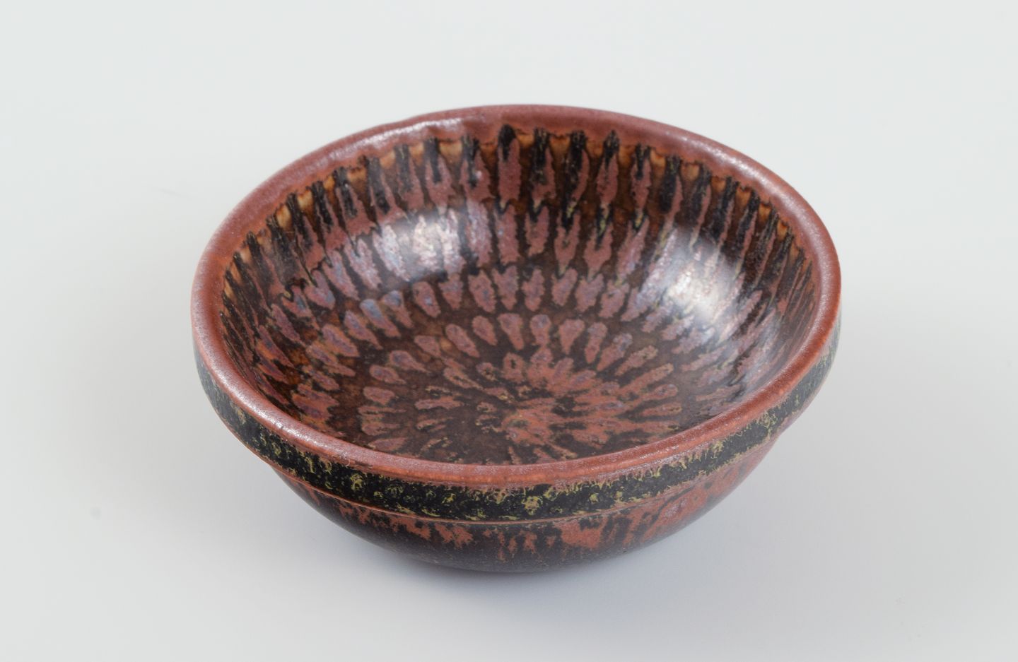 Stig Lindberg (1916-1982), Gustavsberg Studio hand, miniature keramikskål. Glasur i brune nuancer. Måler: D 6,3 cm. x H 2,5 cm. I perfekt stand.