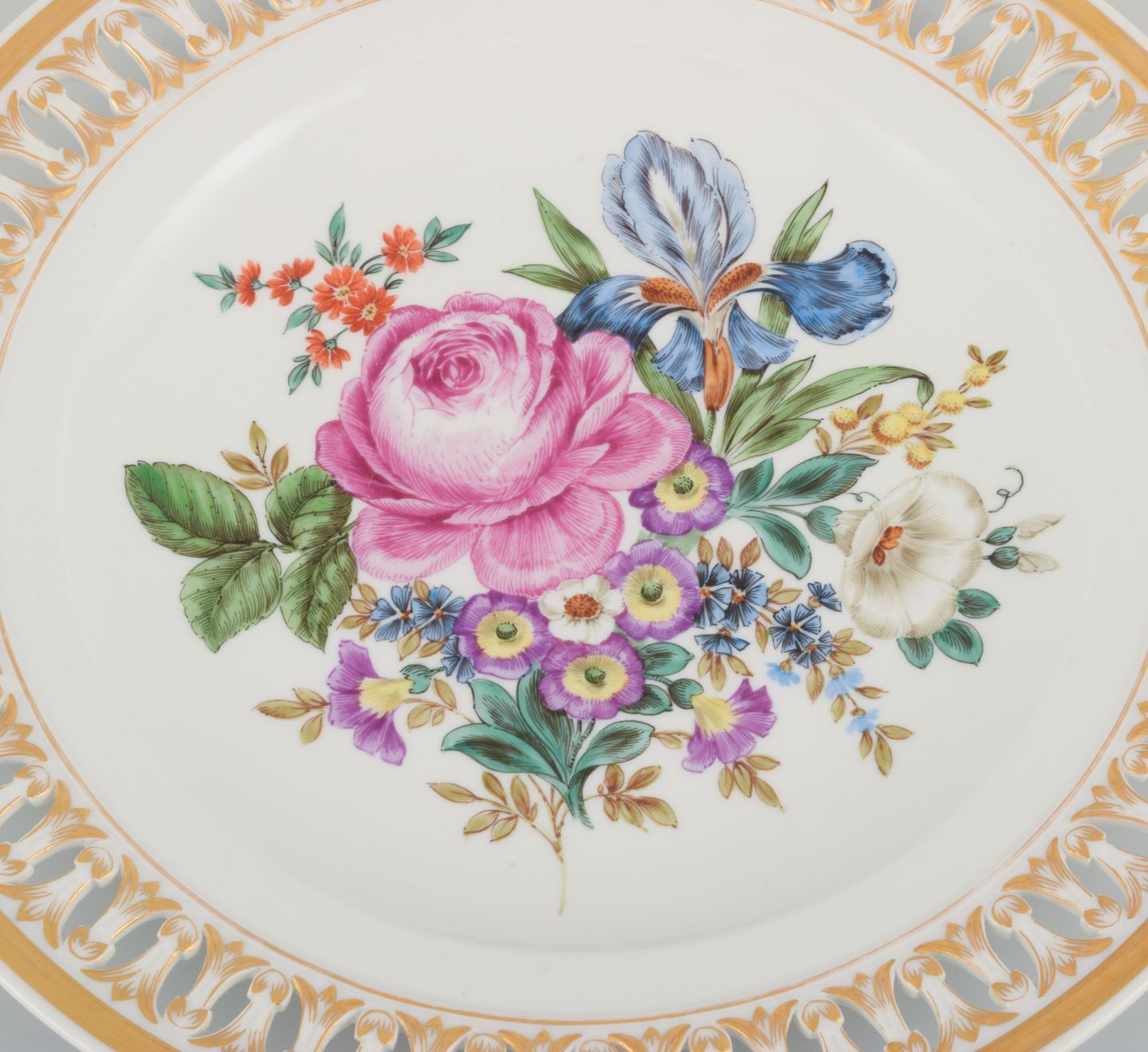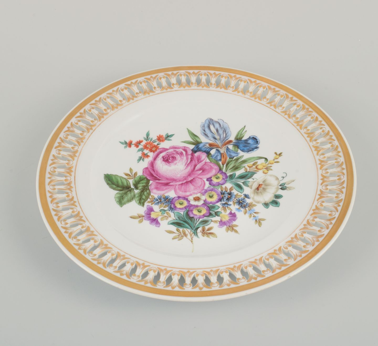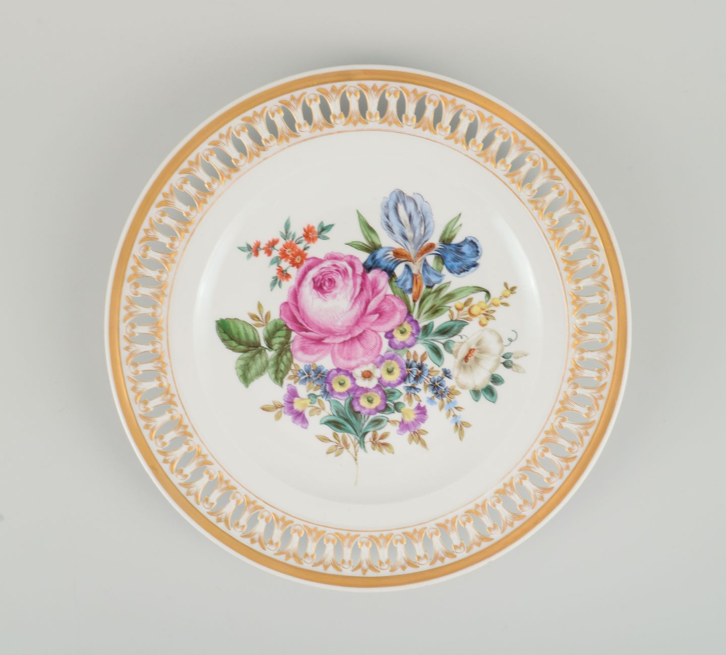 Antik Meissen gennembrudt tallerken i håndmalet porcelæn med blomster og gulddekoration. Sent 1800tallet. Måler: Ø 24,5 X H 3,0 I flot stand. 2. Sortering.