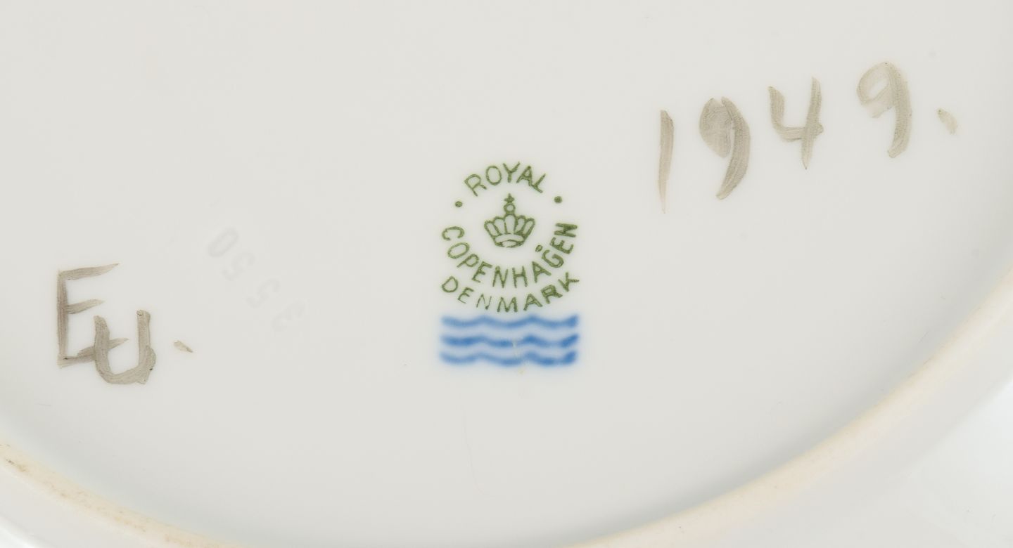 Royal Copenhagen Flora Danica tallerken i håndmalet porcelæn med blomster og gulddekoration. Dateret 1949. D 22,0 cm. x H 3,5 cm. I flot stand. 2. Sortering. Stemplet. Hjemmedekoreret.