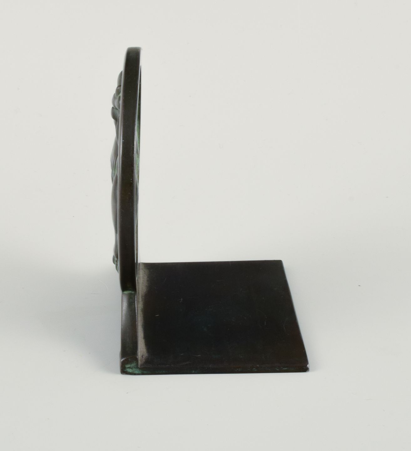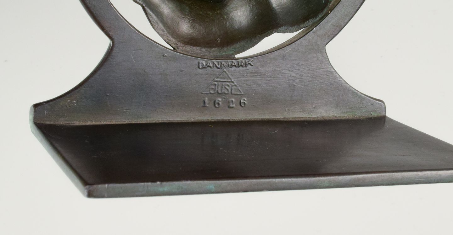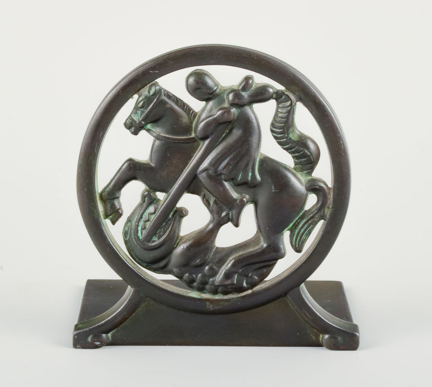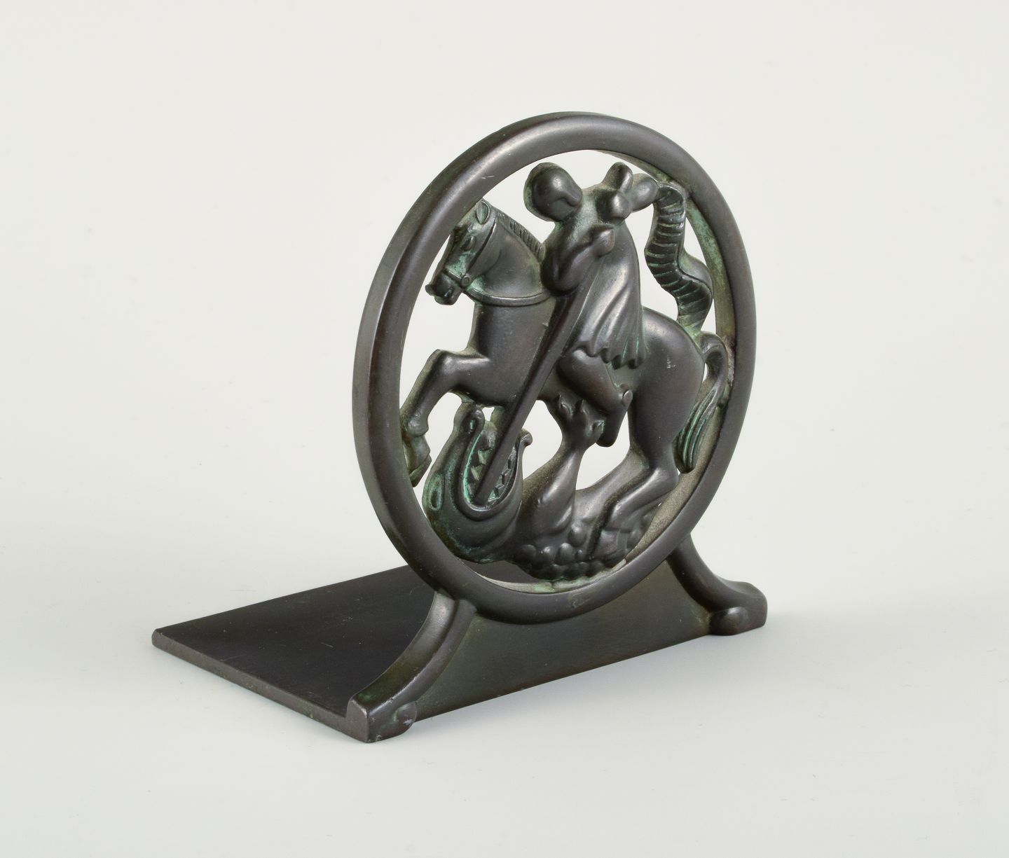 Just Andersen, Danmark. Art deco bogstøtte i diskometal med Sankt Georg og dragen. 1940'erne. Modelnummer 1626. Måler: H 9,5 x D 9,0 x B 6,5 I flot stand. Stemplet.