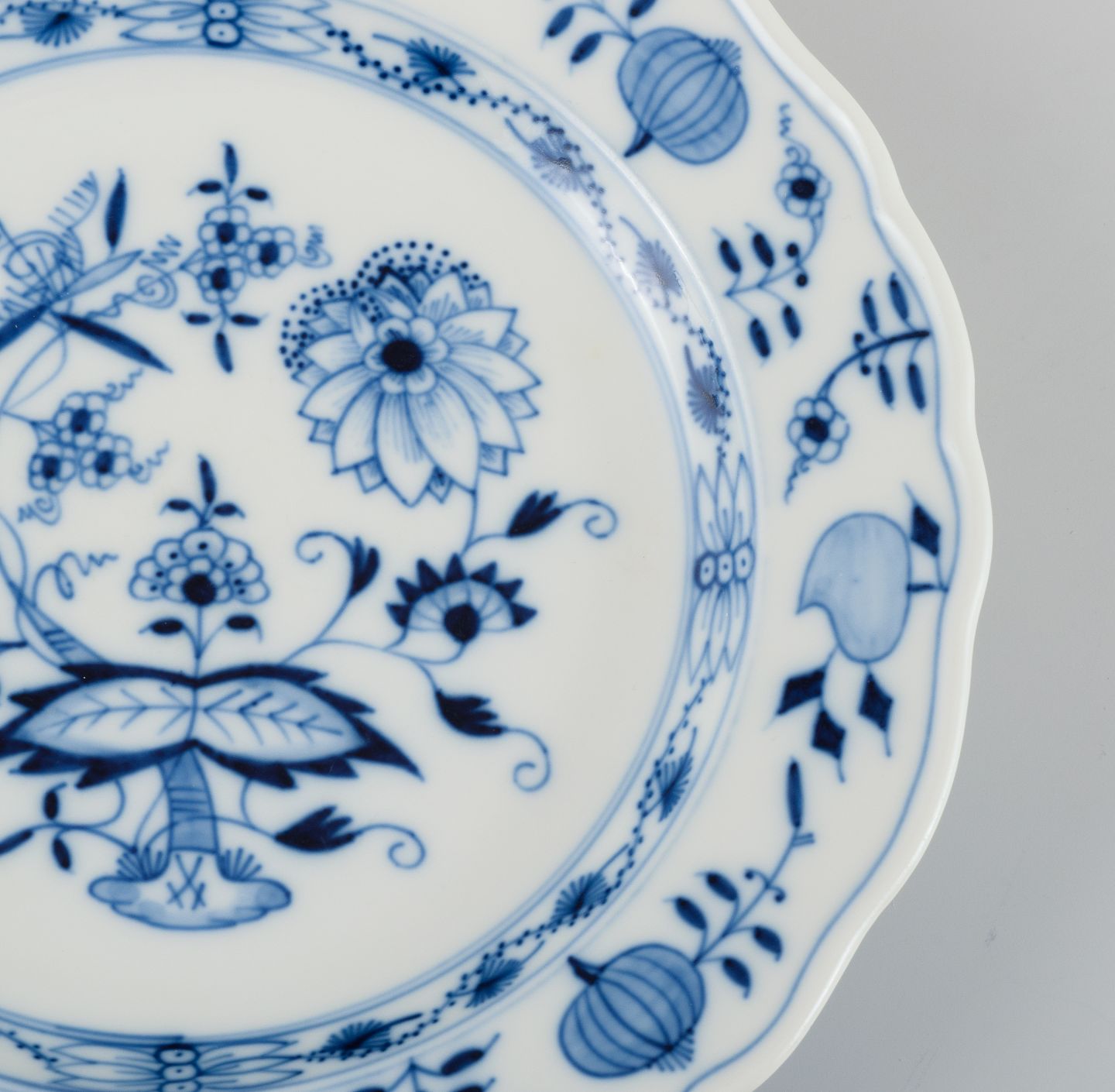 Six small antique Meissen Blue Onion lunch plates in hand-painted porcelain. Early 20th century. Measurements: D 20.0 cm. x H 3.0 cm. Marked. Mixed factory qualities: three pcs. in first factory quality.