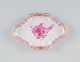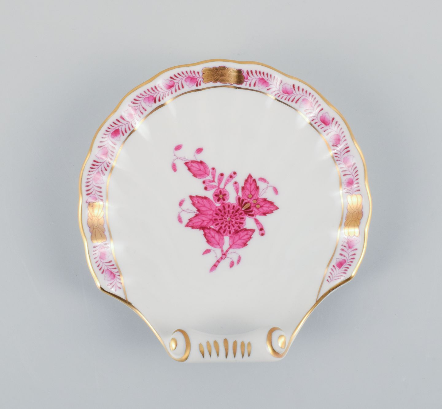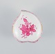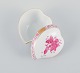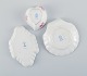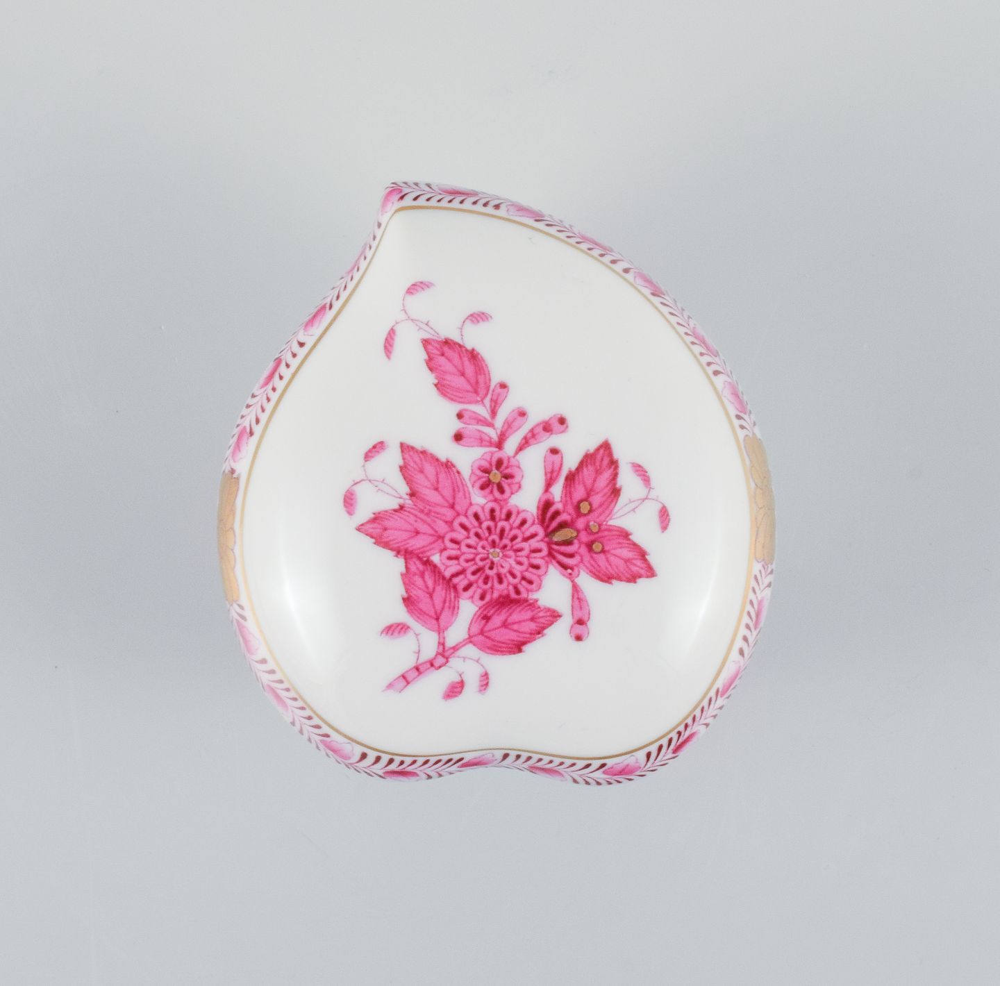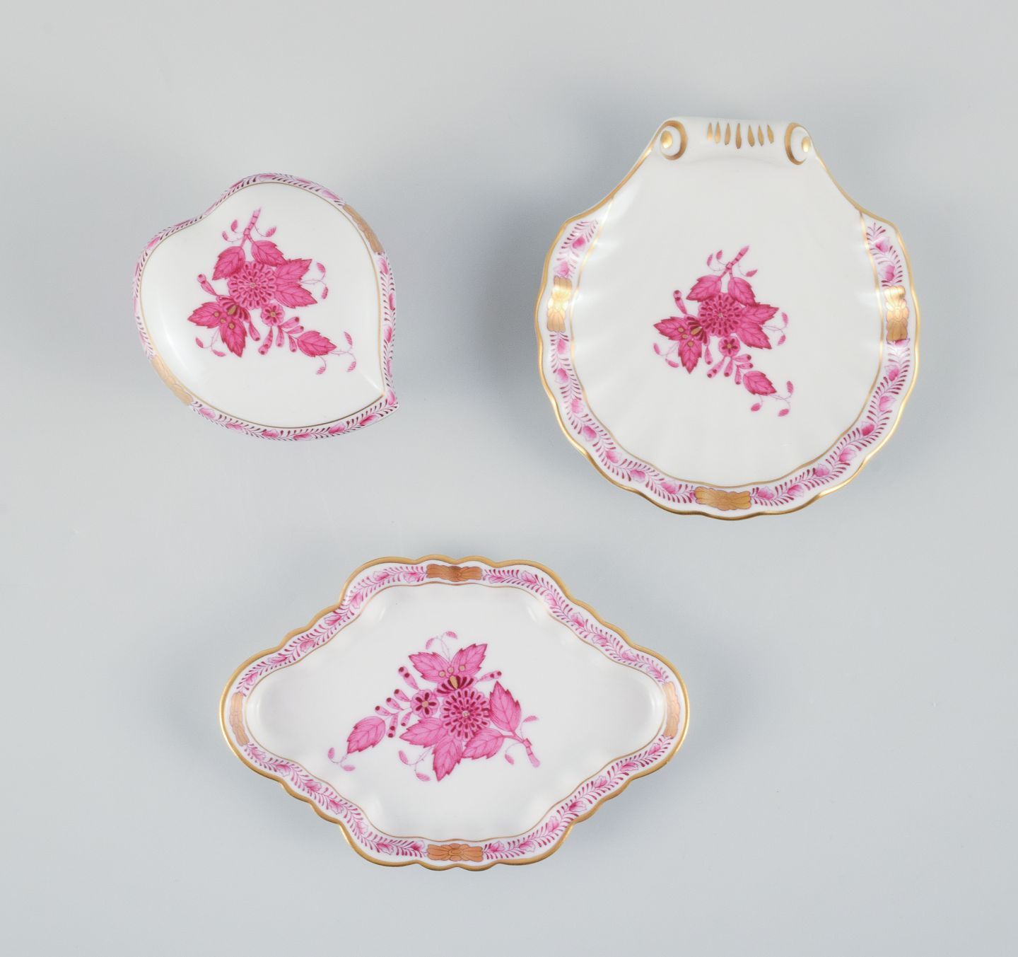 Tre små Herend ”Pink Indian” porcelænsdele med håndmalede lilla blomster og gulddekoration.